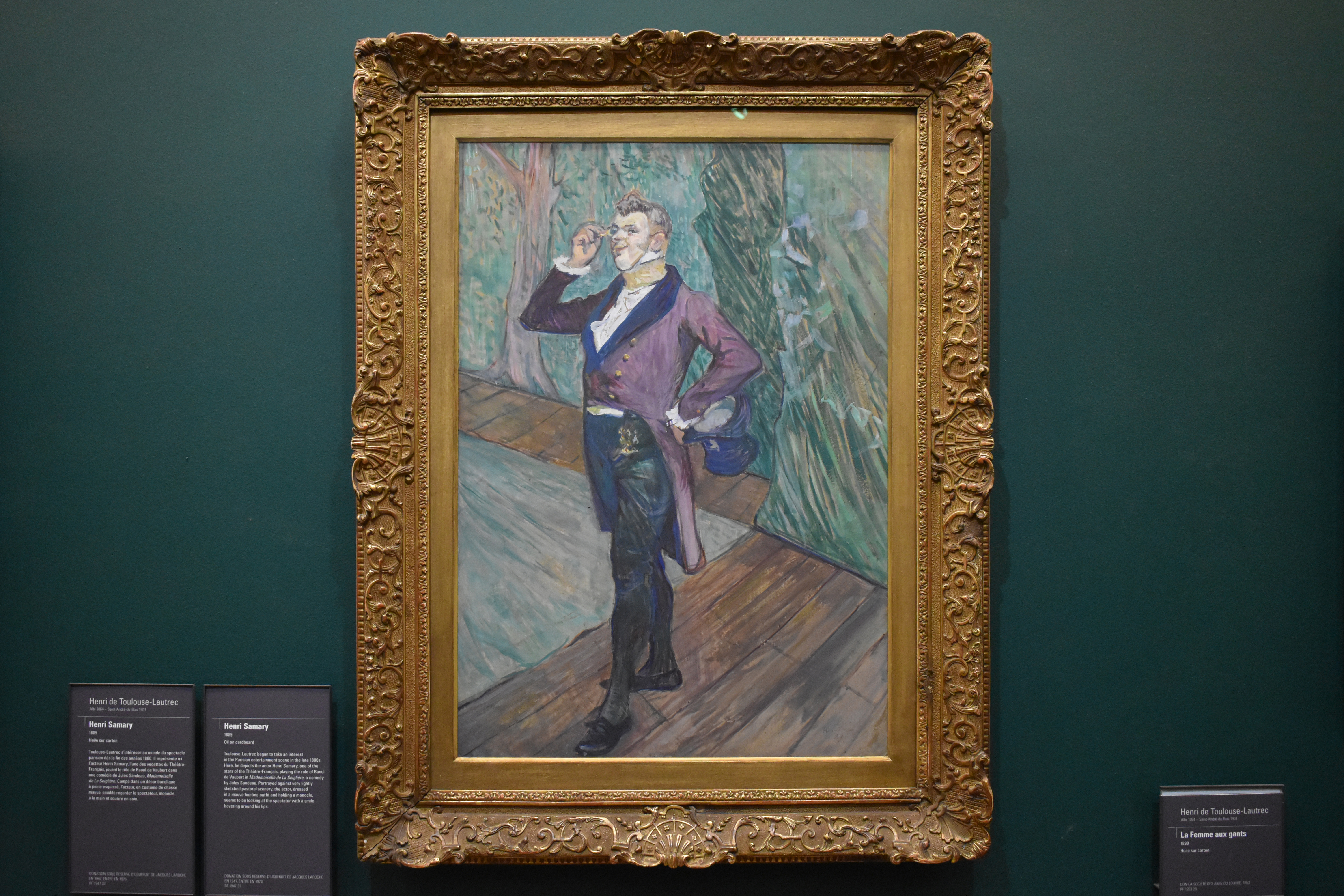 Тулуз-Лотрек начал интересоваться парижской сценой развлечений в конце 1880-х годов. Здесь он изобразил актера Анри Самари, одну из звезд Театра Франсе, исполняющего роль Рауля де Вобера в комедии Жюля Сандо "Мадемуазель де Ла Сейгьер". Представленный на фоне очень легкого пасторального пейзажа, актер, одетый в сиреневый охотничий костюм и держащий монокль, кажется, смотрит на зрителя с улыбкой, витающей на его губах.