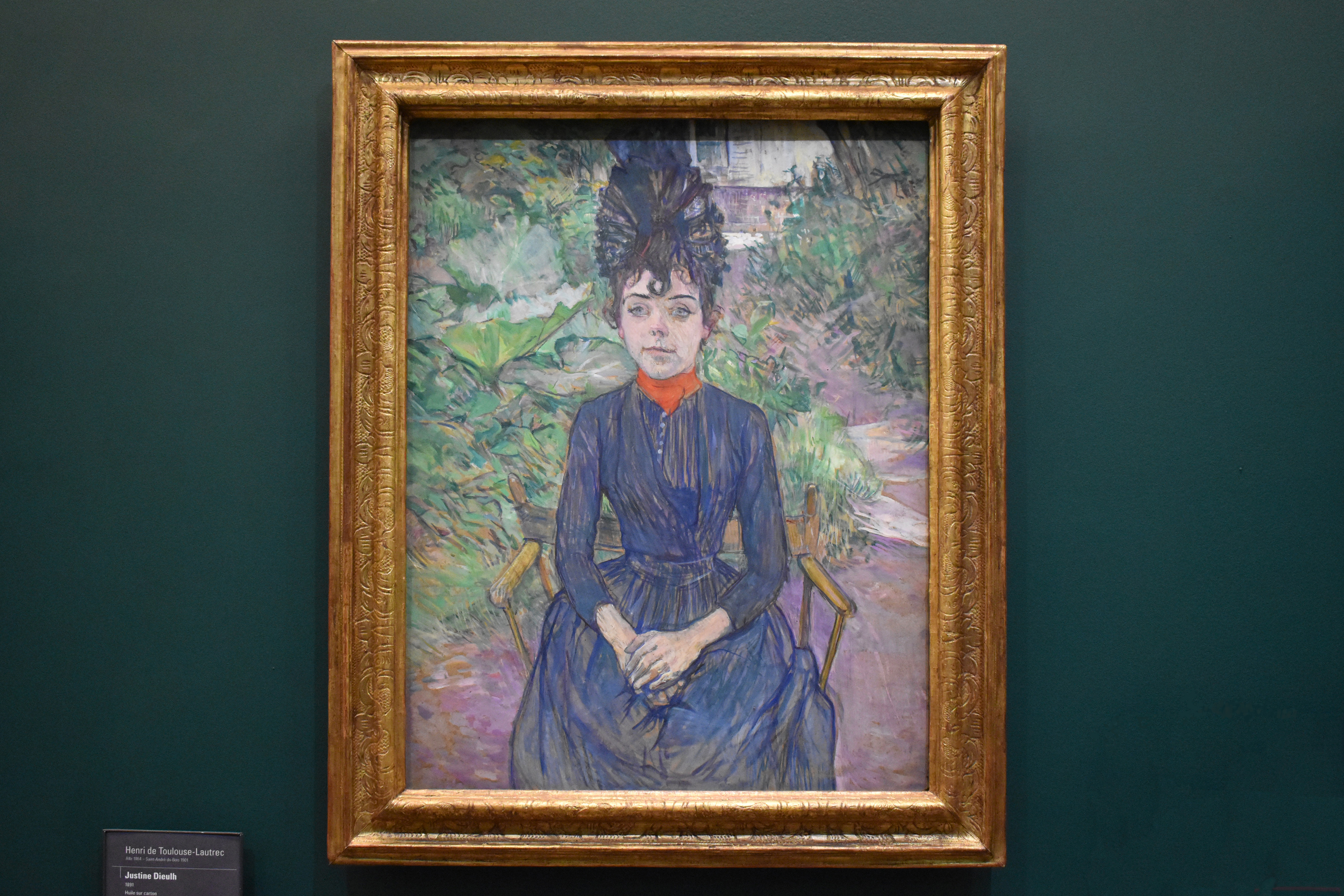 Палитра, использованная в этой картине, типична для портретов, которые Лотрек писал в саду пьера Фореста – участке земли, используемом для стрельбы из лука на углу бульвара Клиши и улицы Коленкур. Спутанные растения и деревья, кажется, изолируют персонажей в почти нейтральном пространстве. Лотрек использует свой обычный синий цвет с фиолетовым оттенком для платья и шляпки. Ярко-красный шейный платок модели подчеркивает зелень на заднем плане благодаря взаимодействию дополнительных цветов. Сидящая лицом к художнику в центре картины Жюстин Дьель излучает поразительное присутствие. Она внушительно сидит на довольно неустойчивом складном стуле. Ее несколько скованная поза немного неловка, и широкие, неуклюжие руки подтверждают это впечатление. При взгляде сверху ее тело просто очерчено. Широкие синие линии, описывающие ее платье, придают ему выразительность; только форма ее коленей обозначена более четкими, мягко закругленными линиями. Ее сложная прическа настолько высока, что едва вписывается в картину. Большинство женщин, нарисованных Лотреком в этом саду, – профессиональные модели или проститутки – были известны только по именам: Берта, Габриэль и т.д. Хотя мы знаем фамилию Жюстин, никаких подробностей о ее жизни не сохранилось. Это единственный портрет, в котором Лотрек стремится передать психологический склад характера героини. Это достигается в мягкой и типично юмористической манере.