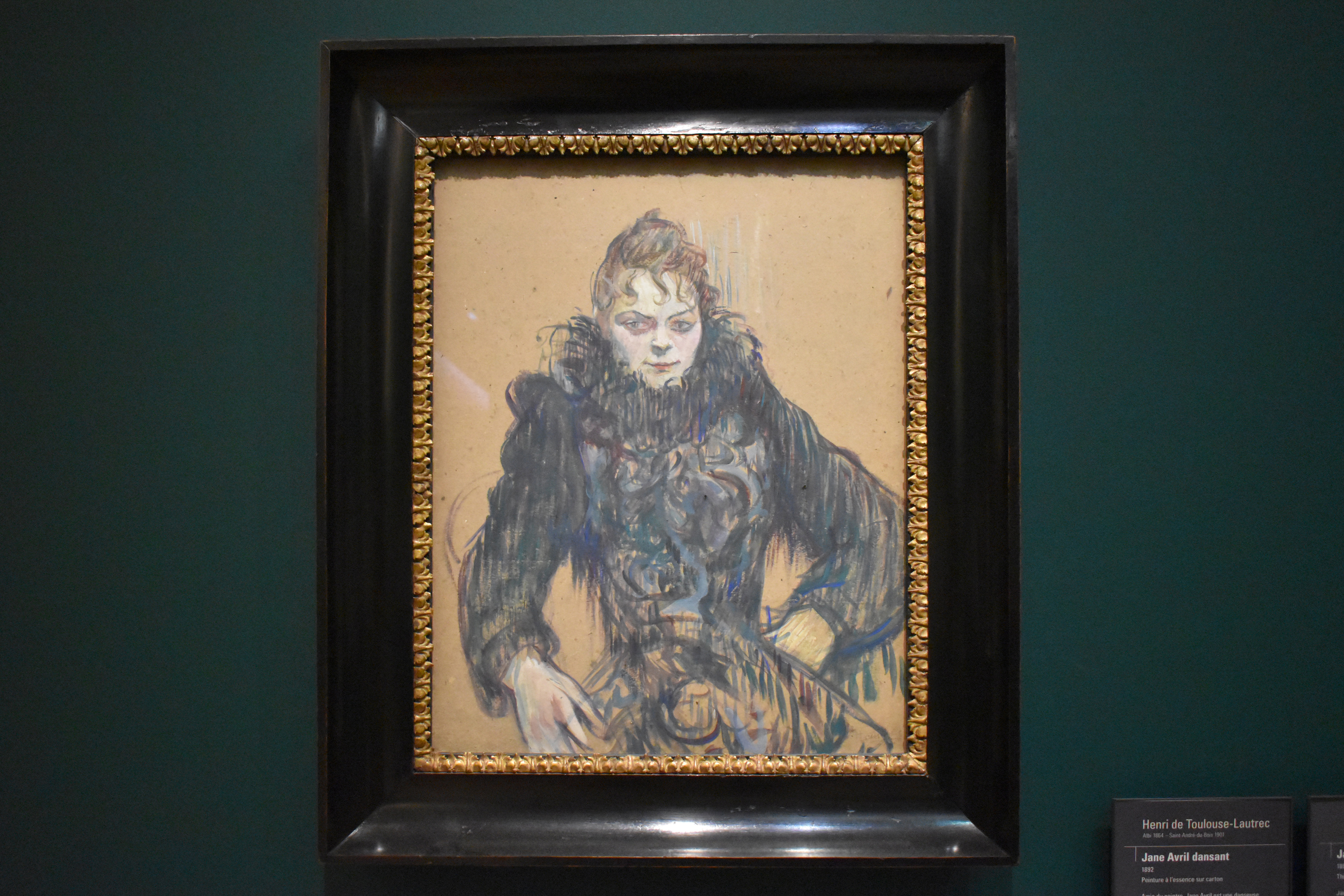 Джейн Авриль, подруга художника, танцевала канкан и прославилась в кабаре "Мулен Руж". Тулуз-Лотрека привлек ее необычный облик: хрупкий, но энергичный силуэт, а также выделение, которое было заметно даже в диком и необузданном танце, когда она поднимала юбки, чтобы показать движения ног. С большой экономией стиля он пишет движения танцовщицы широкими мазками и набрасывает несколько элементов пространства представления. Текучесть разбавленной масляной краски подчеркивает динамизм фигуры, выделяющейся на фоне, сквозь который видна картонная опора.