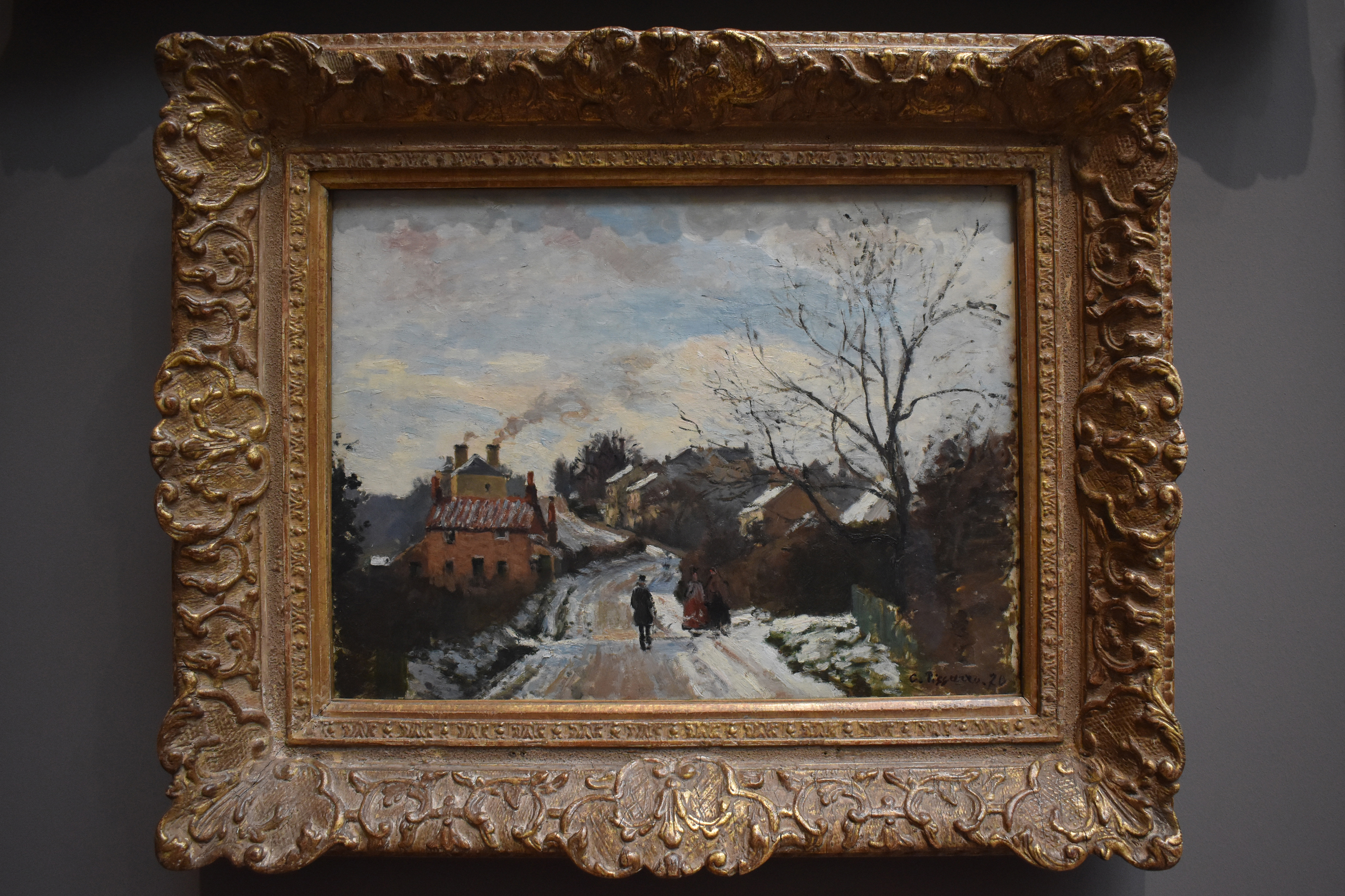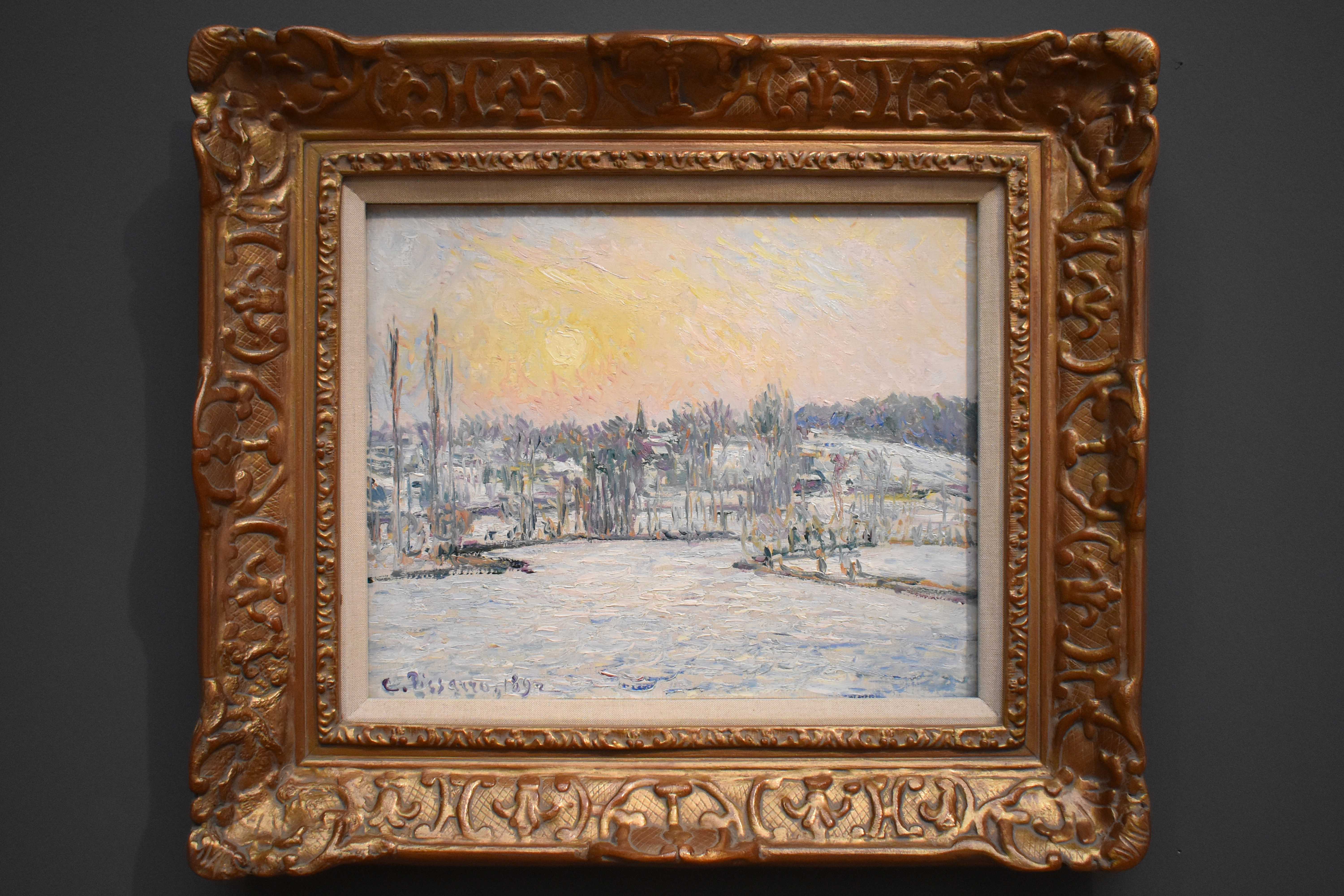 Писсарро писал этот вид снова и снова, в любое время дня и в любое время года. Небо и заснеженная земля написаны одинаковой импастой, хотя температура красок варьируется. И облака, освещенные солнцем, и фиолетовые деревья производят общее теплое впечатление.