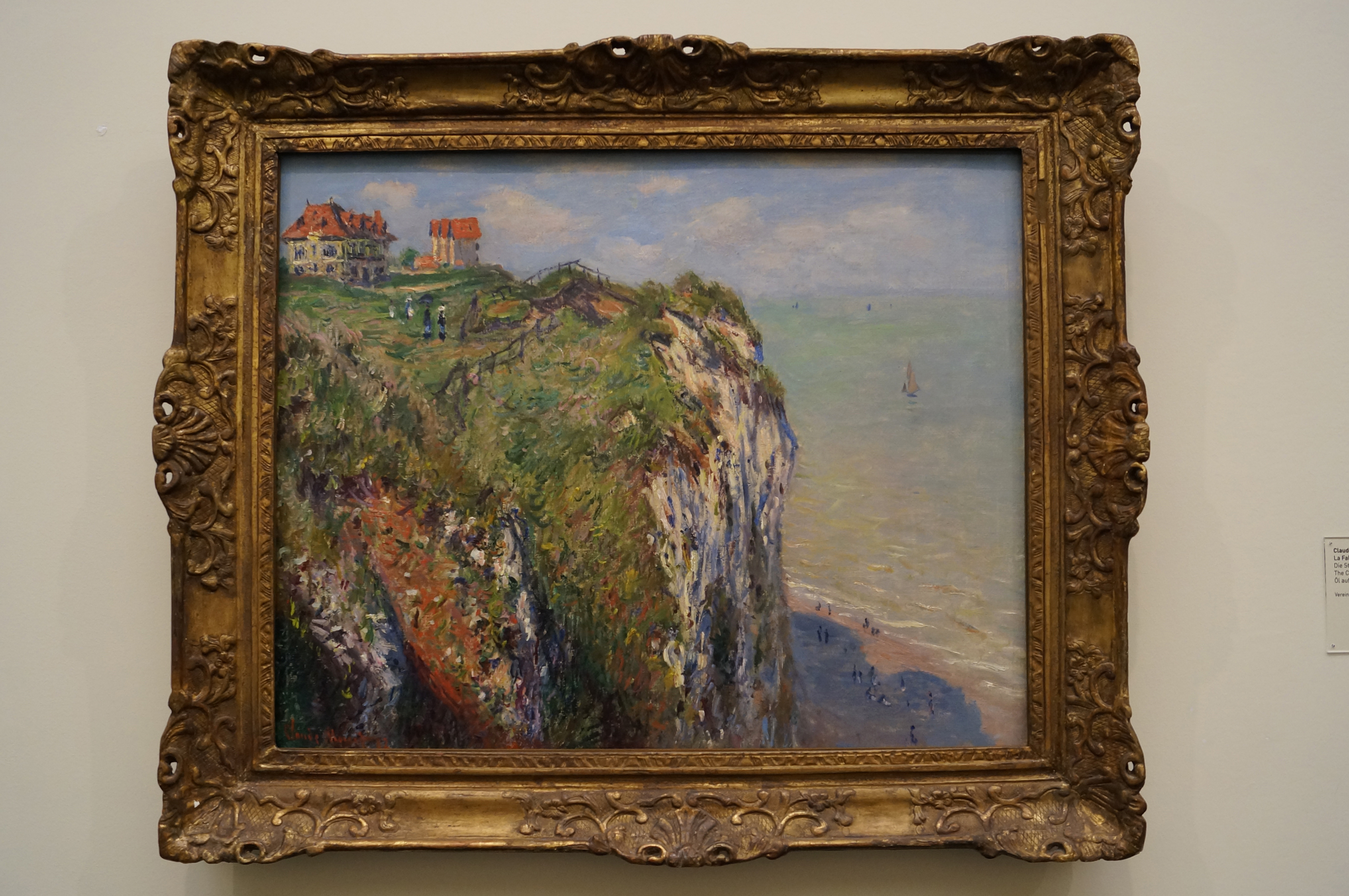 Моне писал не только туристические места, такие как Порт д'Аваль. Здесь он выбрал маргинальный мотив и сделал его эффектным с помощью перспективы. Как на фотографии, травянистый край скалы находится в резком фокусе, в то время как поверхность моря, небо и скалы залива вдали размыты.