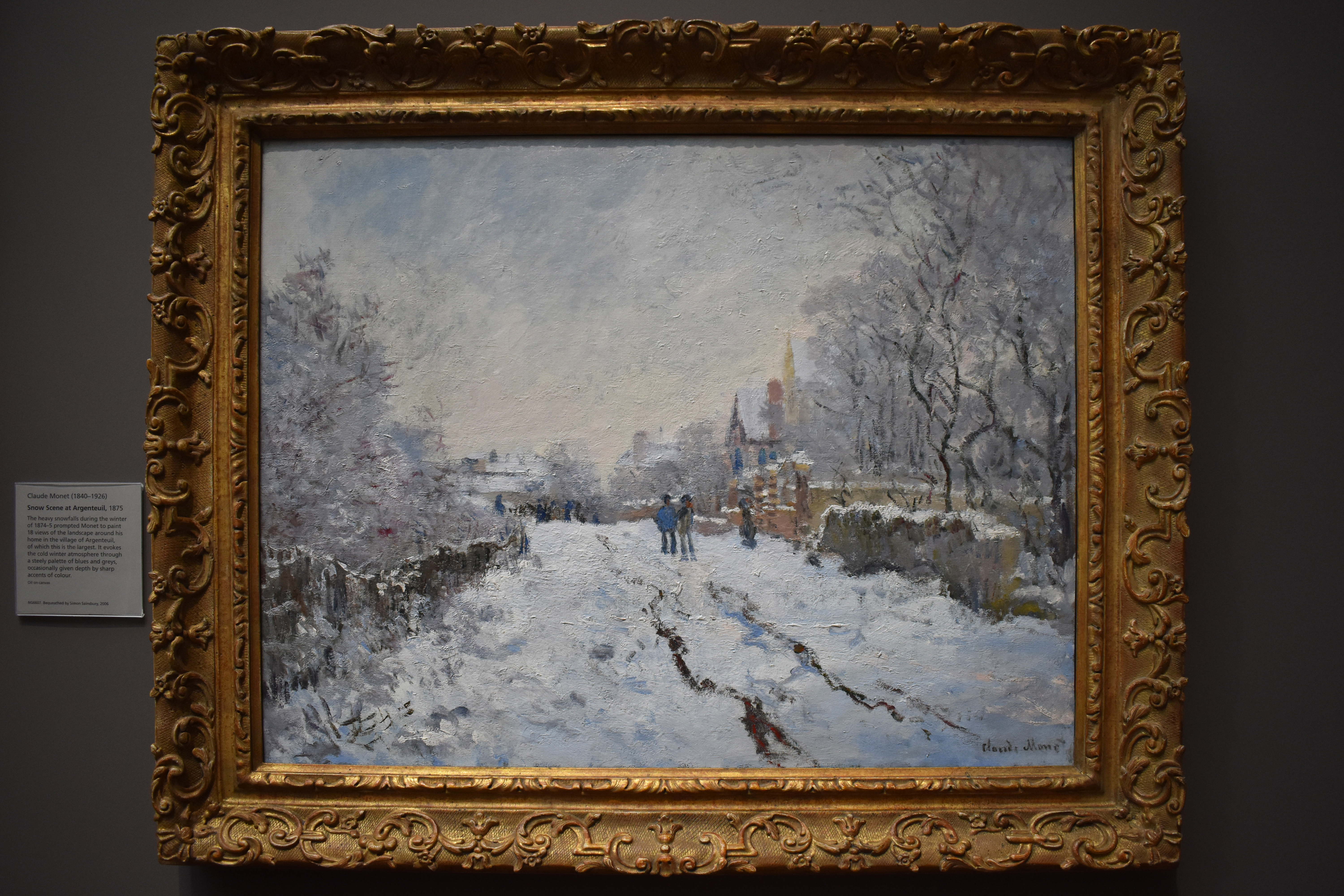 Люди гуляют в лучах полуденного солнца по открытому заснеженному полю рядом с домом Моне в Аржантейе. Художник запечатлел этот светлый момент и обилие света, расположив желтый на синем, оранжевый на фиолетовом.