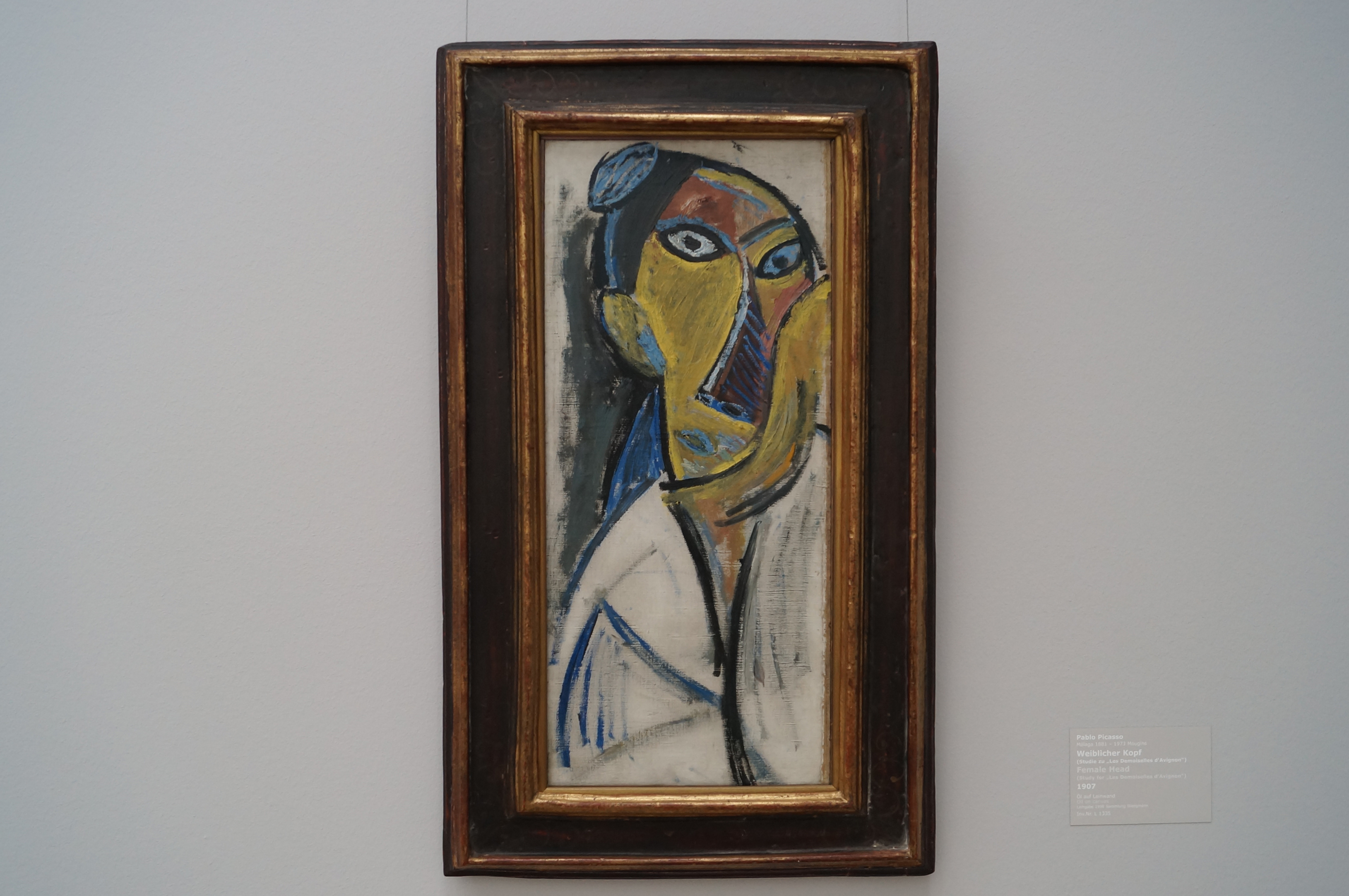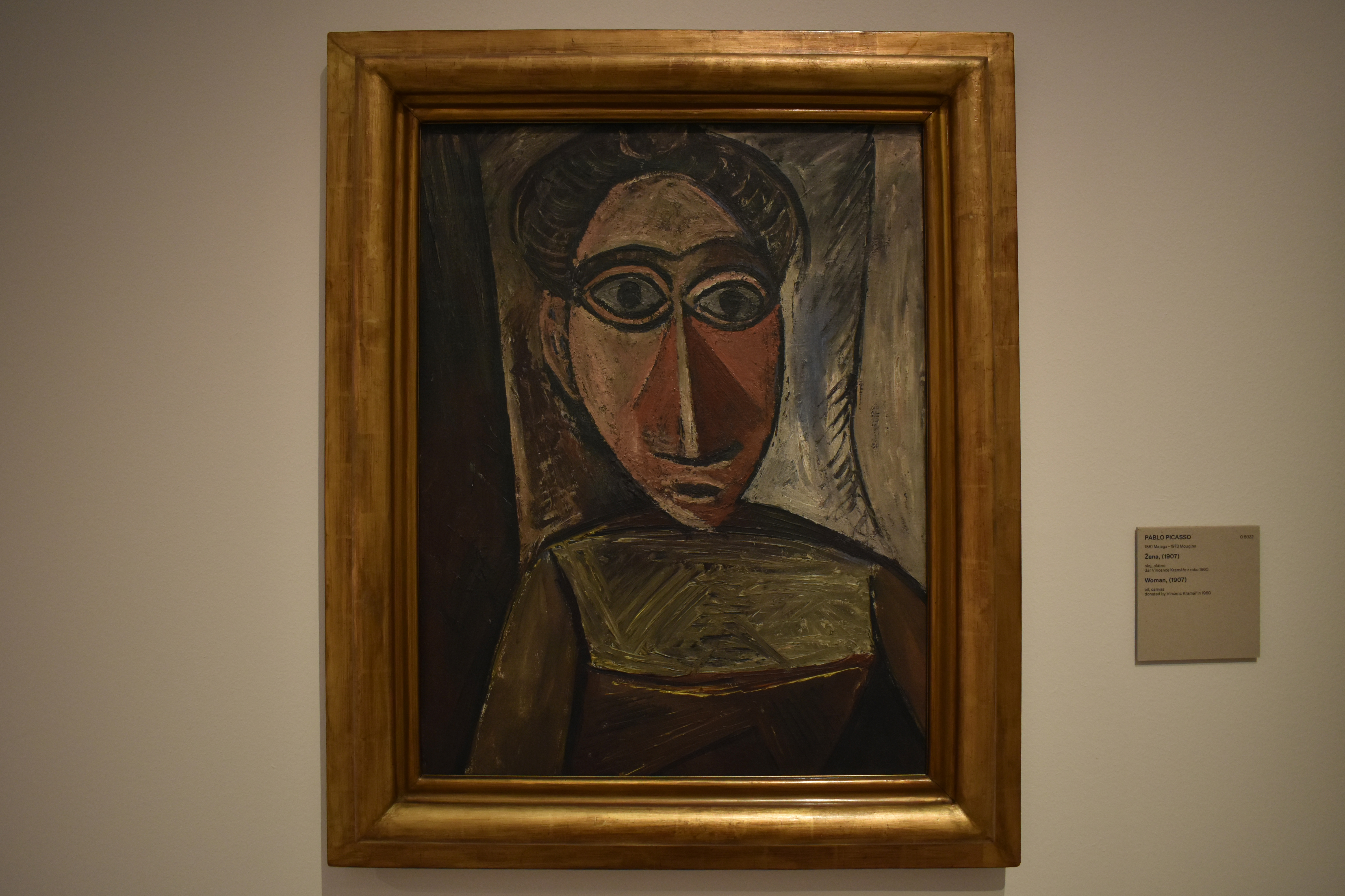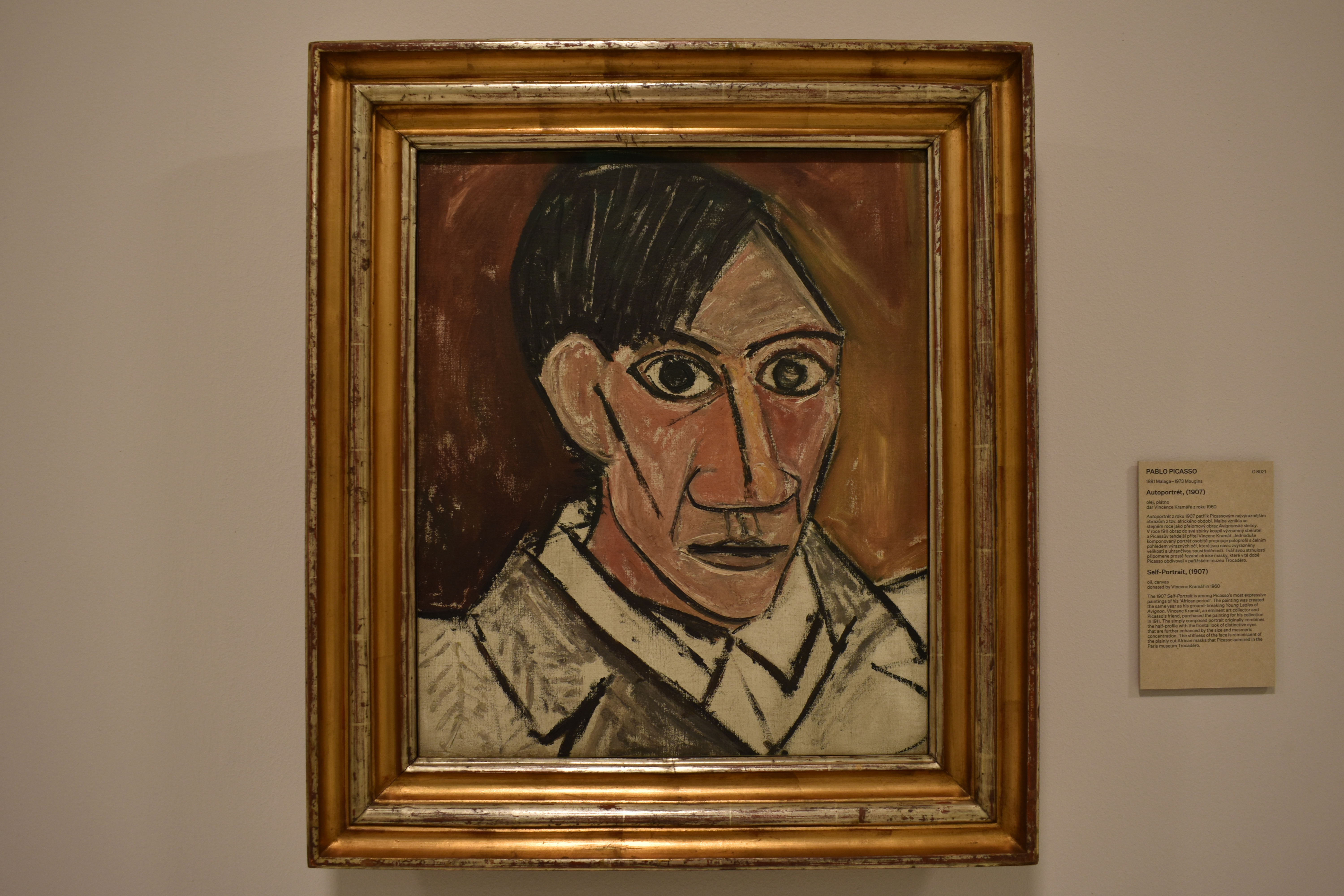 Автопортрет 1907 года – одна из самых выразительных картин Пикассо его "африканского периода". Картина была создана в том же году, что и его новаторская картина "Авиньонские барышни". Винсенк Крамер (Vincenc Kramér), выдающийся коллекционер произведений искусства и друг Пикассо, приобрел картину для своей коллекции в 1911 году. Простой портрет изначально сочетает в себе полупрофиль с фронтальным взглядом характерных глаз, которые еще больше усиливаются размером и гипнотизирующей концентрацией. Скованность лица напоминает просто скроенные африканские маски, которыми Пикассо восхищался в парижском музее Трокадеро.