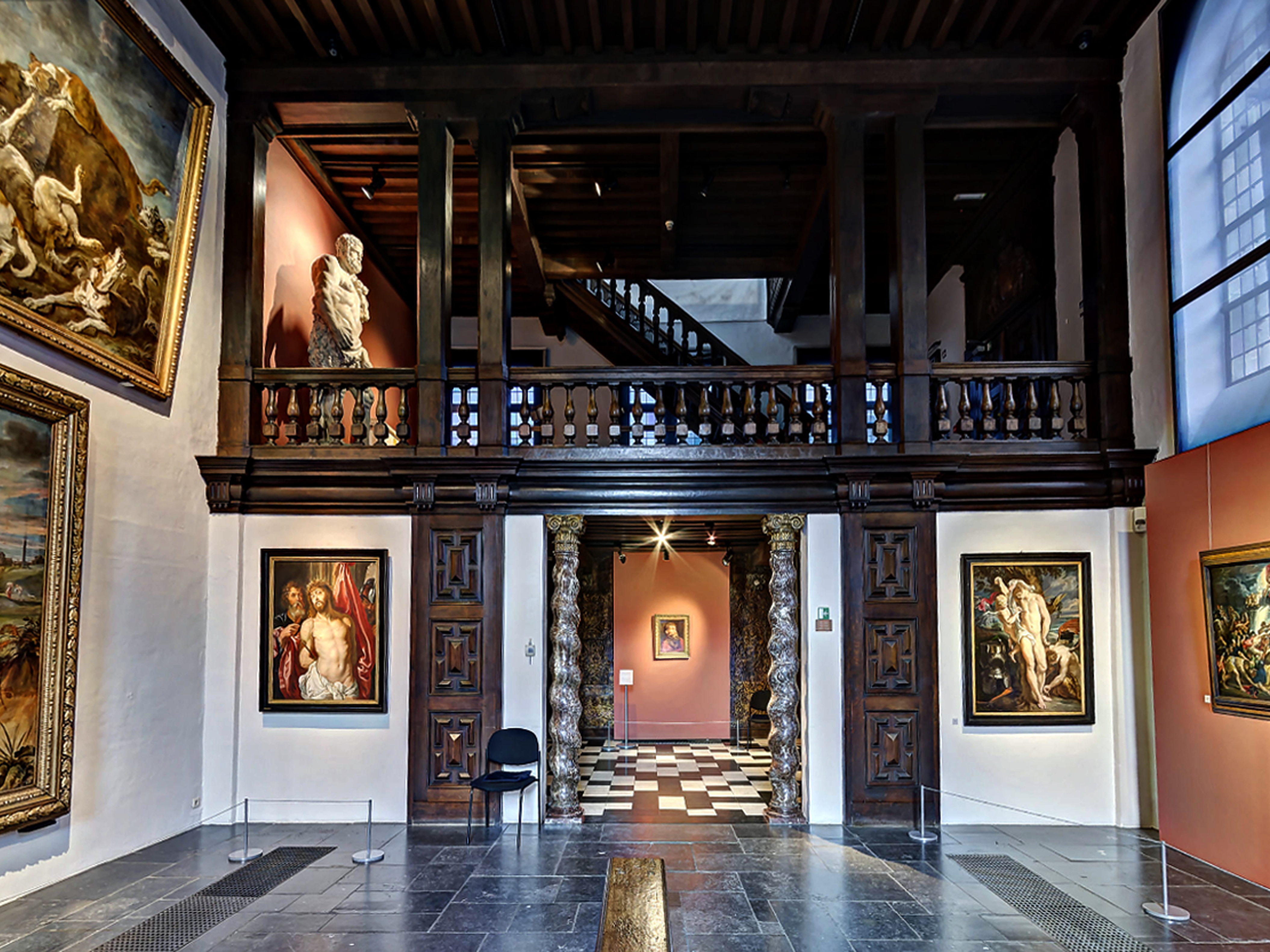 Небольшая галерея соединяет жилые комнаты с мастерской, высота которой занимает два этажа. Большие окна на уровне второго этажа заливают светом все помещения. Напротив входной двери пробита высокая, узкая дверь, через которую выносили готовые полотна. На стенах висят картины. Несколько из них принадлежат кисти Рубенса – "Благовещение", "Адам и Ева", "Святой Себастьян", "Обращение святого Павла", "Генрих IV в битве при Иври", "Святая Клара Ассизская" и другие.
