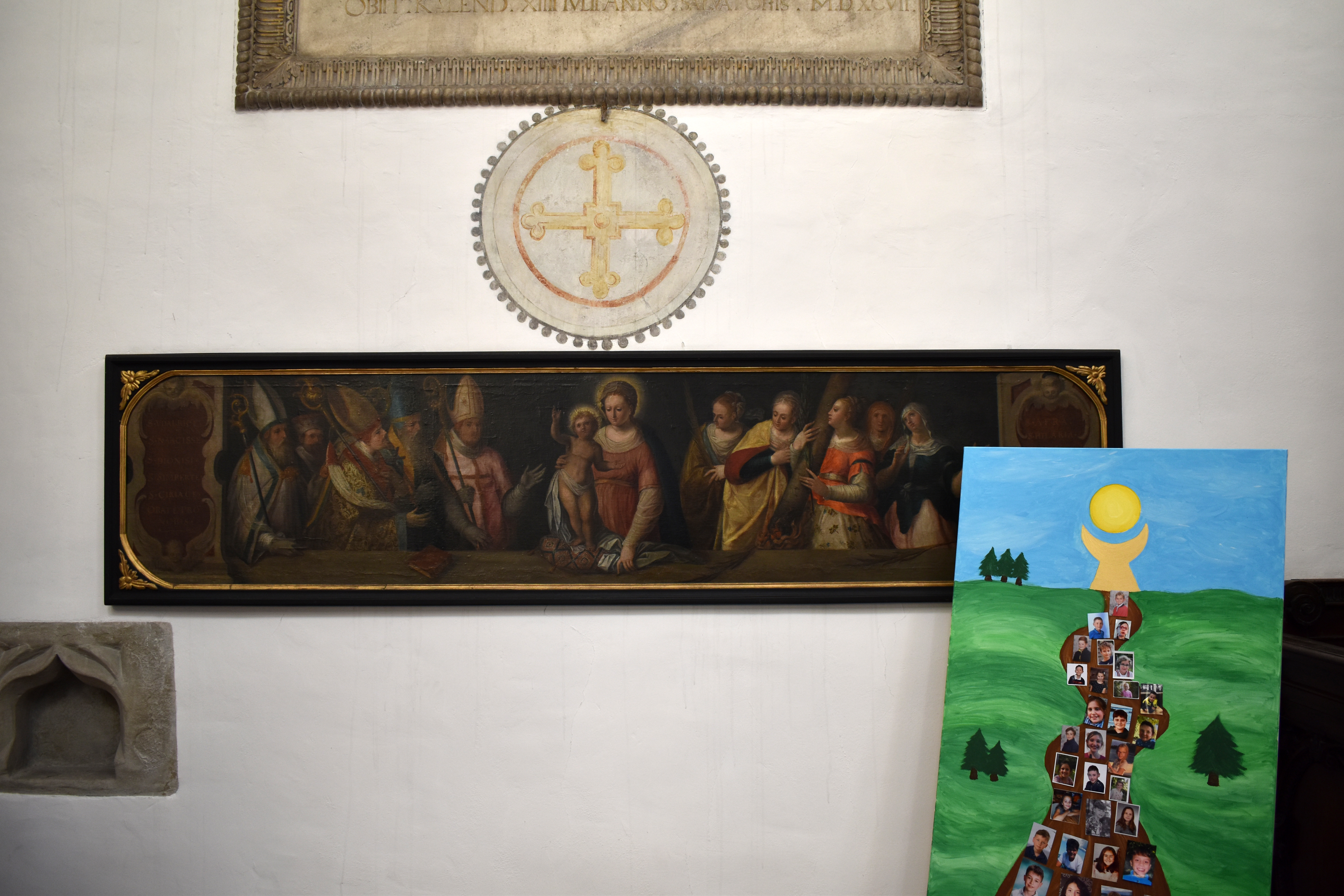 Сцена в Пределе показывает больного епископа, к которому, согласно легенде, явились два ангела с чашей и крестом, чтобы помочь провести службу.
