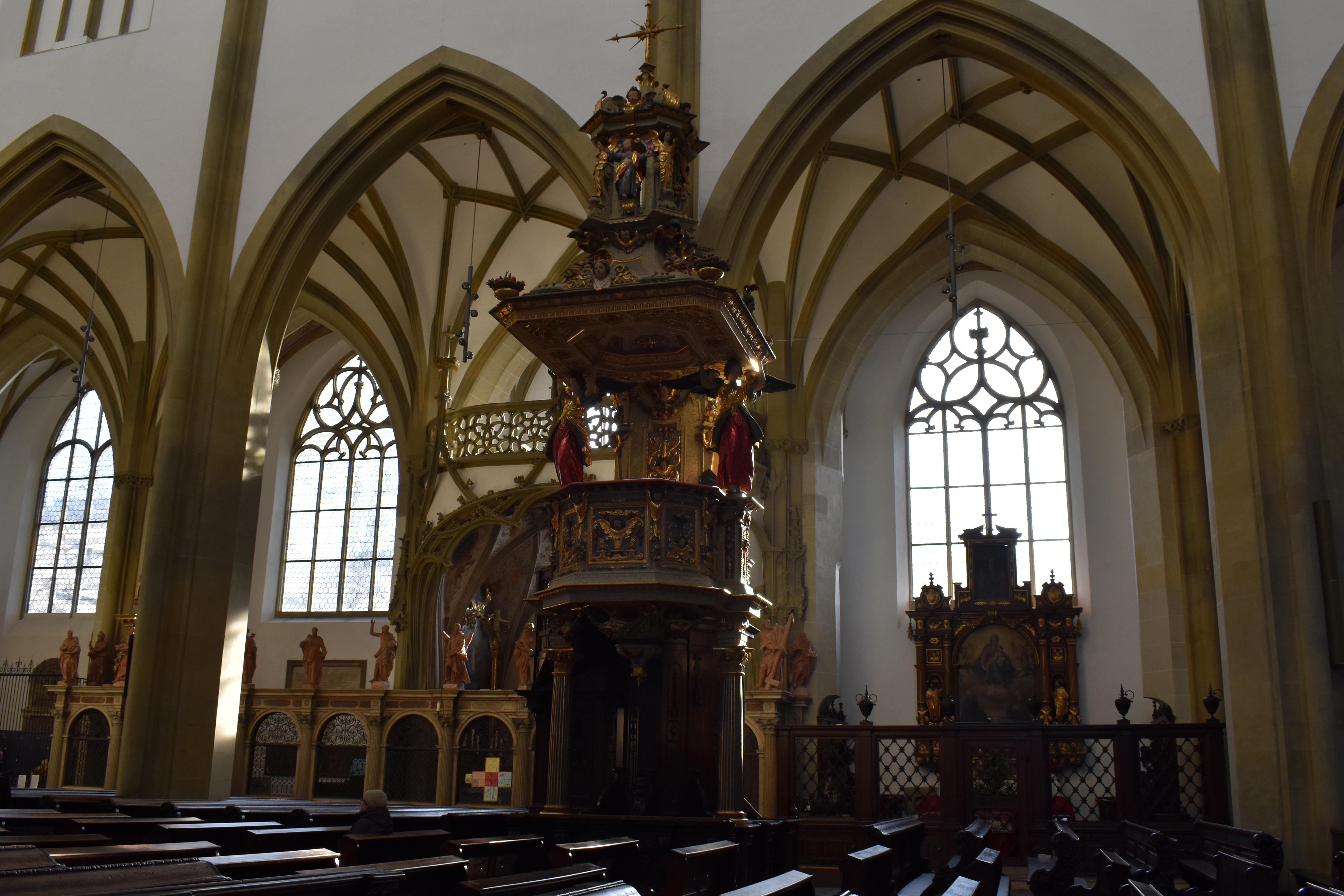 В центре нефа, с правой стороны, возвышается монументальная кафедра работы Ханса Деглера (нем. Hans Deglers), которая была создана в 1608 году, вероятно, по проекту Ханса Крампера (нем. Hans Krumper). Полигональная корзина доступна через витую деревянную лестницу. Наверху изображён обращающийся с проповедью Младенец Христос в окружении двух хангелов в ярких одеждах. Венчает кафедру крест.