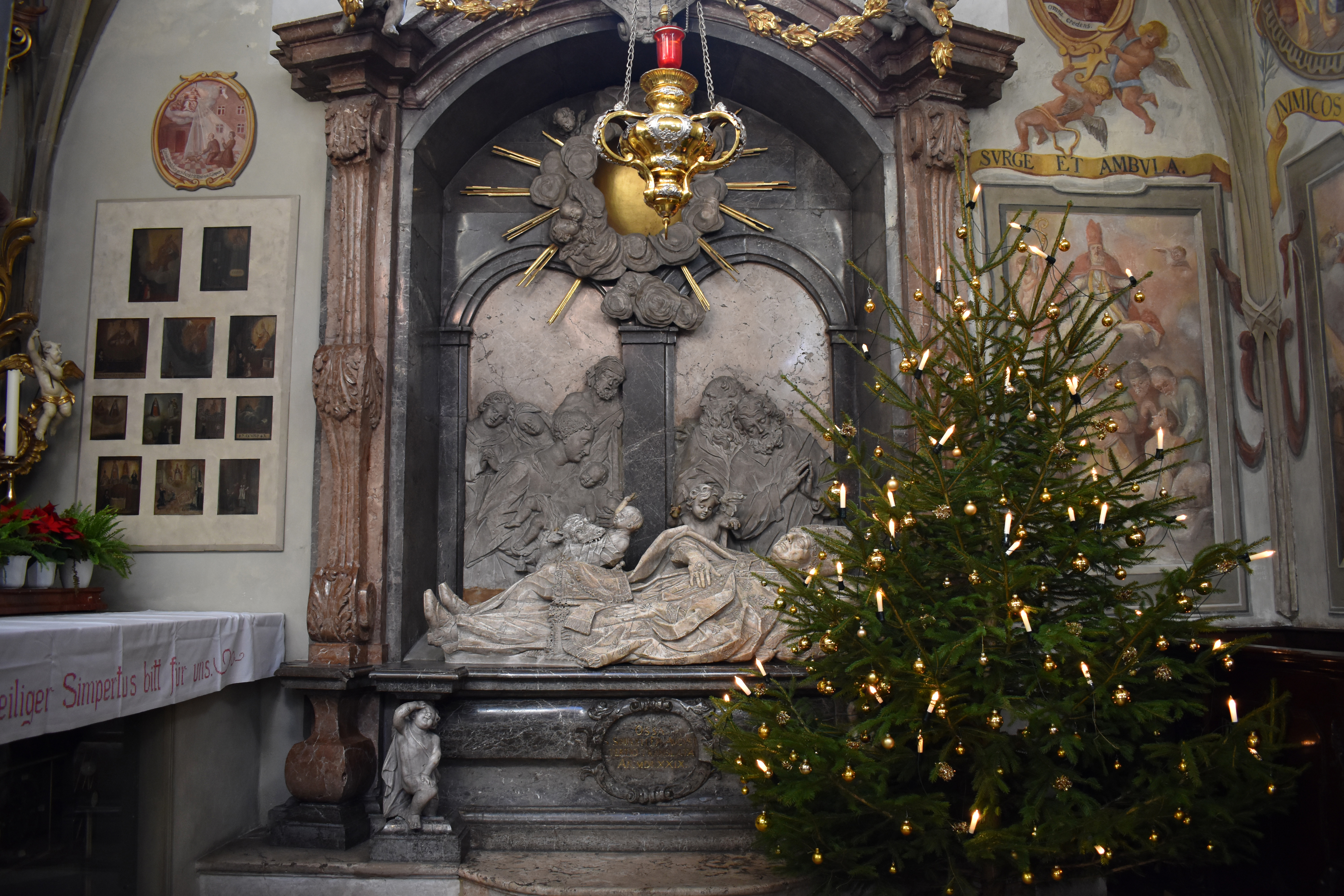 Эпитафия Маркуса Фуггера на стене у окна, надпись на гербе 1581 года на полу, лилии Фуггера в аркадном барьере в стиле ренессанс и замковый сводный камень на потолке капеллы с гербом Фуггера напоминают о семье.
