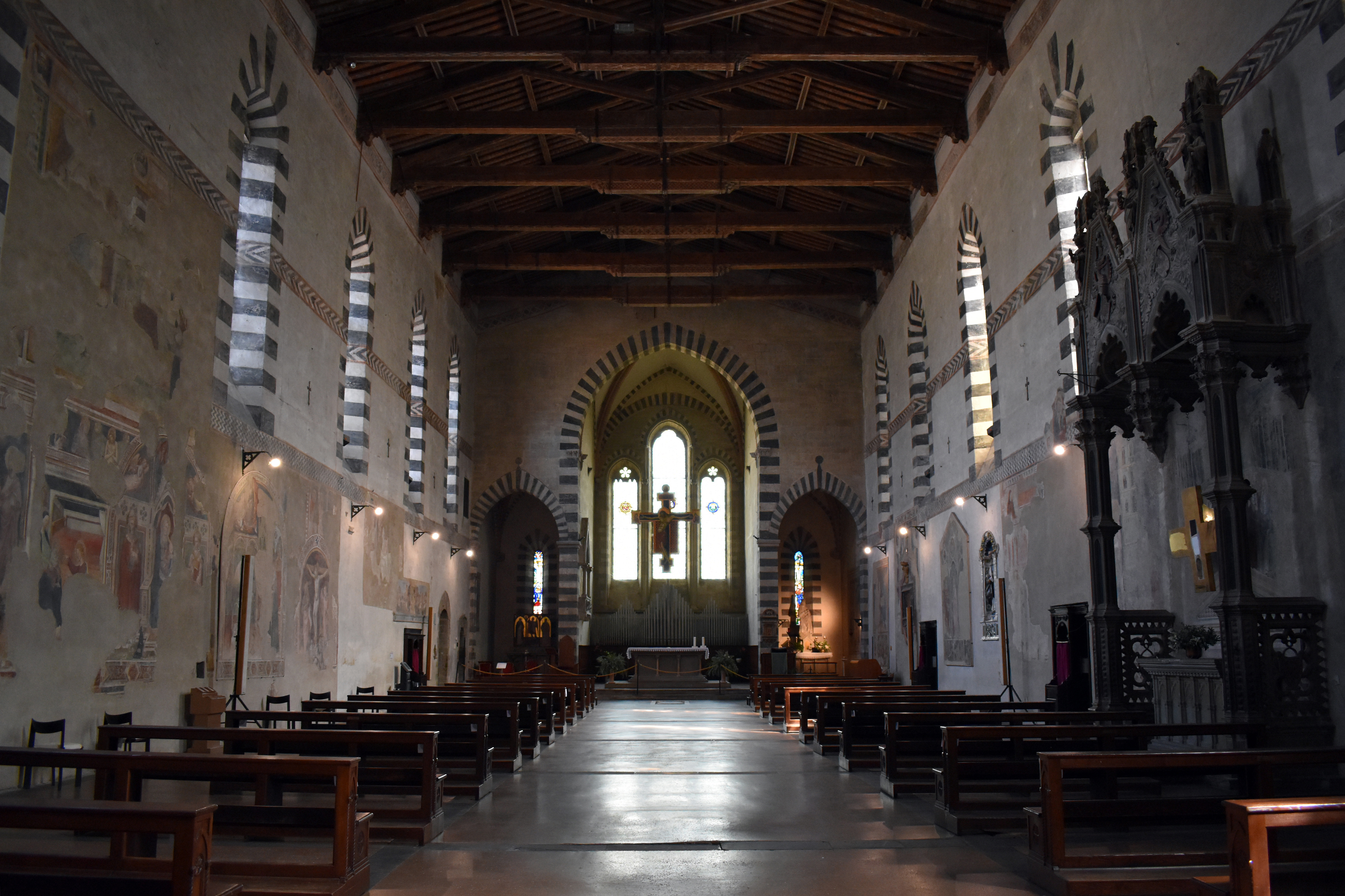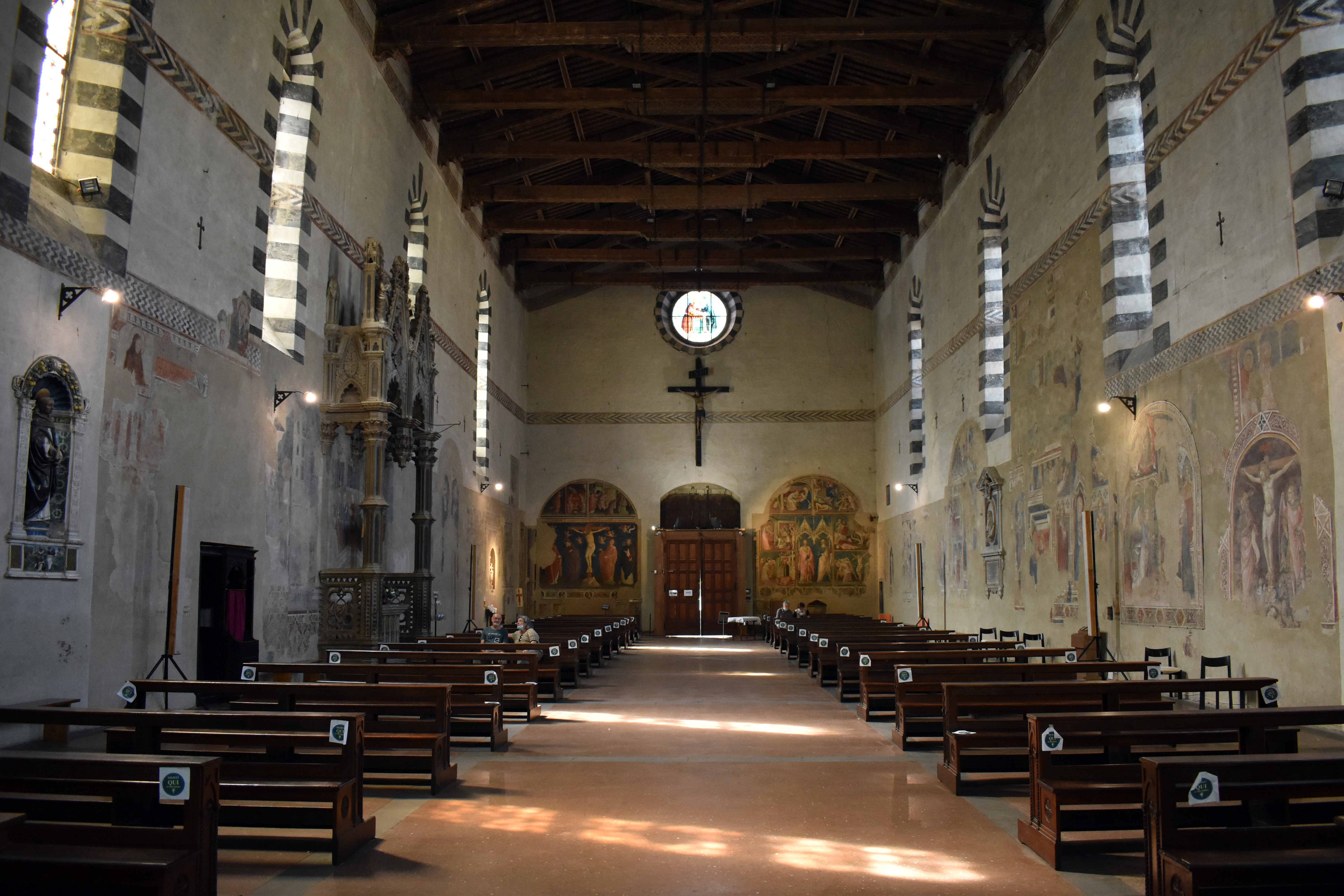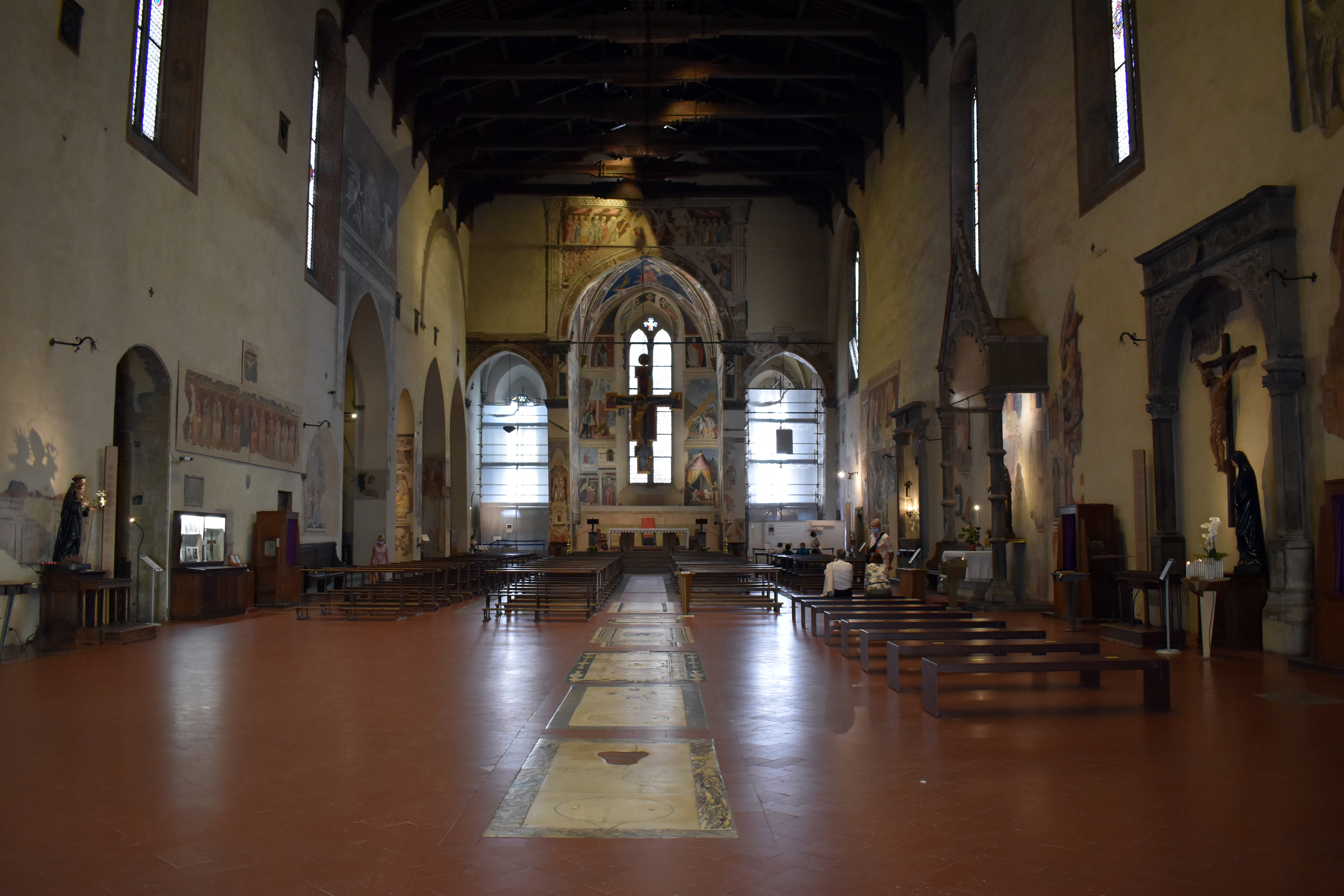 Внутри базилики имеется один большой неф с поддерживаемой стропилами крышей. В четырнадцатом и пятнадцатом веках внутренние стены этого священного здания были настоящим "залом рисования" для многих художников того периода из Ареццо и не только. Сегодня многие фрески частично утеряны, фрагменты других сохранились, некоторые остались нетронутыми. Шесть окон на каждой стене, которые освещают церковь, сделаны в виде готических арок трех с чёрными и белыми элементами, которые относятся к одежде Доминиканцев. В течение шестнадцатого и семнадцатого веков церковь претерпела значительные изменения внутри: стены побелили, покрыв драгоценные фрески, построили алтарии. После запрещения Наполеоном религиозных общин, доминиканцы покинули Ареццо и церковь начала быстро разрушаться. В первые десятилетия двадцатого века, с возвращением монахов в город, восстановление церкви началось с ликвидации добавленных алтарей и удаления побелки, покрывающей картины. Работы, которые также имели место в последующие десятилетия, сегодня позволяют наслаждаться этим сокровищем искусства.