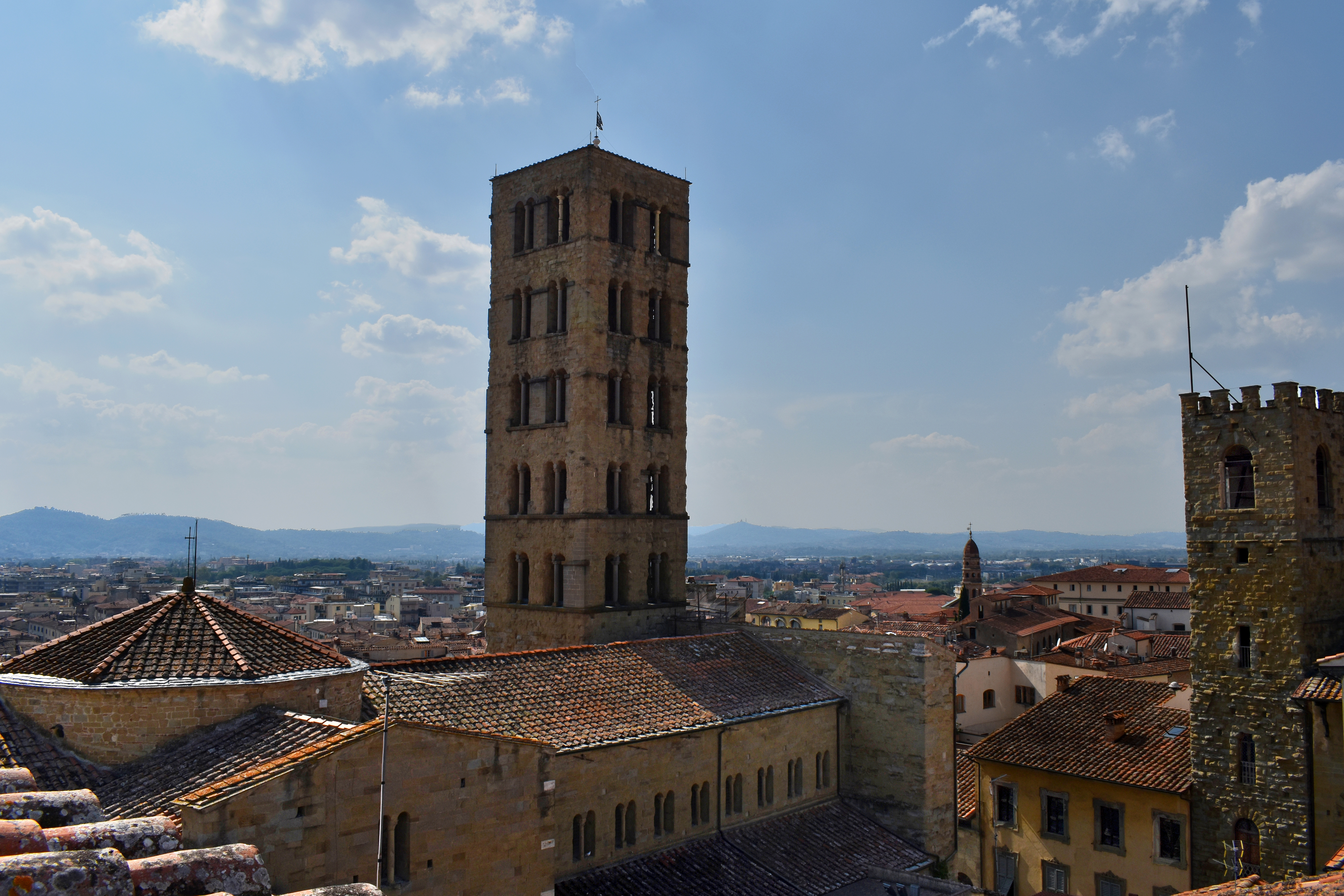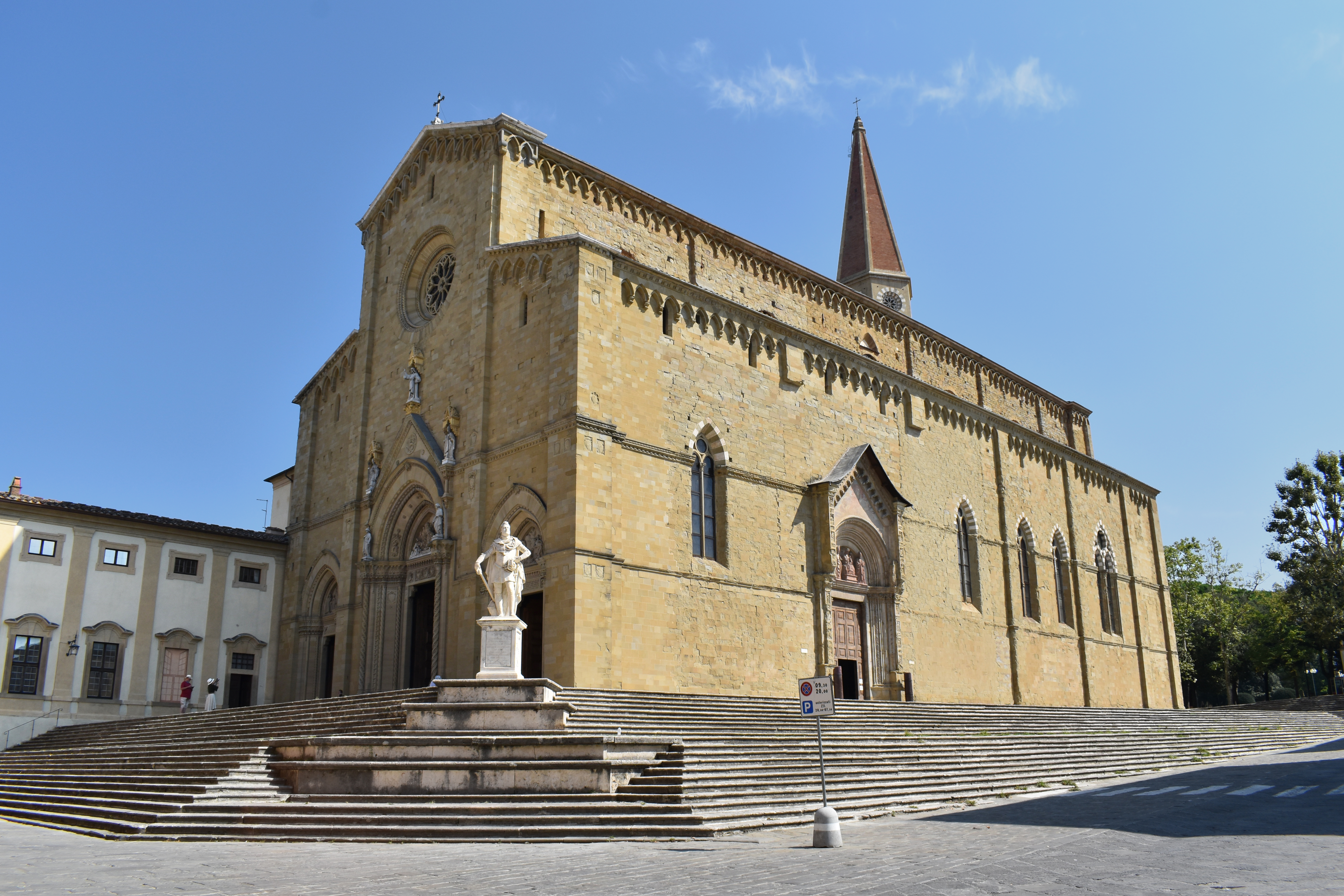 Куда бы вы ни приехали в Ареццо (Казентино, Вальдарно, Вальдикьяна), вид на красивый тосканский город будет выражен присутствием на вершине холма его собора, где находится самая старая часть Ареццо, что ещё более заметно благодаря Готическому стилю, который бросает его в небо, особенно колокольня. Собор посвящён Святому Донату, который был епископом города в IV веке (он также является его покровителем), и Святому Петру, которому была посвящена ранее существовавшая на этом месте церковь, позже снесённая под новый собор. Его строительство началось в 1277 году по приказу тогдашнего епископа Гульельмо дельи Убертини, более известного как Гульельмино. Великий церковный деятель, а также народный лидер, возглавил гибеллинские войска Ареццо против флорентийских гвельфов в знаменитой битве при Кампальдино 11 июня 1289 года. В этой кровавой битве Гульельмино погиб, а его тело было похоронено в маленькой церкви Чертомондо, в двух шагах от Пьяна-ди-Кампальдино около Поппи, построенной примерно тридцатью годами ранее графами Гуиди в честь Святого Франциска. Останки епископа оставались в Чертомондо более семи веков. Сегодня они вернулись в "свой собор". Могила Убертини расположена на полу в верхней части левого нефа. Гульельмо дельи Убертини не пришлось увидеть этот великий собор, строительство которого длилось более двух столетий, в том числе из-за нескольких длительных перерывов. Он был объявлен готовым (сегодня сказали бы "годным к употреблению") в 1511 году, но так и не был достроен до конца. Прекрасные витражи Гульельмо да Марсилья (Guillaume De Marcillat) созданы несколькими годами позже. На протяжении веков проводились различные ремонтные работы, в том числе и в двадцатом веке. Капелла Мадонны дель Конфорто ("вторая покровительниц" собора Ареццо) была завершена в 1823 году. Высокая колокольня с шестиугольной секцией, отделенная от Здание, расположенное справа от апсиды, была построена в неоготическом стиле между 1857 и 1860 годами. Её верхняя часть, барабан и шпиль, датируется 1930-ми годами. Фасад собора, который оставался незавершенным до 1900 года, выполнен в неоготическом стиле. На переднем плане фотографии, наверху ступеней собора, изображена статуя Фердинандо I Медичи, великого герцога Тосканы с 1587 по 1609 год. Если собор Ареццо был построен на этом месте, чтобы доминировать над городом. То же самое и со статуей Фердинандо I. Она была помещена здесь, чтобы символизировать владычество флорентийской семьи Медичи над Ареццо.