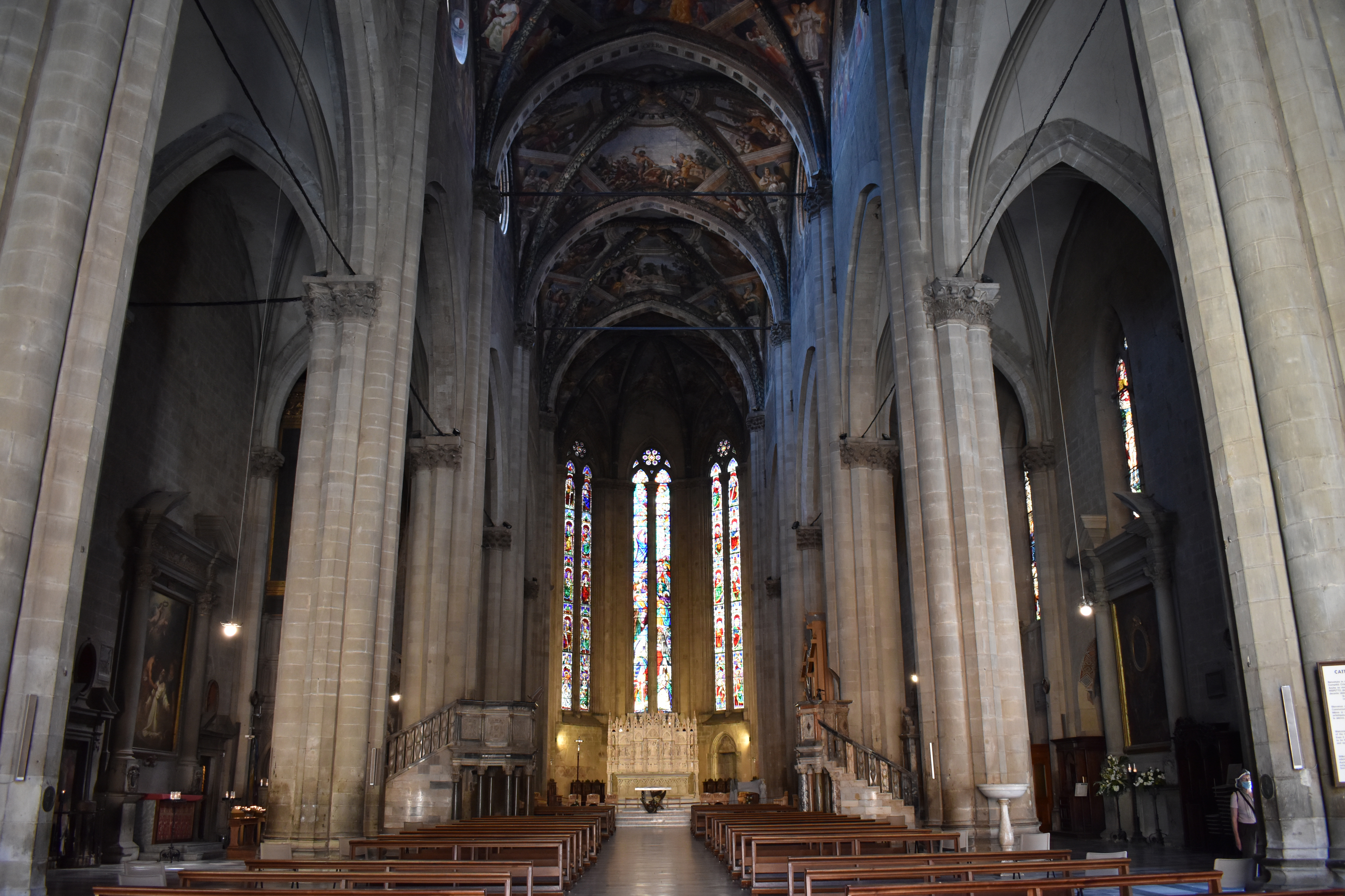 Вторая половина тринадцатого века – это период, в котором началось строительство собора, с архитектурной точки зрения представляет собой плавный переход от приземистого и тяжёлого романского стиля к более легкой и тонкой готике. Самым непосредственным и ярким свидетельством тому являются узкие и высокие окна, расположенные на южной стене здания, а внутри три высоких нефа, разделенных колоннами, и многие другие архитектурные элементы подтверждают этот стиль. Первое, что поражает при входе в собор Ареццо, – это движение вверх. Таково свойство готического стиля, который стремится направить дух прихожанина на божественное. Интерьер большой церкви (почти 68 метров в длину, 23 в ширину и 27 в высоту) включает три нефа, разделенных мощными и высокими колоннами, на которых покоятся круглые арки. Потолок центрального нефа украшен шестью крестовыми сводами, изысканно расписанными в XVI-XVII веках. Почти в центре центрального нефа находятся две кафедры XVI века, опирающиеся на противоположные колонны.