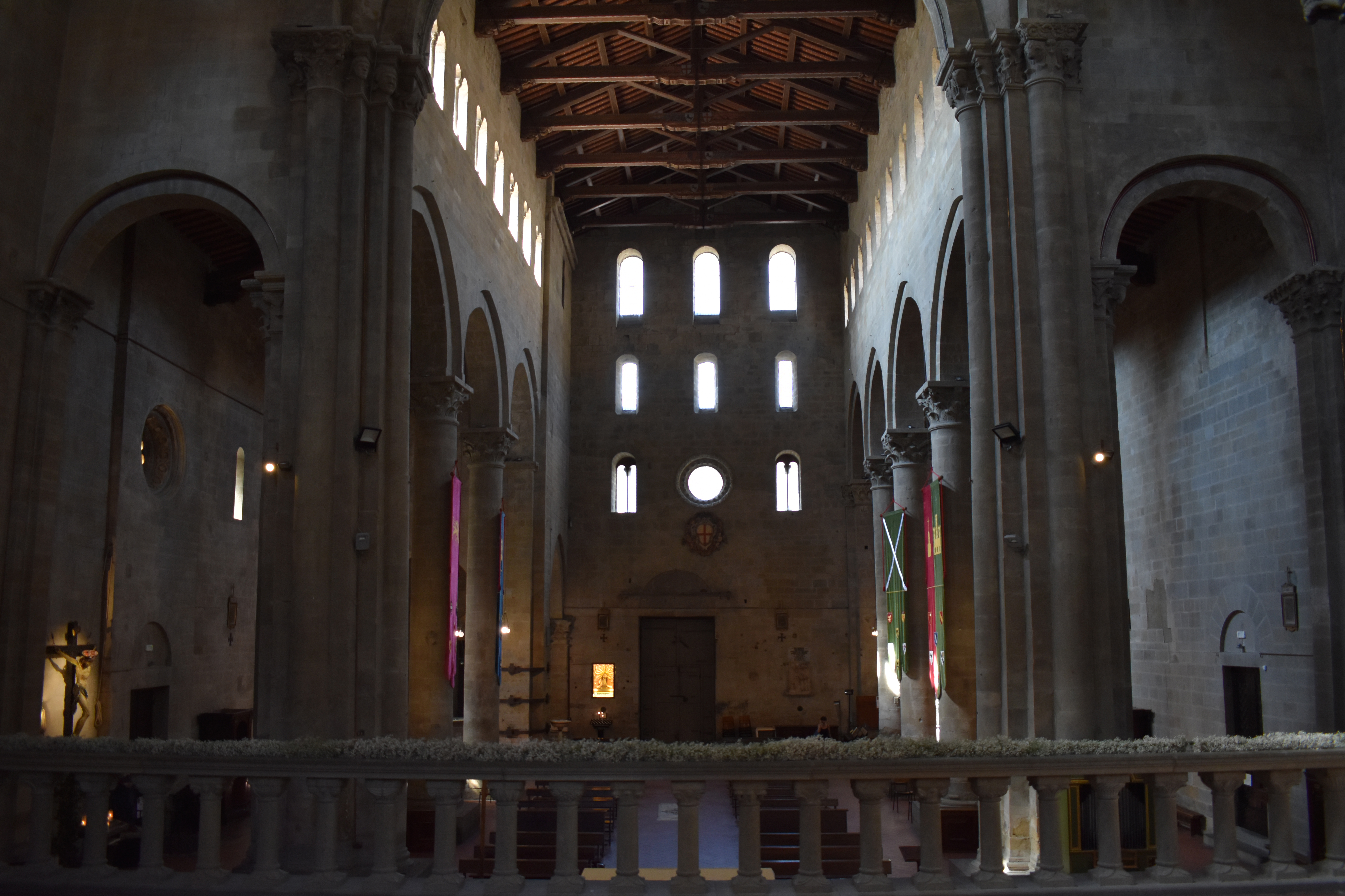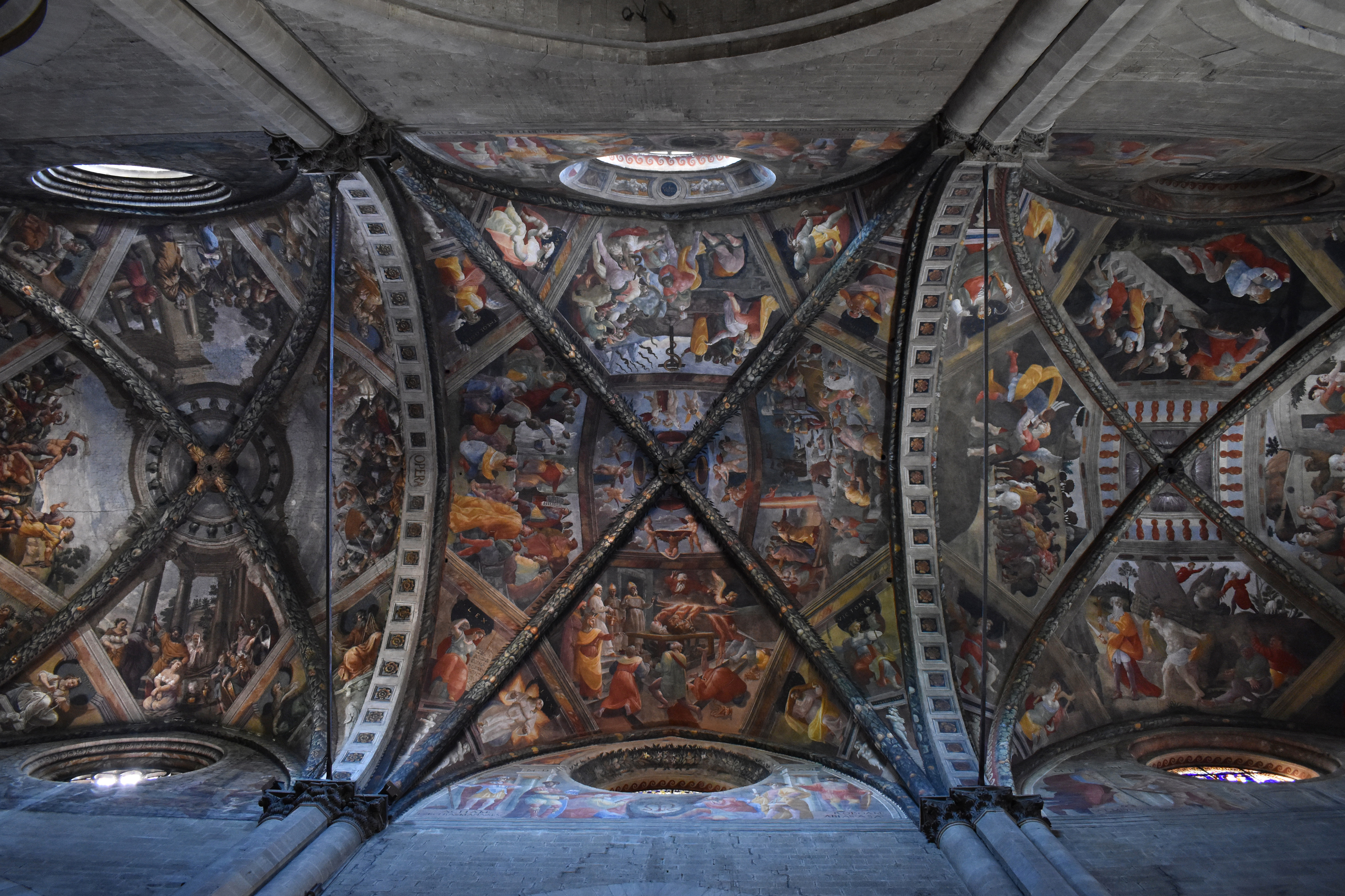 Подвесной потолок с крестовыми сводами центрального нефа можно определить как точно иллюстрированный Ветхий Завет. На парусах шести сводов много сцен, взятых из Библии. Первые три пролёта, начиная с фасада, расписал Гийом де Марсийя (Guillame De Marcillat) в XVI веке, а спустя почти полтора столетия после смерти мастера фрески на четвертом и пятом пролётах завершил Сальви Кастеллуччи (Salvi Castellucci). Эти своды возвышаются более чем на двадцать пять метров над полом собора.