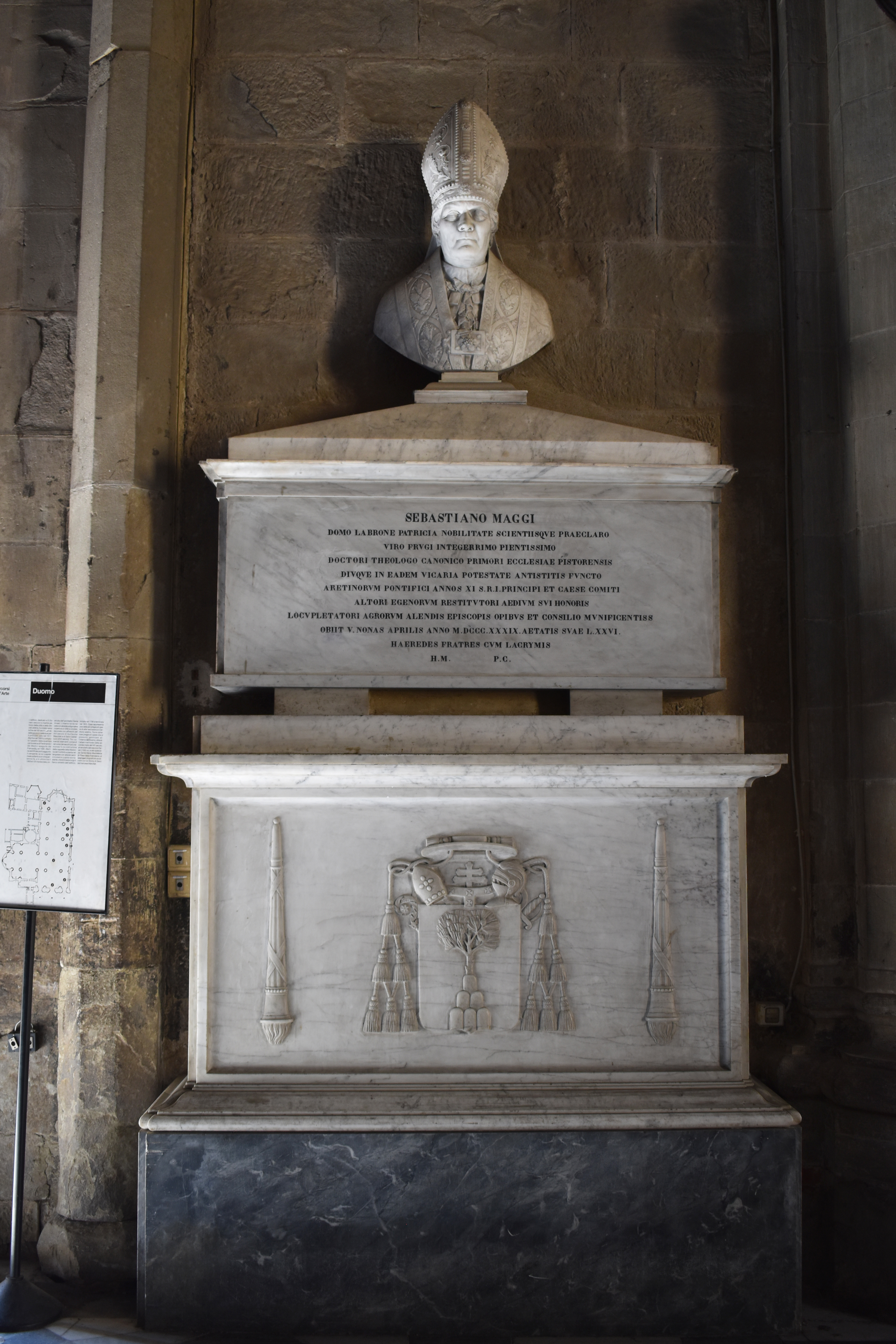 Фотография памятника XIX века из белого мрамора с темным основанием, посвященного Себастьяно Магги, епископу Ареццо с 9 апреля 1827 года по 3 апреля 1839 года (день его смерти). Она наглядно демонстрирует линейность и простоту конструкции. Памятник расположен справа от большого бокового портала собора.