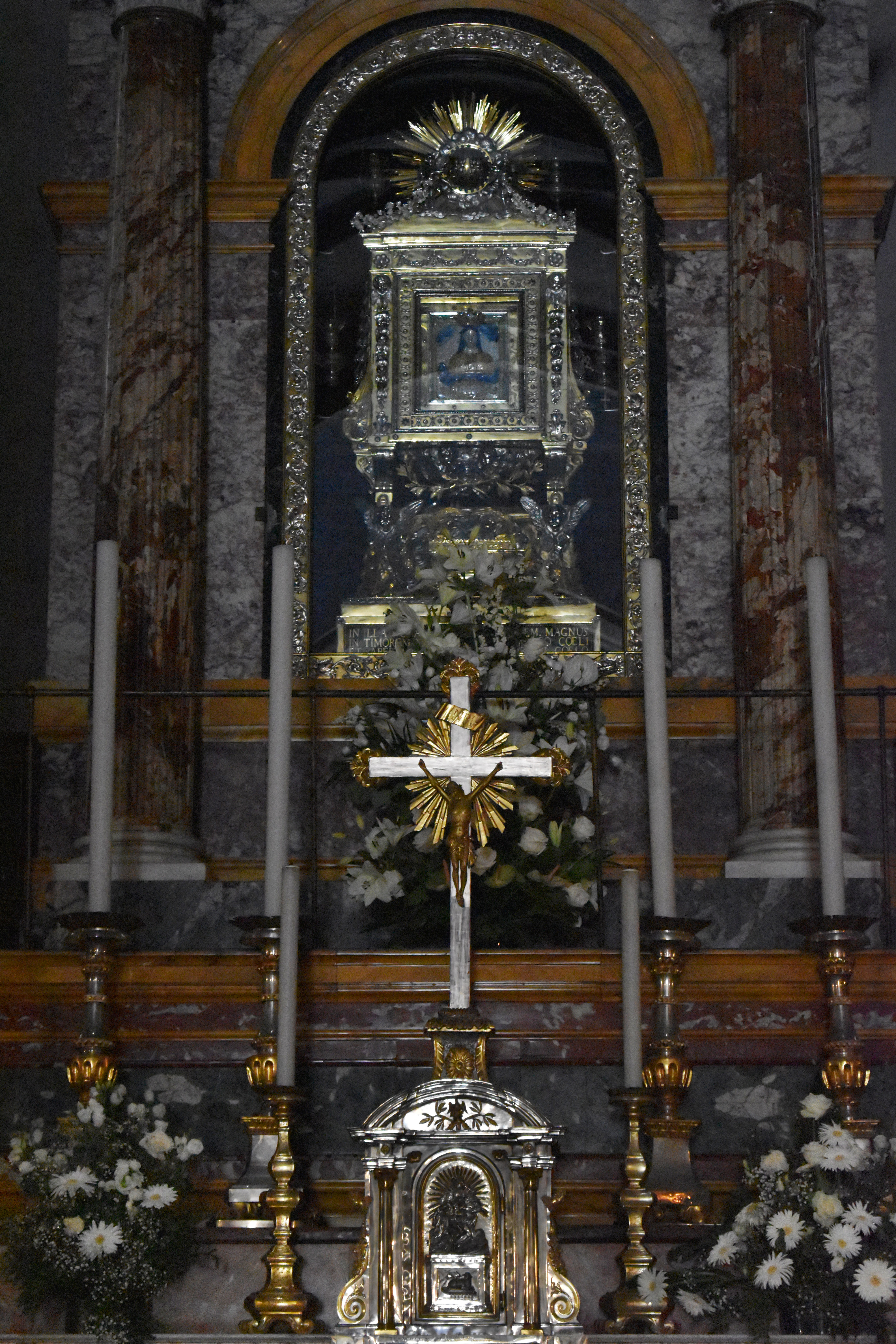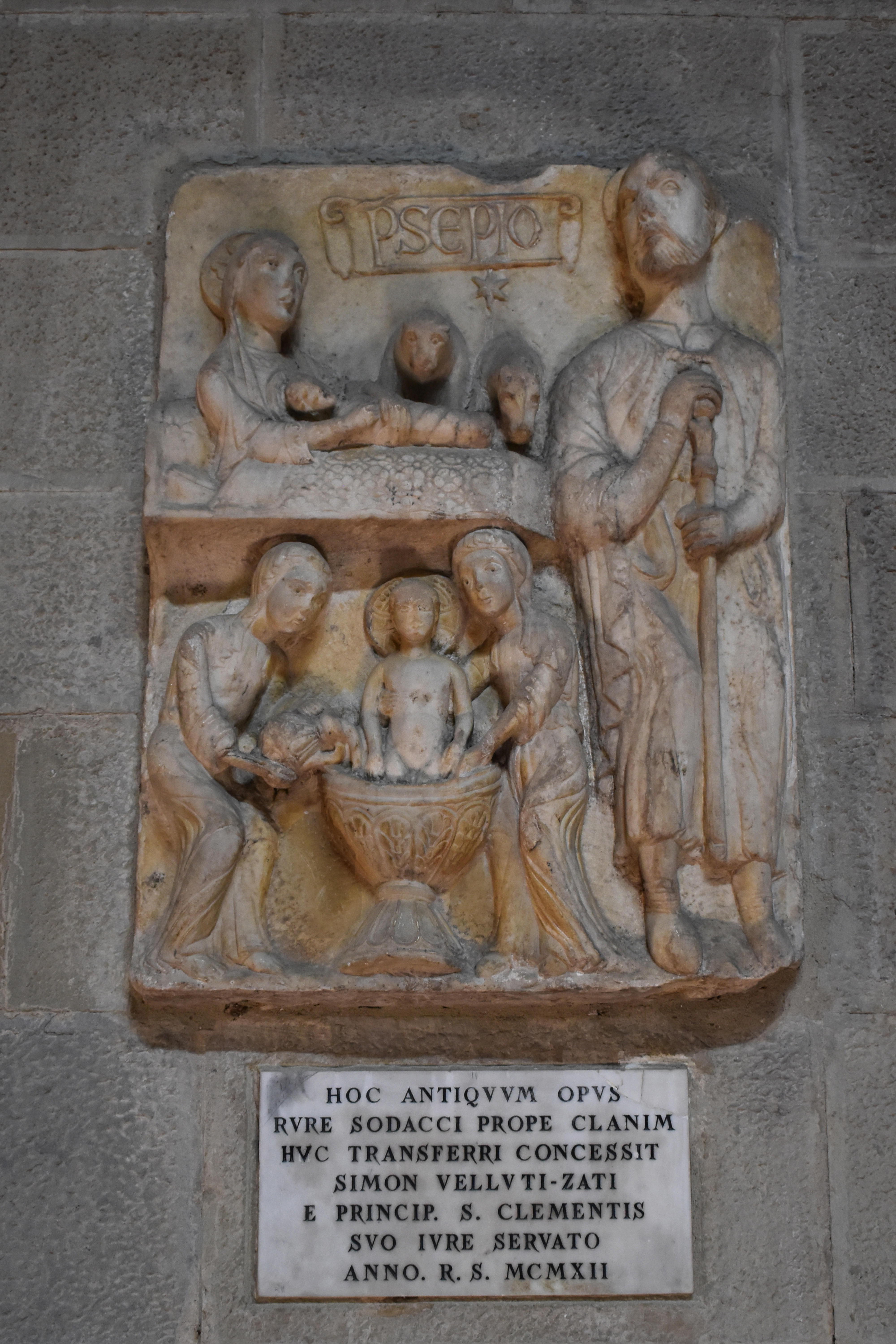 В углу между контрфасадом и левой стеной два мраморных барельефа неизвестного художника XIII века. На одном большая фигура святого Иосифа, слева от него изображено Рождество, под ним – Младенец Иисус омывается в купели.
