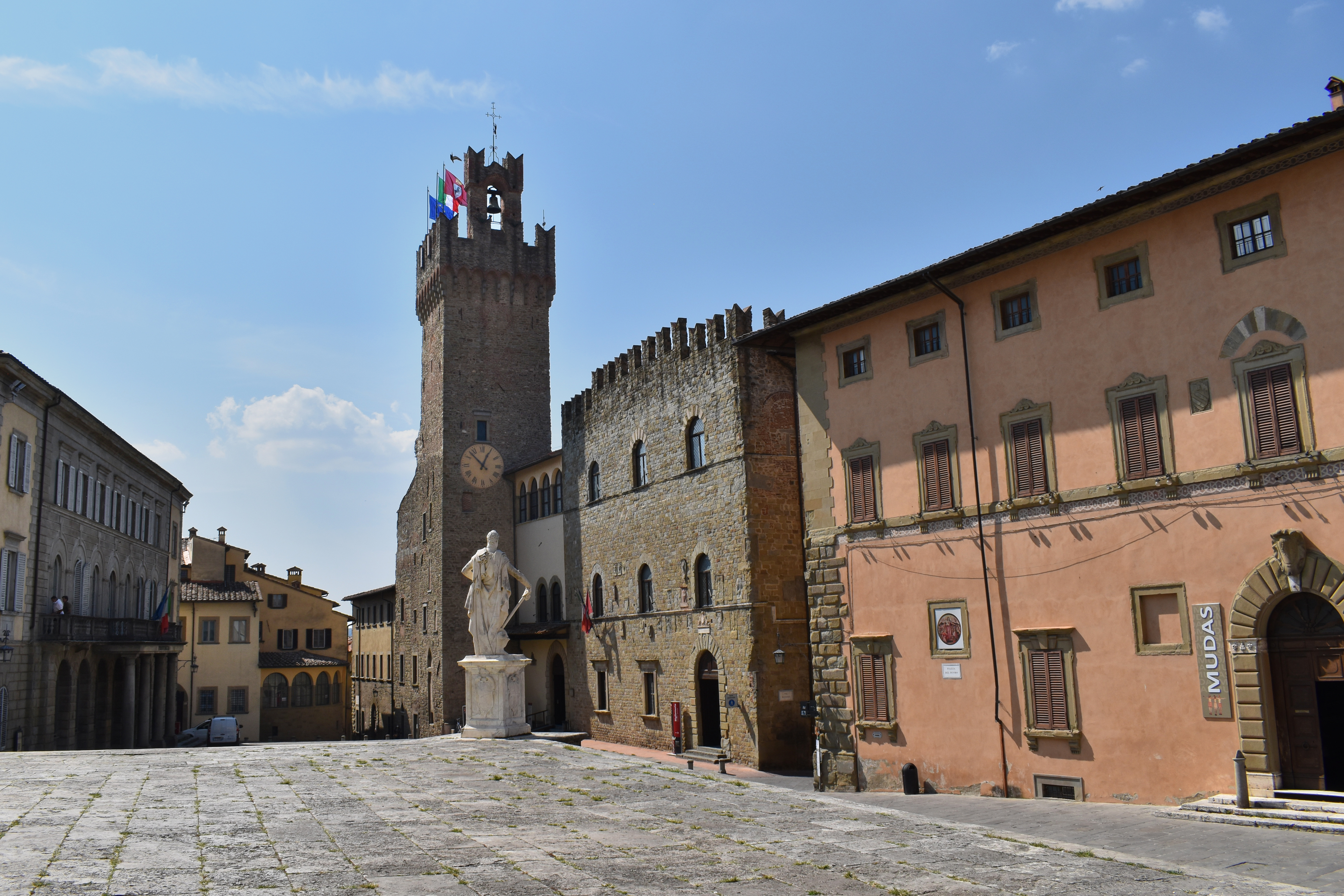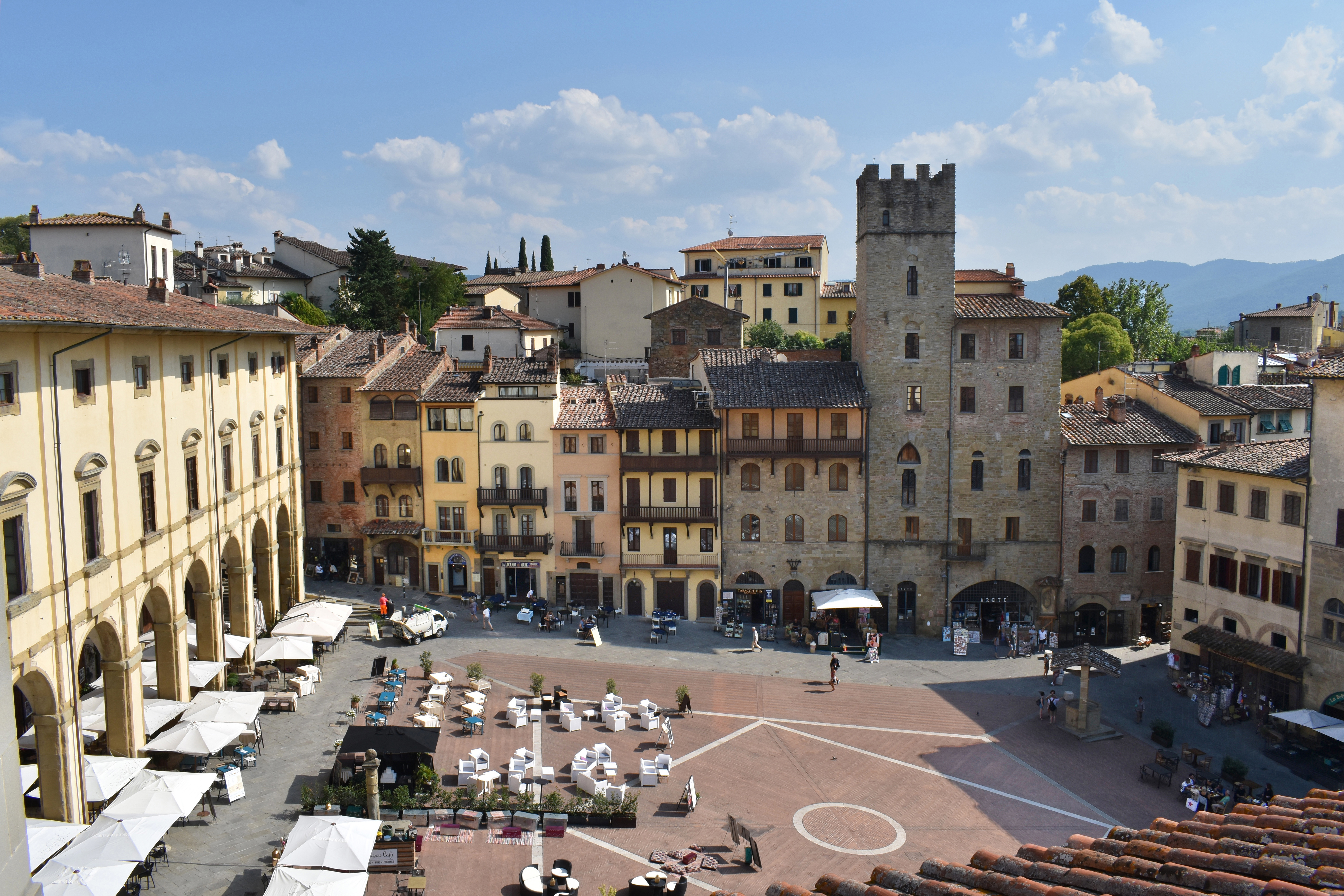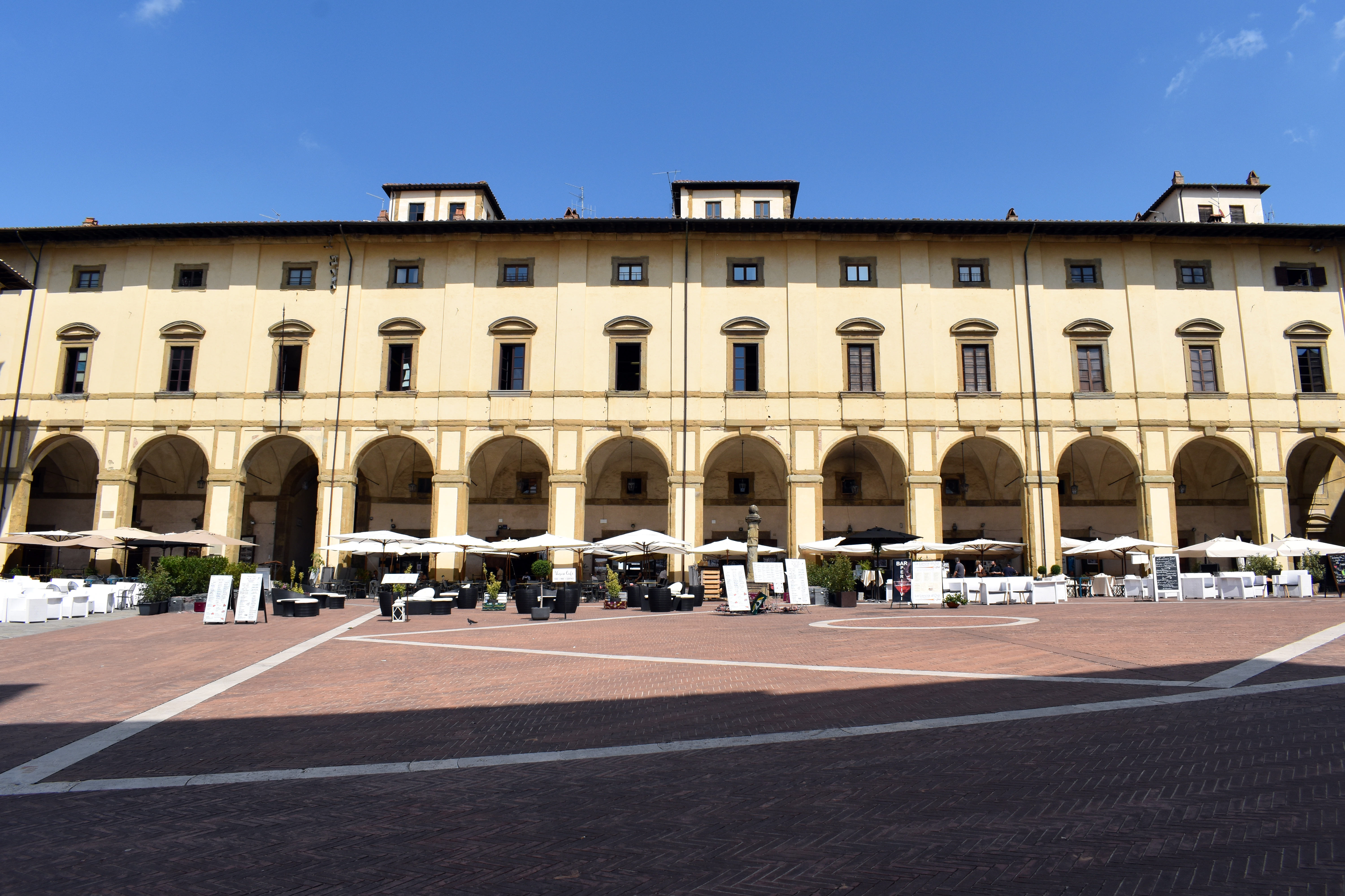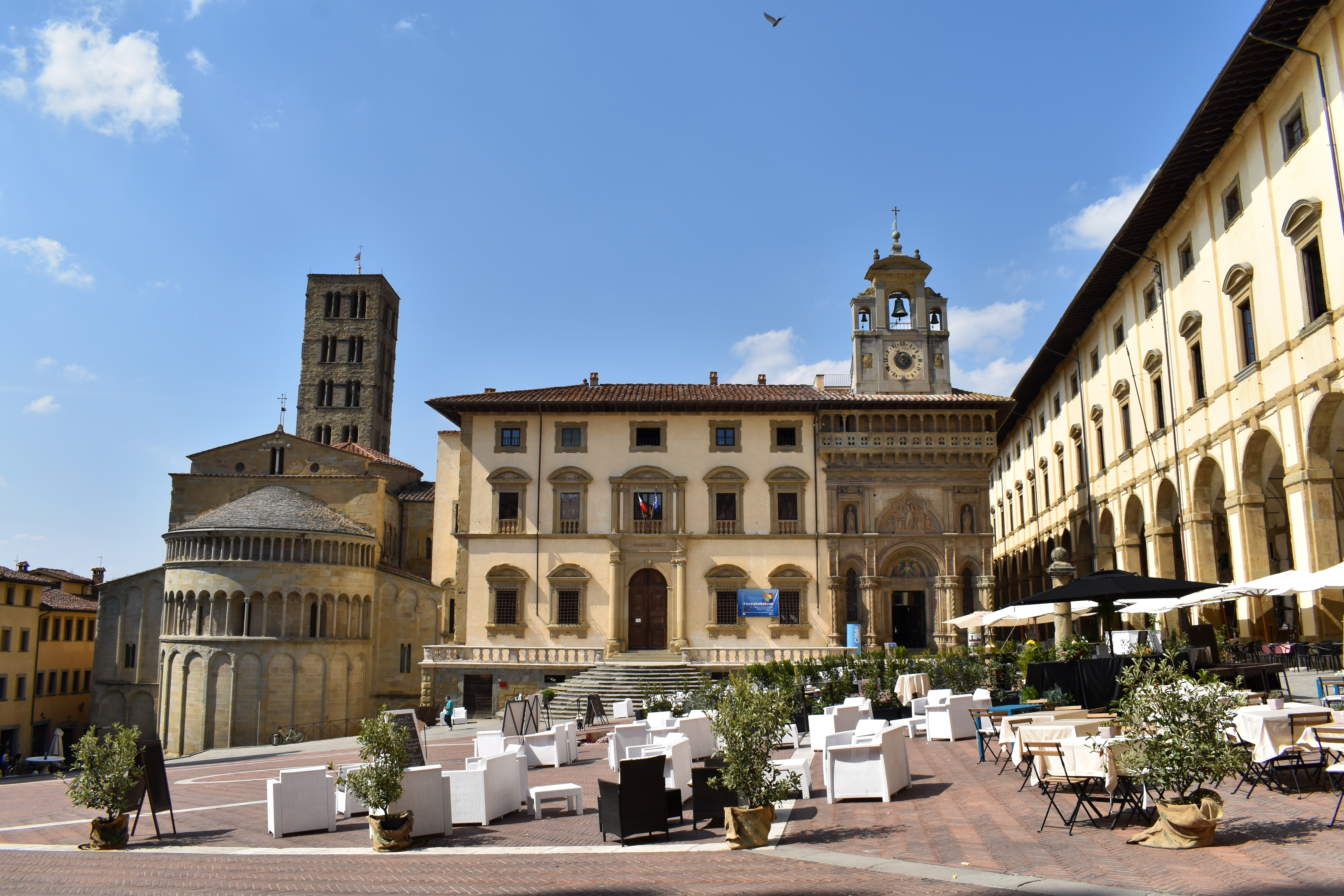 Площадь Пьяцца Гранде, которую называют также Пьяцца Вазари, является одной из самых живописных площадей в Италии, она имеет наклон почти в 30 градусов. В июне и сентябре здесь проводятся Рыцарские турниры Сарацинов – мероприятие необычное, красочное и запоминающееся. Ежемесячно (в первое воскресенье месяца) устраивается знаменитая Ярмарка антиквариата. Достопримечательностями площади являются: Публичный фонтан (XVI век), Дворец Суда и элегантный Дворец Собратства Послушников, нижний этаж которого построен в готическом стиле, а верхний – в стиле Ренессанса. Достоин внимания Дворец Лоджий, созданный по проекту Вазари в 1537 году.