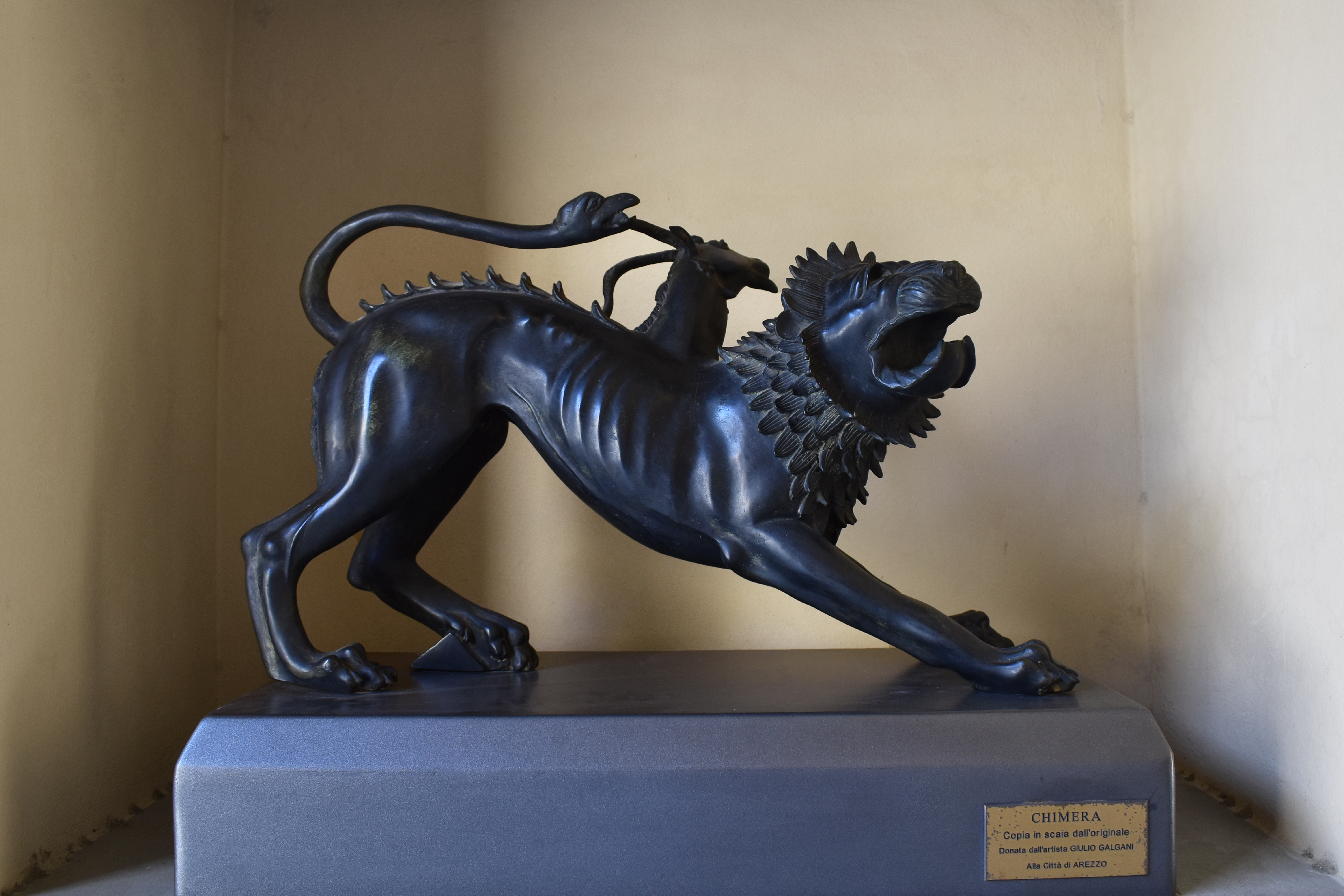 Этруски ответственны за происхождение названия города: Аритим (которое римляне затем превратят в Arretium). Символ этрусского Ареццо, а сегодня также однозначный символ города, это бронзовое произведение искусства, найденное много веков назад: Химера, чудовище из греческой мифологии с телом и головой льва, змеей вместо хвоста и голова козла на спине. Это необычное открытие произошло в 1553 году, в середине периода Великого Герцогства Тосканы, во время работ по укреплению периметра оборонительных стен Ареццо по заказу самого Великого Герцогства Тоскана. По этой причине бронзовая скульптура была немедленно доставлена во Флоренцию по приказу Козимо I деи Медичи. Здесь она осталась с тех пор и сегодня хранится в Археологическом музее тосканской столицы. Для жителей Ареццо и посетителей Ареццо его идентичная копия выставлена в садах перед железнодорожным вокзалом. Другая, уменьшенная копия находится внутри ворот Сан-Лорентино потому, что именно здесь она была найдена. Химера, безусловно, является произведением этрусского периода, однако некоторые высказывают сомнения в том, что это не этрусское, а греческое произведение, выполненное по этрусскому заказу, так как греческая цивилизация была далеко впереди в реализации таких гармоничных и изысканных произведений.
