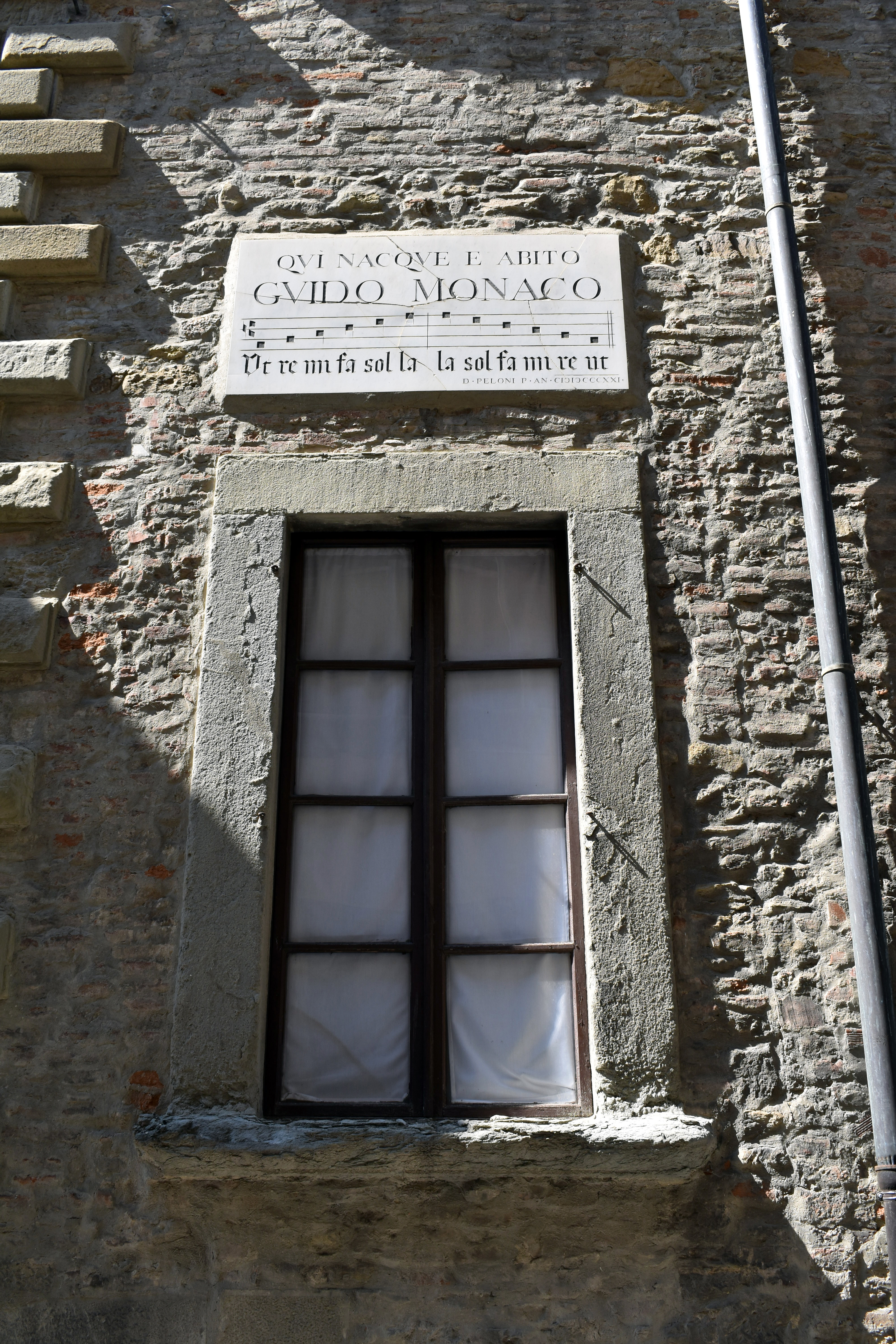 На одной из таких улиц проживал в начале XI века изобретатель современной системы нотной записи – бенедиктинский монах Гвидо Аретинский. В здешнем монастыре брат Гвидо обучал певчих исполнению церковных песнопений. Дело это было нелегким и долгим. Все знания и умения передавались устно в непосредственном общении. Певчие под руководством преподавателя и с его голоса последовательно разучивали каждый гимн и каждое песнопение католической мессы. Поэтому полный "курс обучения" занимал около 10 лет. Гвидо Ареттинский начал отмечать звуки нотами. Заштрихованные квадратики, размещались на нотном стане, состоящем из четырех параллельных линий. Сейчас этих линий пять, и ноты изображают кружочками, но принцип, введенный Гвидо, остался без изменений. Более высокие ноты изображаются на более высокой линейке. Нот семь, они образуют октаву. На стене дома, в котором родился Гвидо, улице Рикасолли установлена мемориальная доска. На ней изображены квадратные ноты. Это – первые слоги гимна св. Иоанну. Каждая строка этого гимна поется на тон выше предыдущей.