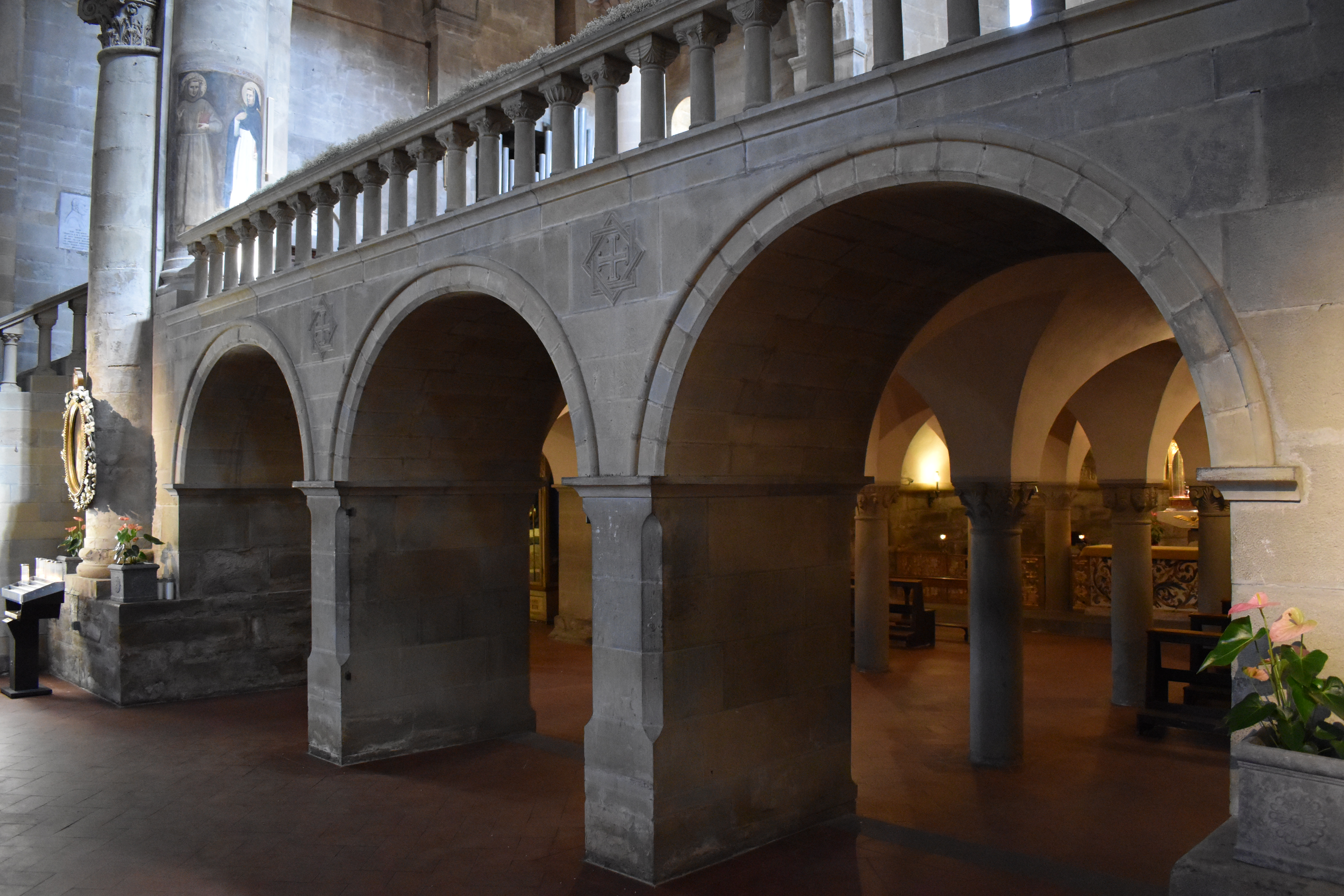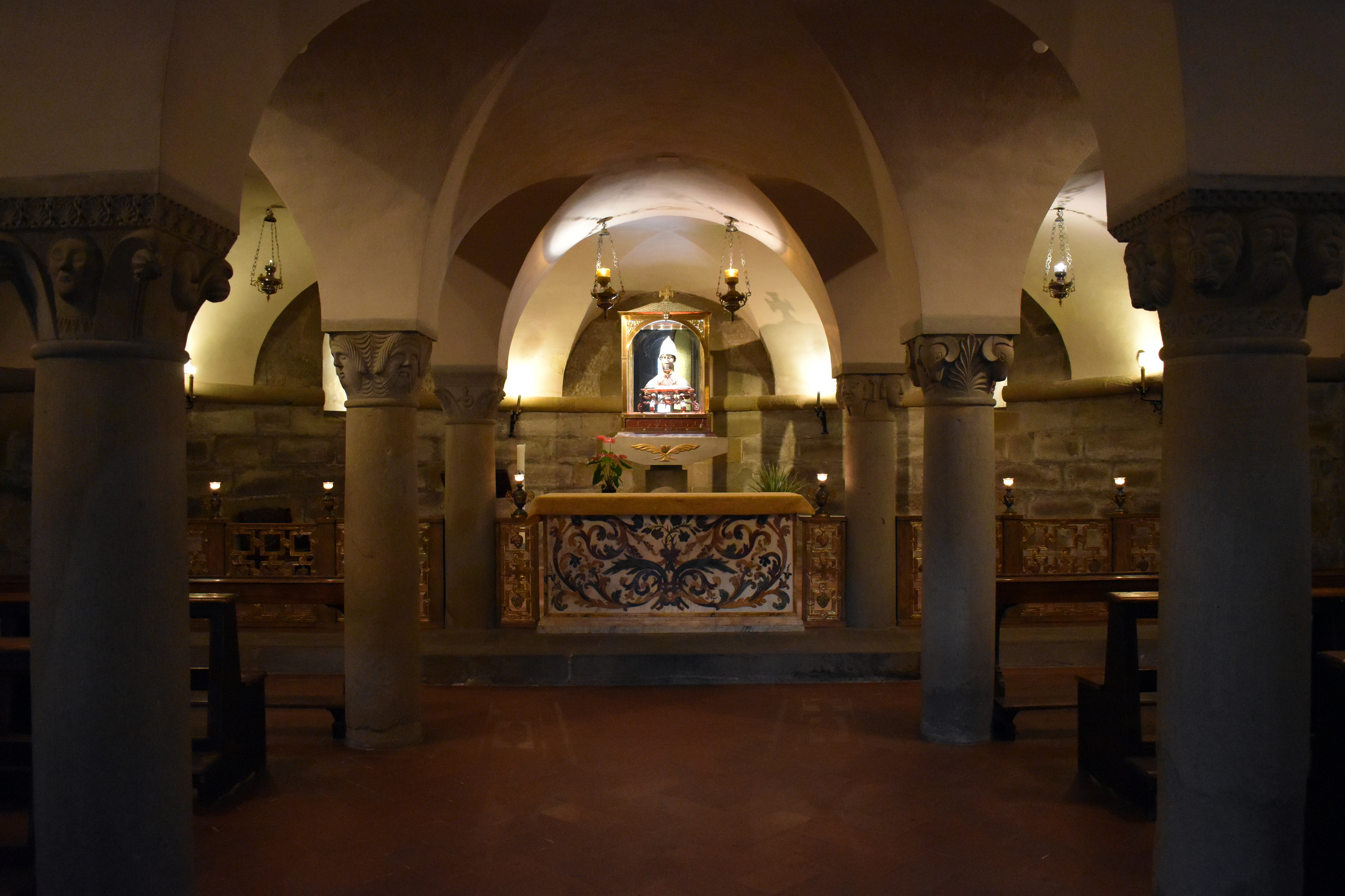 Чтобы попасть в склеп Пьеве-ди-Санта-Мария-ди-Ареццо, достаточно спуститься всего на несколько ступенек, поскольку он находится под большим пресвитерием, который хорошо поднят. Захватывающая и почти захватывающая среда, которую можно определить как «заново открытую» в буквальном смысле этого слова. На самом деле склеп, который восходит к постройке церкви в 12 веке, был полностью погребен в 16 веке. Только во второй половине XIX века он был освобожден от земли и подвергнут глубокой реставрации. Низкий сводчатый потолок, поддерживаемый множеством приземистых колонн, придает пространству ощущение трехмерности. Очень интересны капители, расположенные поверх колонн, которые, учитывая небольшую высоту, хорошо просматриваются. На них изображены различные мотивы, на многих изображены классические элементы растений, на других - фигуры людей и животных.