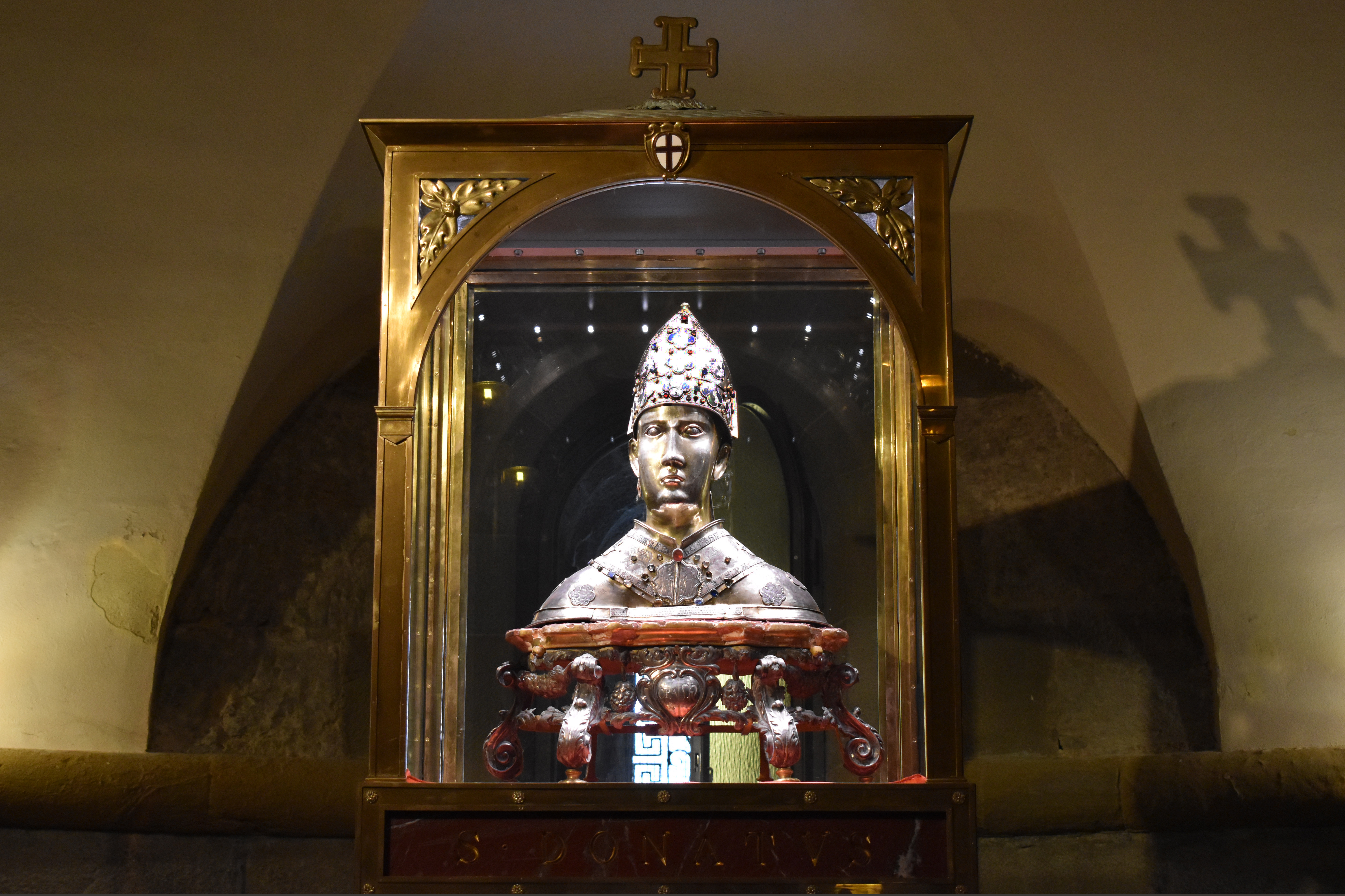Только эту обстановку можно рассматривать как небольшую романскую церковь, разделенную на три нефа, два трансепта и апсиду. Внутри последней, за алтарём, находится серебряный бюст Святого Донато, второго епископа Ареццо и покровителя этого города, замученного и обезглавленного в 304 году. Этот драгоценный и изысканный бюст датируется серединой XIV века и был изготовлен двумя ювелирами из Ареццо: Паоло Гизелли и Пьетро Ванни. Но это не только произведение искусства, это также важный реликварий, поскольку в нем хранится череп Святого Донато.