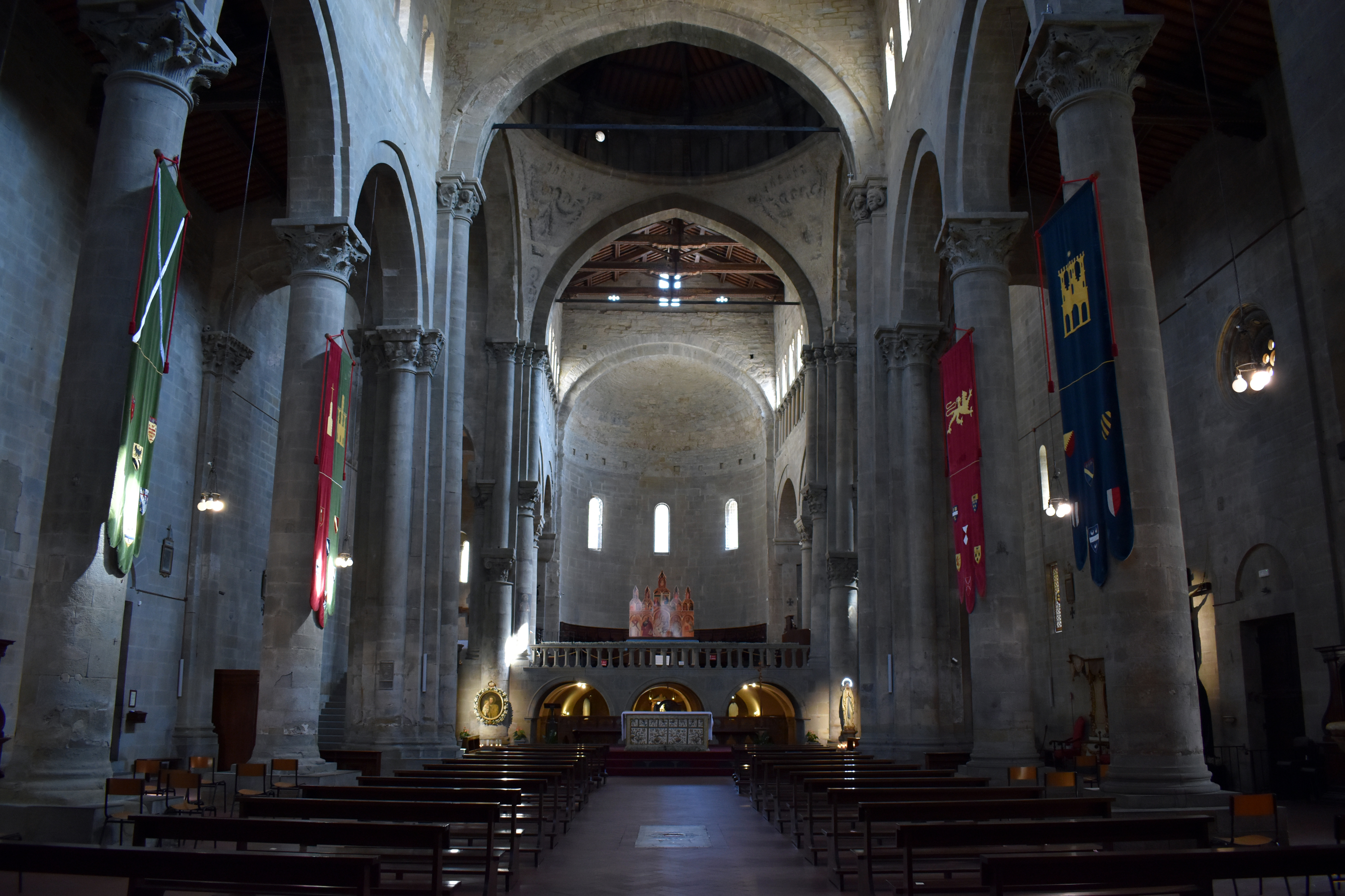 Интерьер Пьеве-ди-Ареццо особенно хорошо виден с возвышенного пресвитерия. На переднем плане два пучка высоких массивных колонн, соединенные арками друг с другом и с боковыми стенами, образуют своего рода трансепт перед пресвитерией. Под перекрытием, на стенах центрального нефа, над арками расположено две серии из семи окон. Число 7 часто встречается в средневековых церквях. Это библейское число, которое представляет сумму числа 3, которое отличает мужской элемент, и женского числа 4.