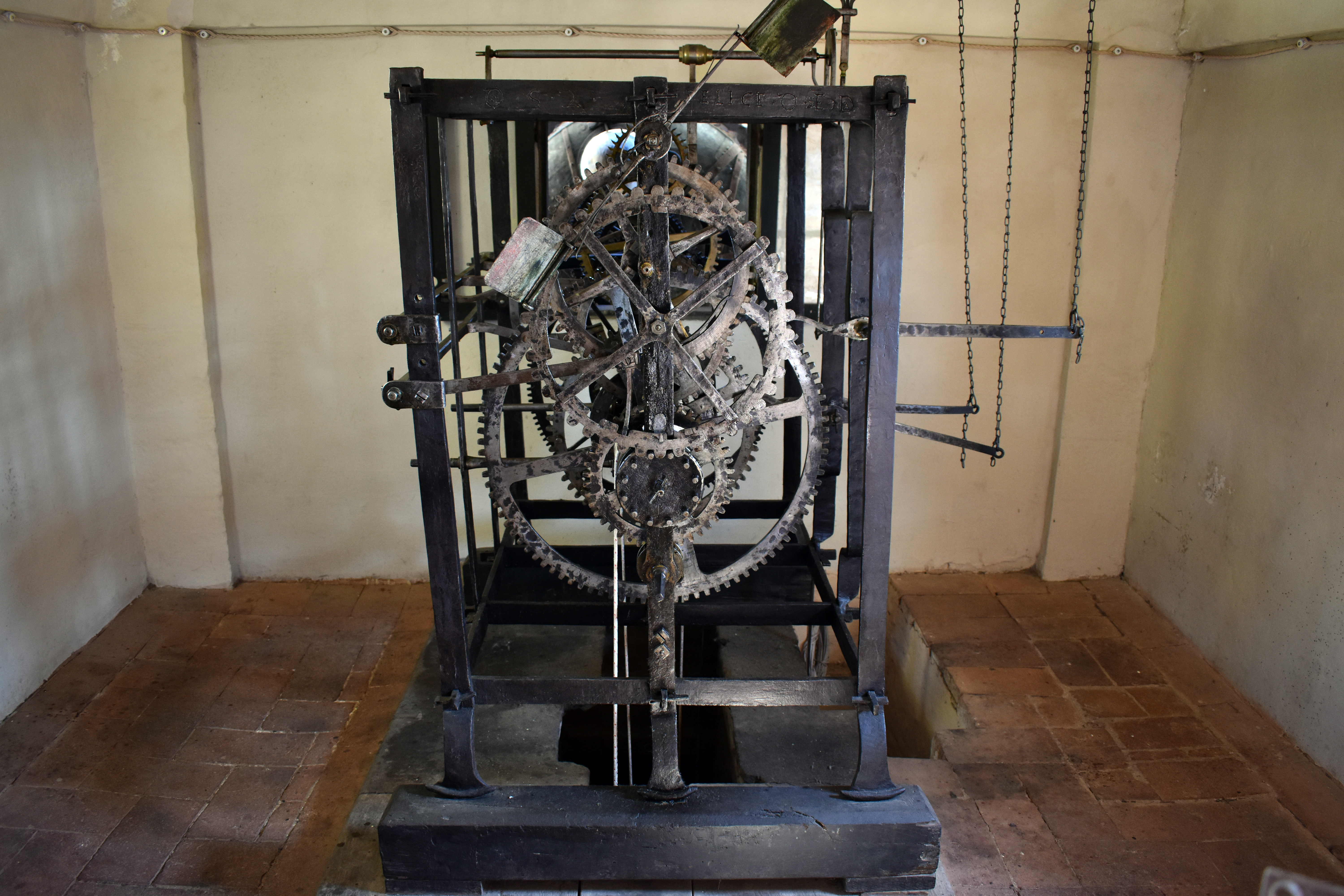 Изготовленные и подписанные в 1552 году мастером-часовщиком Феличе ди Сальваторе да Фоссато ((Felice di Salvatore da Fossato)), часы в здании колокольни сохраняют свои особые функции и спустя четыре столетия, а также после некоторых искусных реставраций сложных и оригинальных механизмов, всё ещё позволяют слышать своё звон. Он управляется ежедневной ручной подправкой, которая, благодаря действию тросов и противовесов, поддерживает вечное движение. Эти часы, одни из самых редких в Европе и единственные в Италии по размерам и функциям, представляют собой документ исключительной ценности. После реставрации в 1998 году началась реставрация машины и астрономической части, а в декабре 2002 года функциональность трёх колоколов, которые своим звуком сопровождают движение часовой стрелки в конце четверти часа.