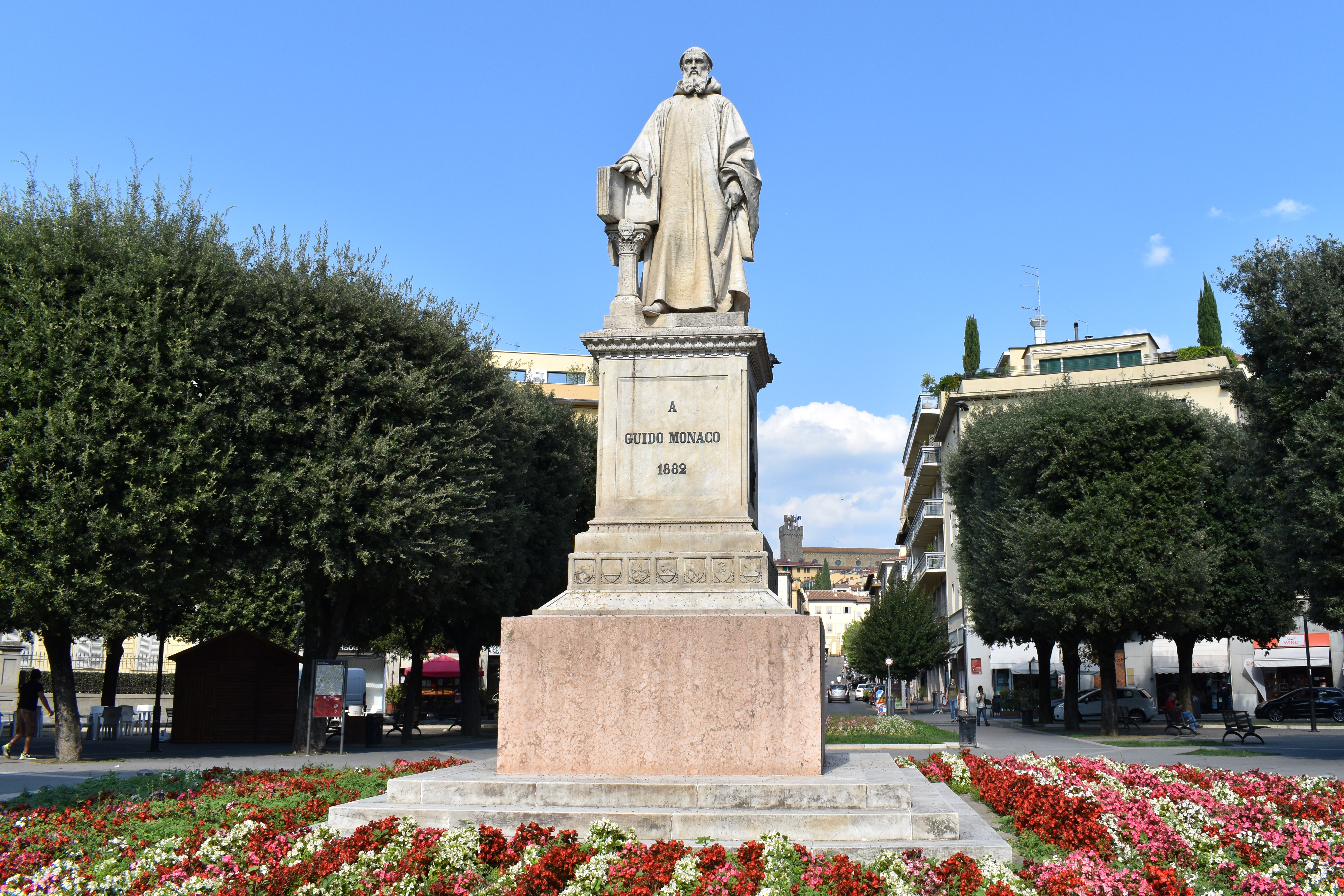 На центральной площади Пьяцца Гвидо Монако в Ареццо имеется транспортная развязка, представленная кольцевой дорогой, внутри которой находится небольшая зелёная зона, в центре которой "возвышается" памятник Гвидо Монако, установленный здесь в 1882 году, как написано на пьедестале, на котором стоит мраморная статуя работы тосканского скульптора Сальвино Сальвини ( Ливорно 1824 – Ареццо 1899). Ранее скульптор прославился памятником Витторио Эмануэле II для Флоренции. Большая статуя Гвидо Монако в Ареццо обращена к ближайшей железнодорожной станции, которая была сдана в эксплуатацию за несколько лет до того, как там был установлен памятник. Вероятно, у него была "задача" приветствовать, приветствовать тех, кто прибыл в город на этом современном и революционном транспортном средстве. В противоположном направлении, за памятником, находится площадь Святого Франциска с одноименной церковью.