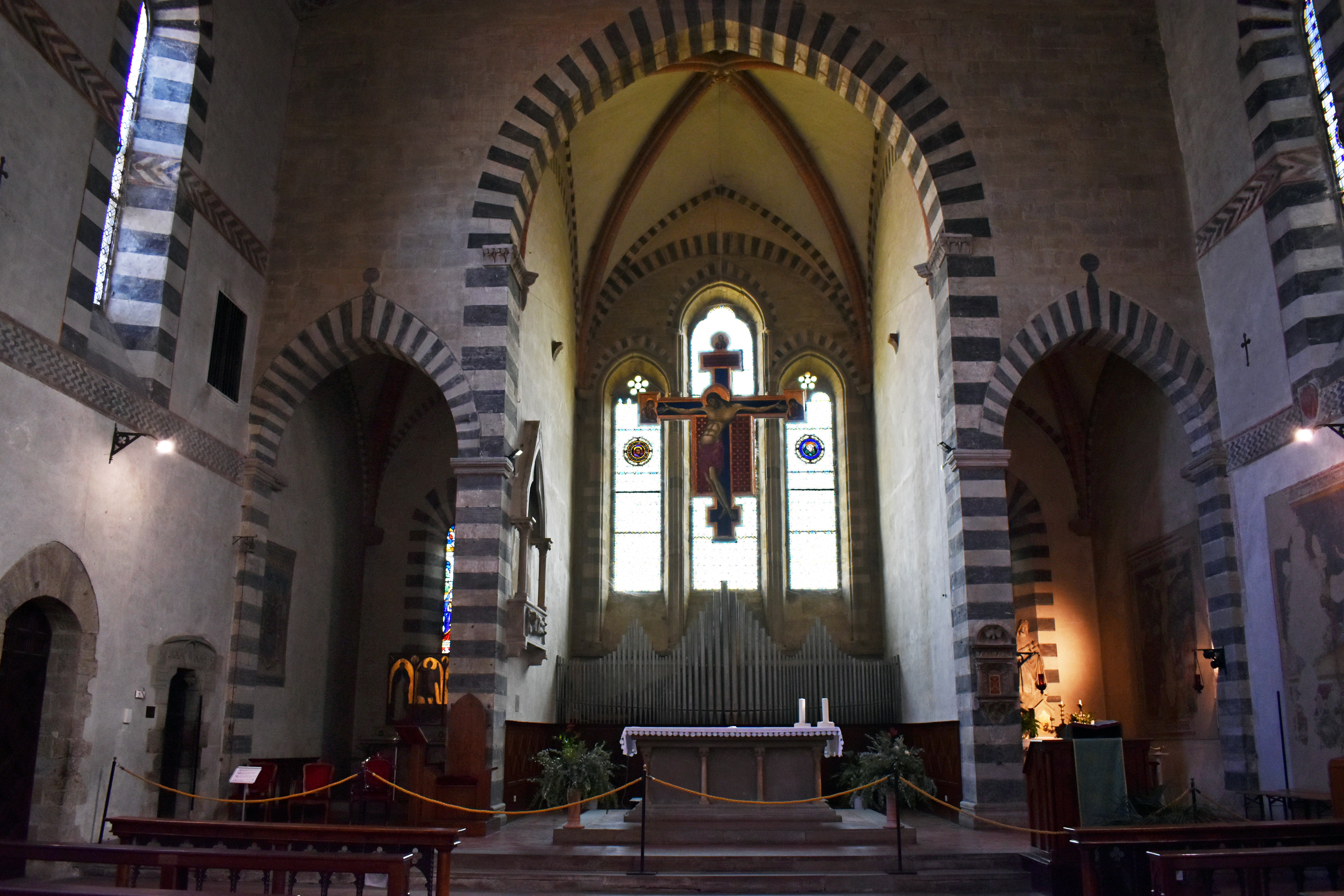 Центральный неф завершается многогранной апсидой. В центре апсиды, за главным алтарём, стоит ковчег с телом Св. Доната – необычная работа, задокументированная в 1362 году. Мраморный ковчег поддерживается двенадцатью небольшими колоннами, заканчивающимися готическими шпилями, в создании которых в XIV веке принимали участие художники из Сиены, Флоренции и Ареццо. Нижняя полоса принадлежит Агостино ди Джованни и Аньоло ди Вентура (первая половина XIV века), в то время как большая часть верхней ленты с большим мраморным алтарем, когда-то также расписанным, с изображением Мадонны с Младенцем в центре, принадлежит Джованни и Бетто ди Франческо, работавшими над ними во второй половине XIV века. Витражи Марсилья, которые считаются настоящими шедеврами искусства с их насыщенными цветами, становятся почти ослепительными при освещении прямым солнечным светом.