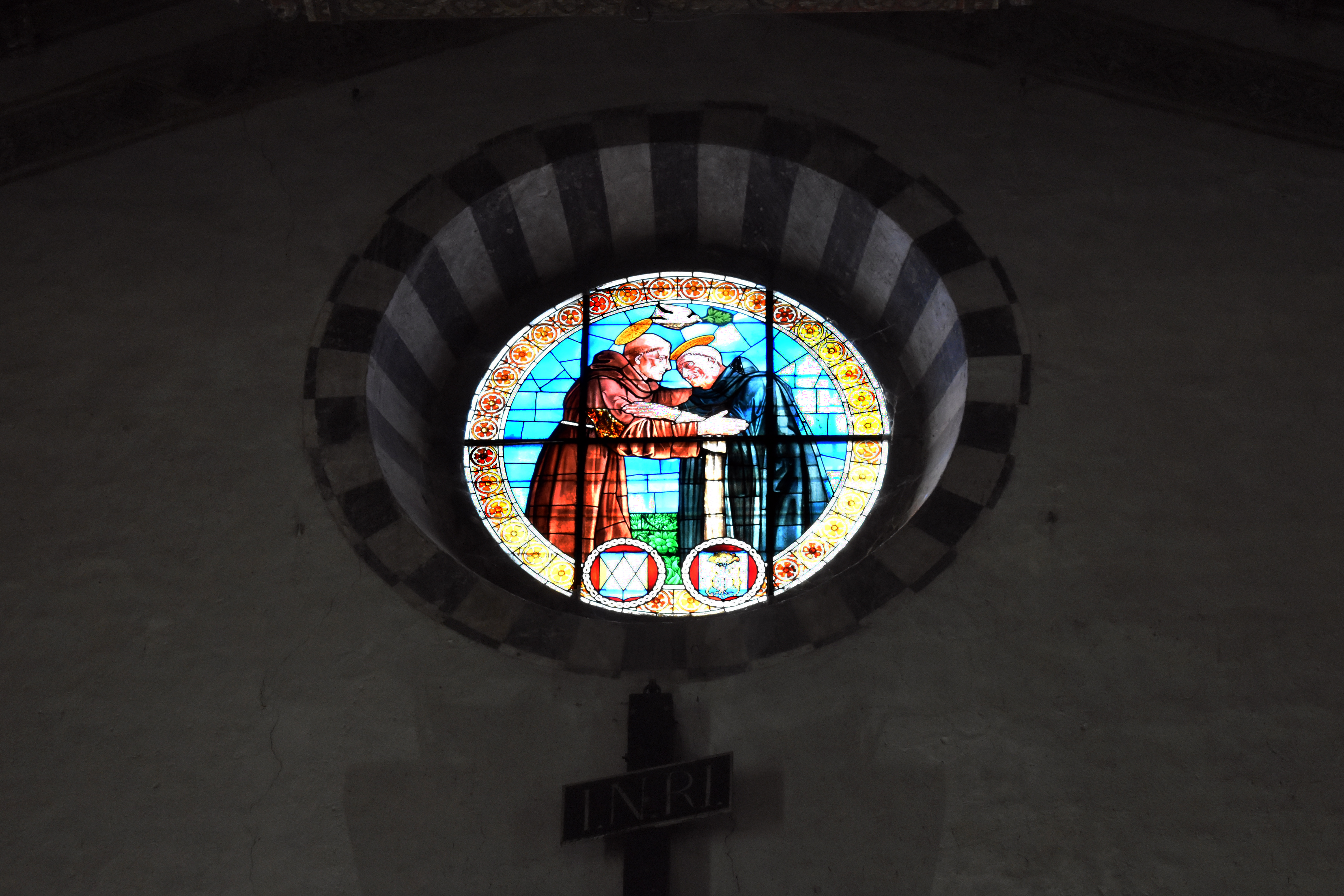 Окно-роза на фасаде базилики, также окруженное черно-белыми элементами, показывает объятия Святого Франциска и Святого Доменика. Два святых современника, которые жили между XII и XIII веками, объединяет канонизация, произошедшая вскоре после их смерти.