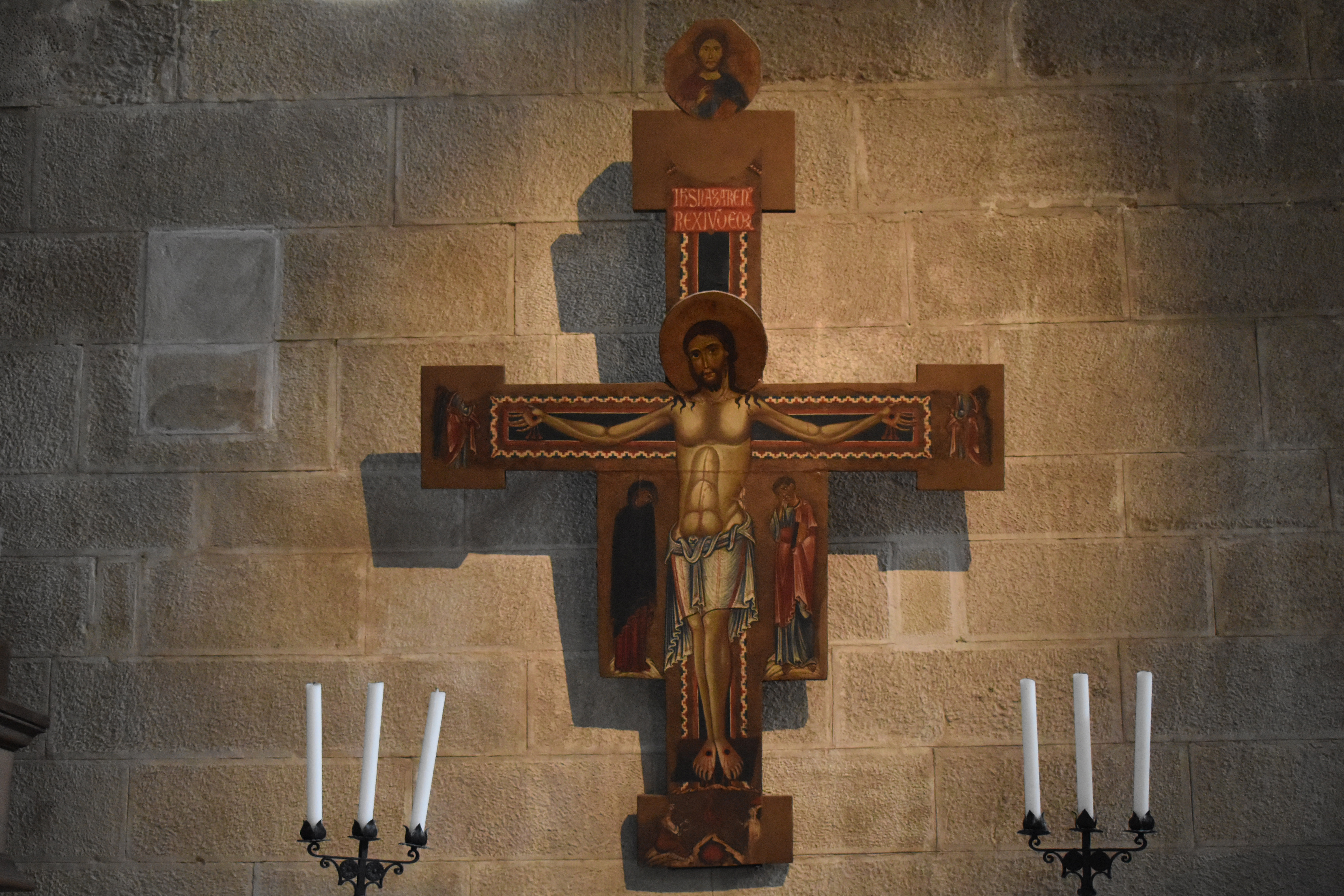 В пресвитерии, за резиденцией епископа, находится шедевр искусства Ареццо, относящийся ко второй половине XIII века. Это нарисованный Маргаритоне д'Ареццо крест с очень безмятежным на вид Христом, с телом, которое, кажется, удобно сидит на ногах, а не поддерживается руками, которые выглядят просто вытянутыми, как будто ждут, чтобы поприветствовать, обнять кого-то, возможно, всё человечество. Лицо выражает печаль, но в то же время, особенно в глазах, много ласковости. По сторонам от Христастоят Мадонна и Святой Иоанн Креститель. Ниже Святой Пётр изображен в тот момент, когда он отрекается от Иисуса. Маргаритон или Маргарито из Ареццо родился около 1240 года и умер в последние годы тринадцатого века. О его биографии известно мало или совсем ничего. Он был одним из первых художников, написавших Святого Франциска, канонизированного в 1228 году.