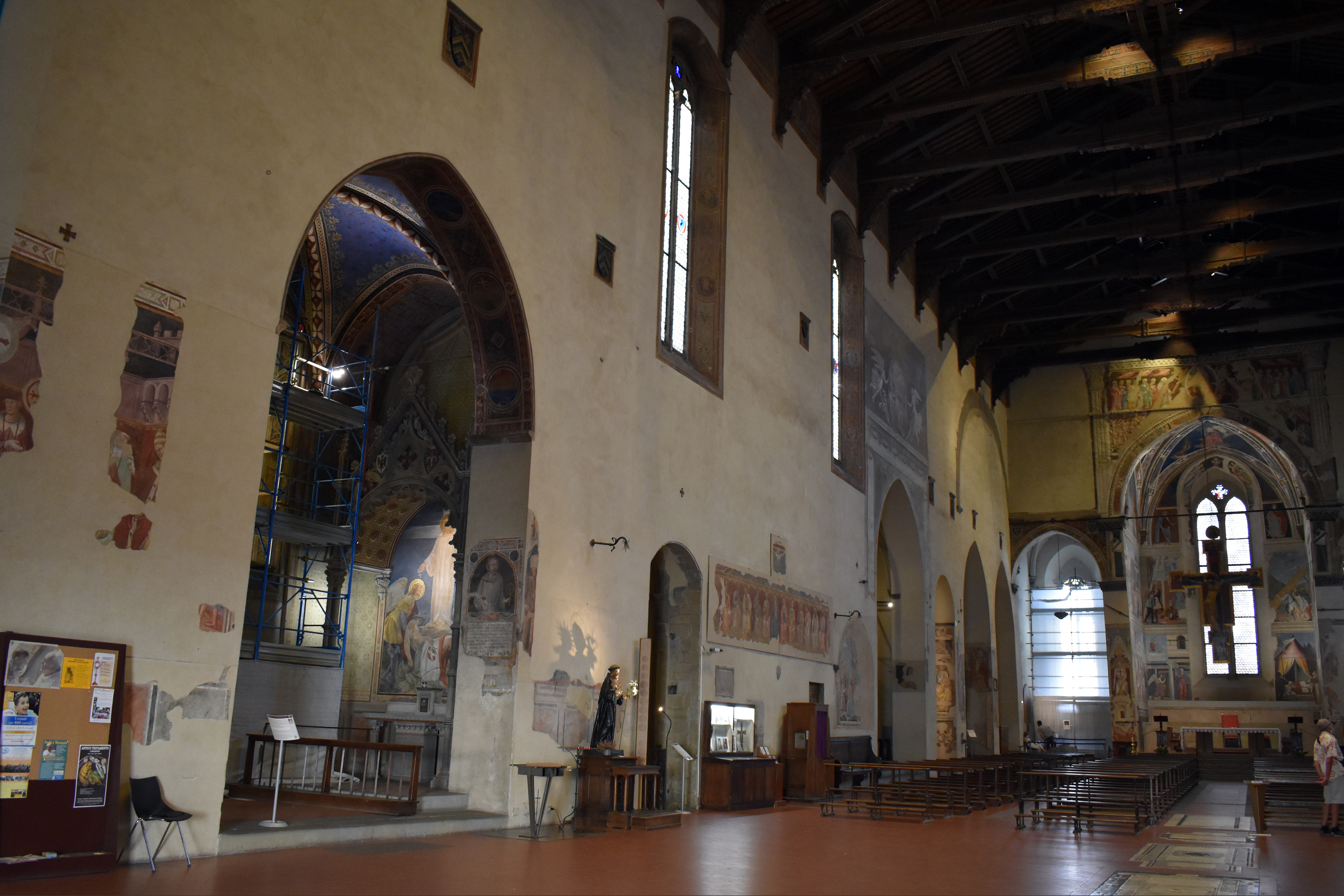 Первое визуальное впечатление, которое производит интерьер базилики, оставляют фрески на правой стене и в капелле Баччи, расположенной в центре противоположного входу фасада за тёмным силуэтом большого креста. Этот зал, расписанный фресками Пьера Делла Франческа между 1452 и 1466 годами, является "художественной жемчужиной" города Ареццо, вызывающей большой туристический интерес.