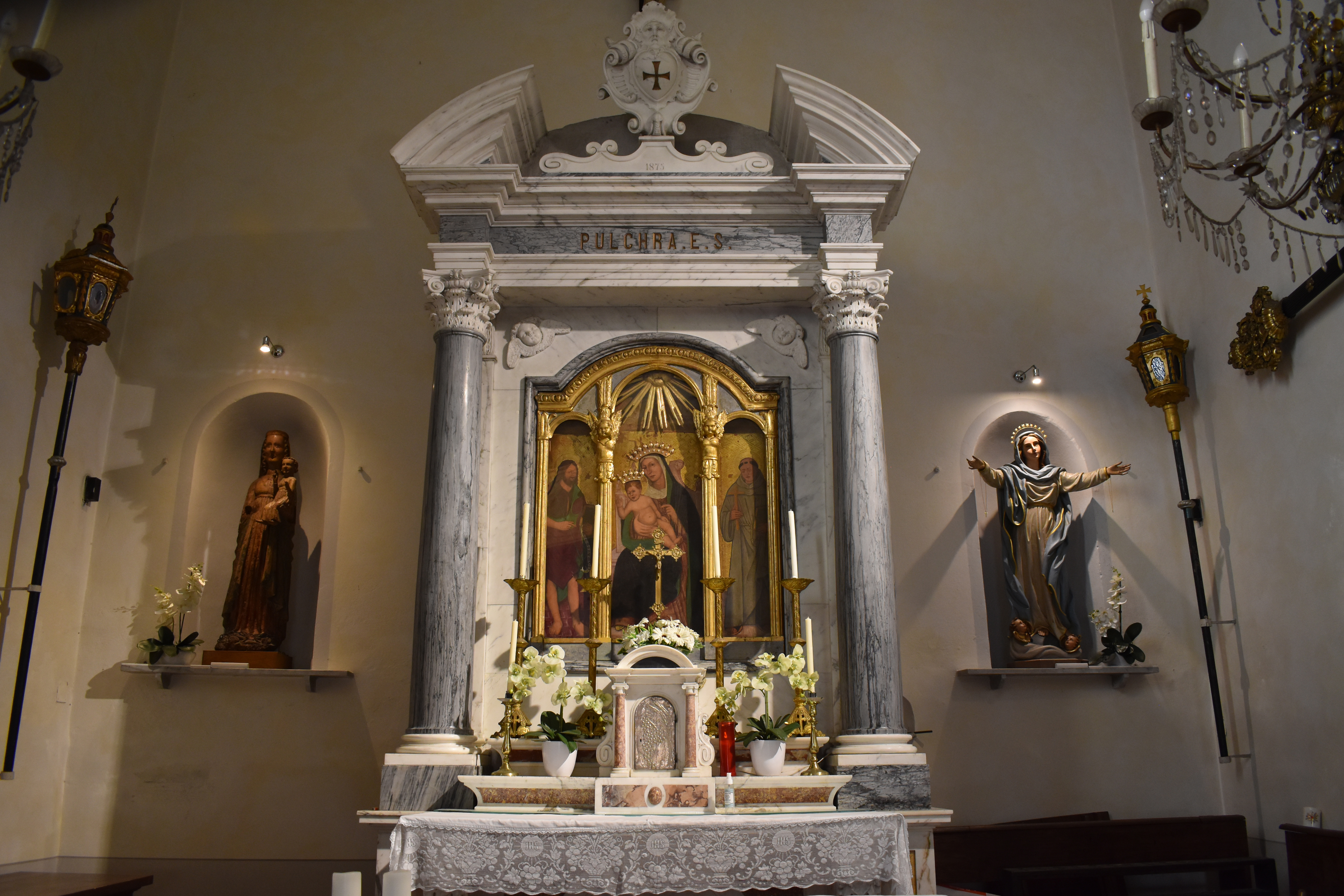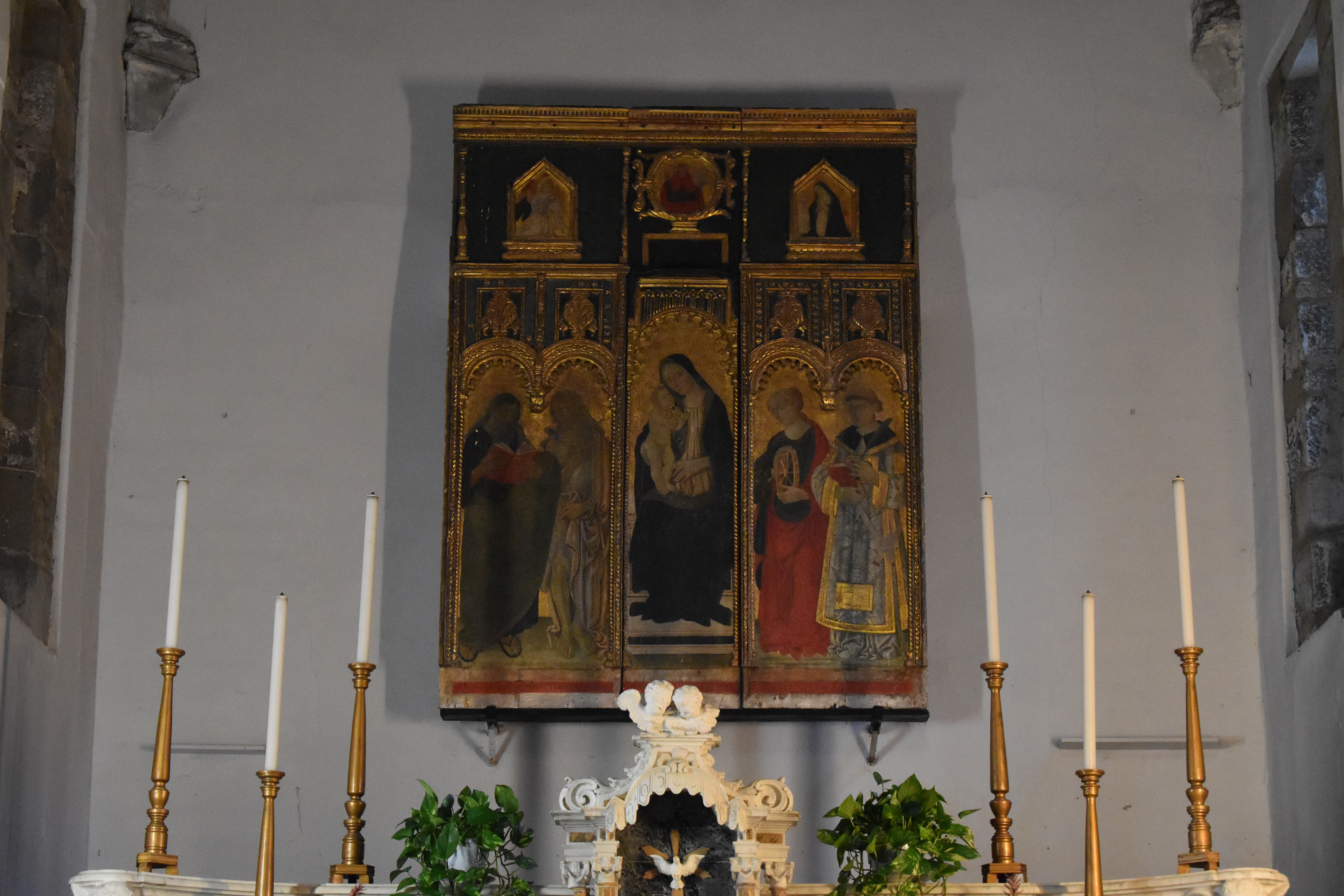 На главном алтаре находится полиптих, изображающий Мадонну с младенцем между святыми Лаврентием и Екатериной Александрийскими и двумя другими святыми, отреставрированный в 2023 году.