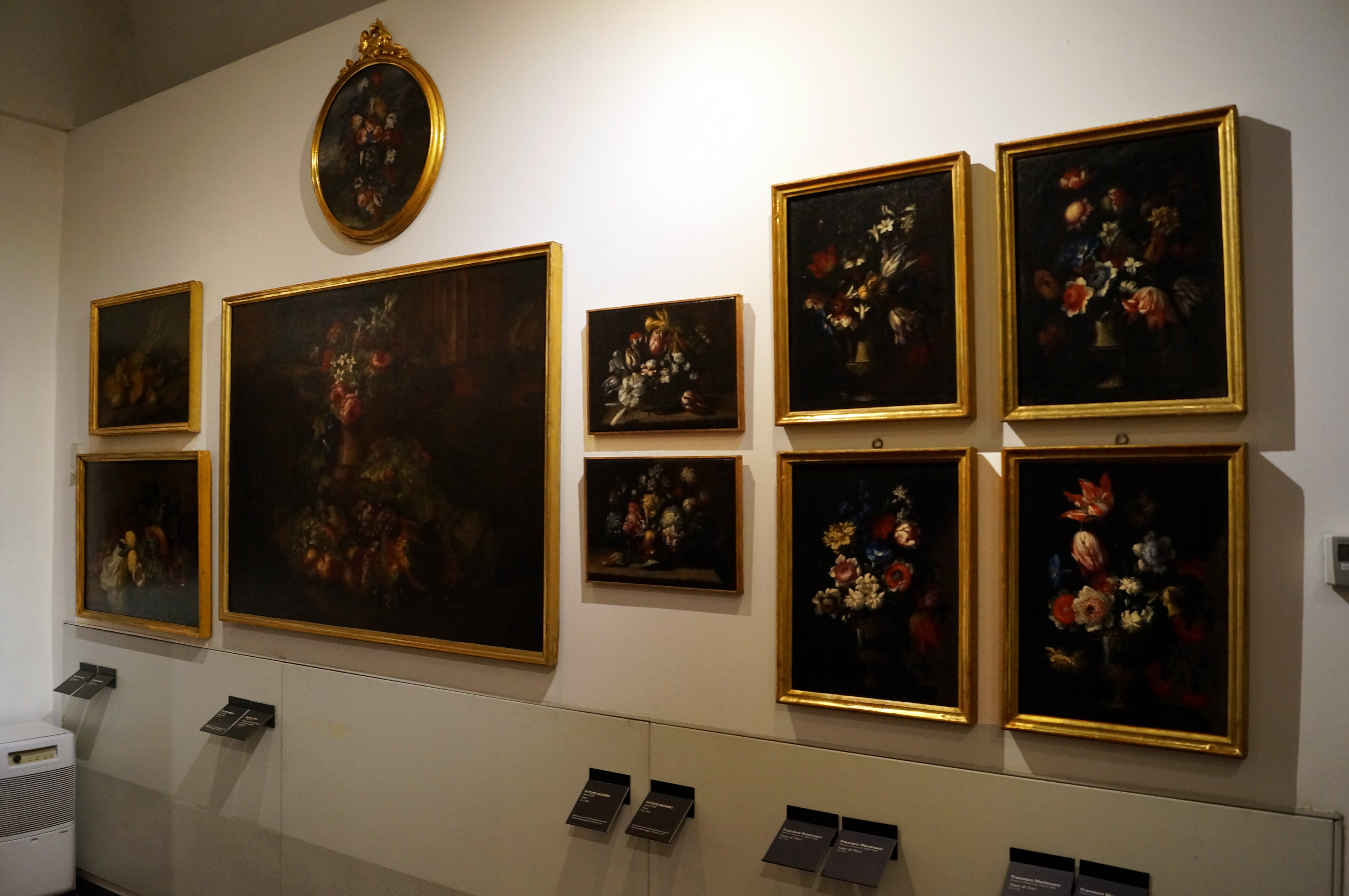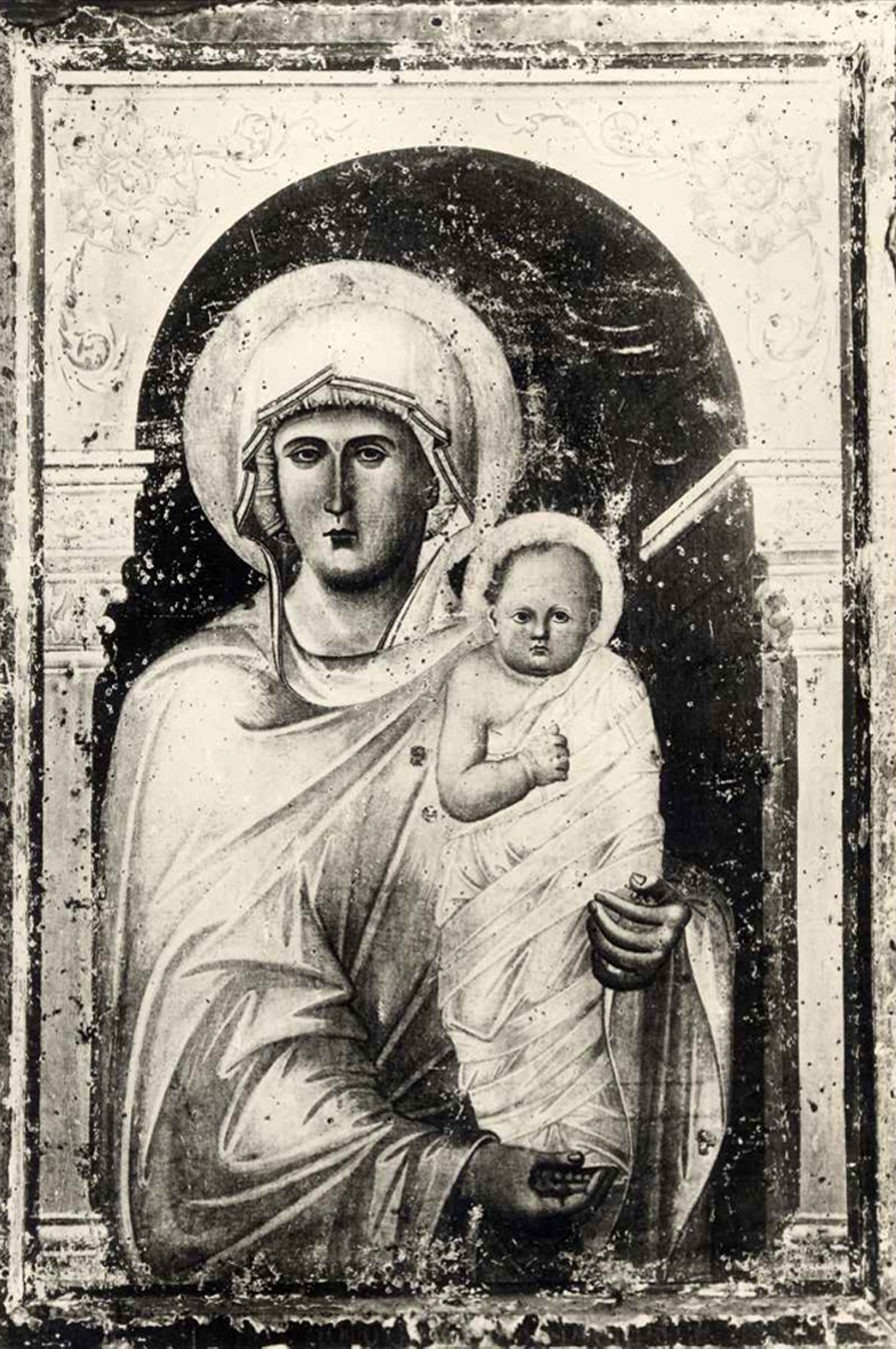 Удлинённая, нервная готическая линия Мадонны растворяется в ласковой и душевной беседе между Матерью и Сыном, обменивающихся взглядами и чувствами, о которых, по Джотто, европейская живопись и не смела думать. Группа Мадонна с Младенцем окружена двумя динамическими фигурами ангелов, держащих канделябры.