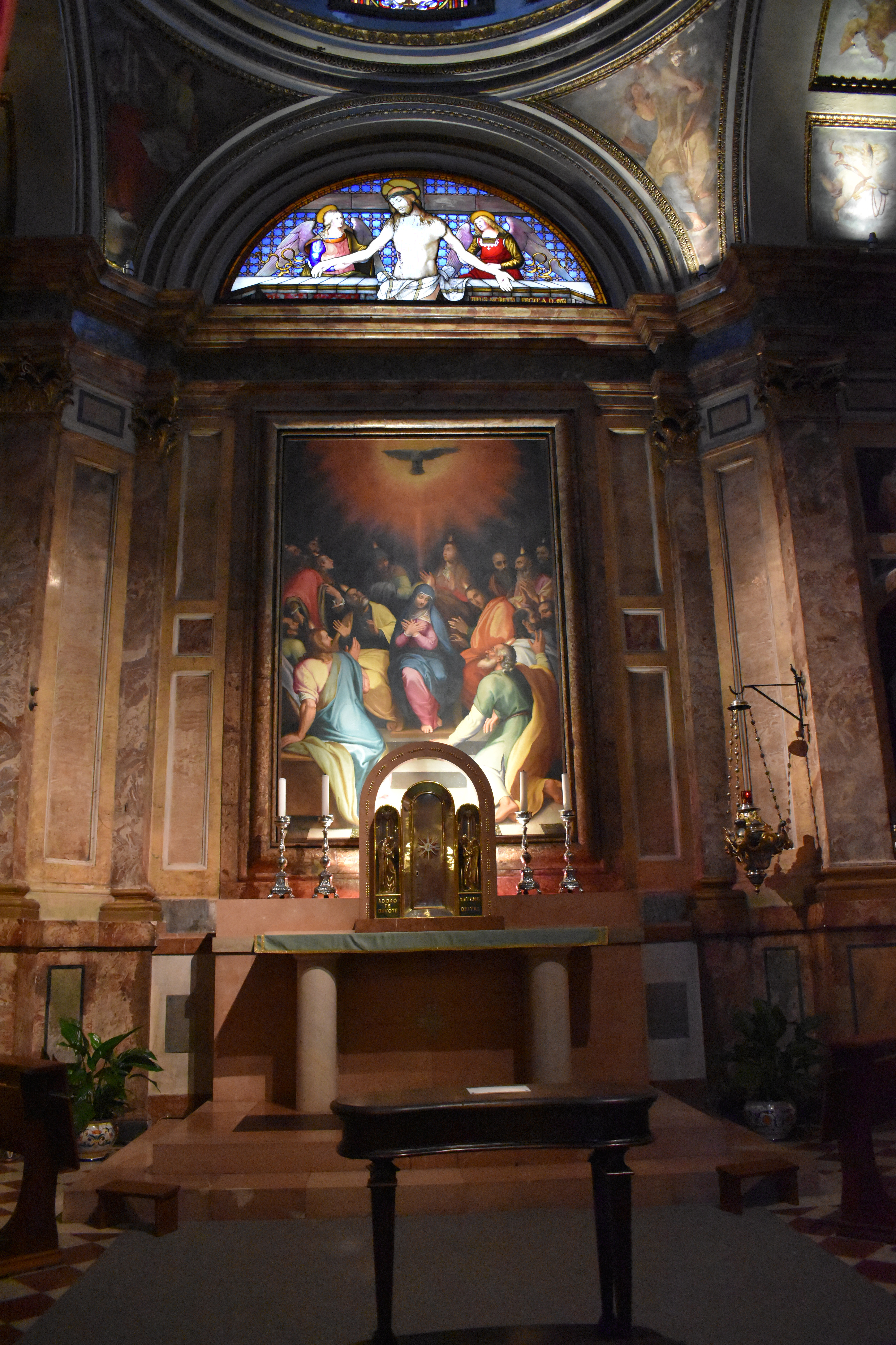 Чезаре Неббия (итал. Cesare Nebbia) написал в 1563 году алтарный образ Пятидесятницы, на котором изображён Святой Дух, нисходящий на Богородицу, апостолов, святую Марию Магдалину и святую женщину. Бородатый мужчина справа от Святой Марии Магдалины (единственная фигура без язычка пламени над головой) – портрет епископа Джулио Орадини (итал. Giulio Oradini). Памятник содержит останки папы Мартина IV, который умер в Перудже в 1285 году, а также реликвии Иннокентия III и Урбана IV.