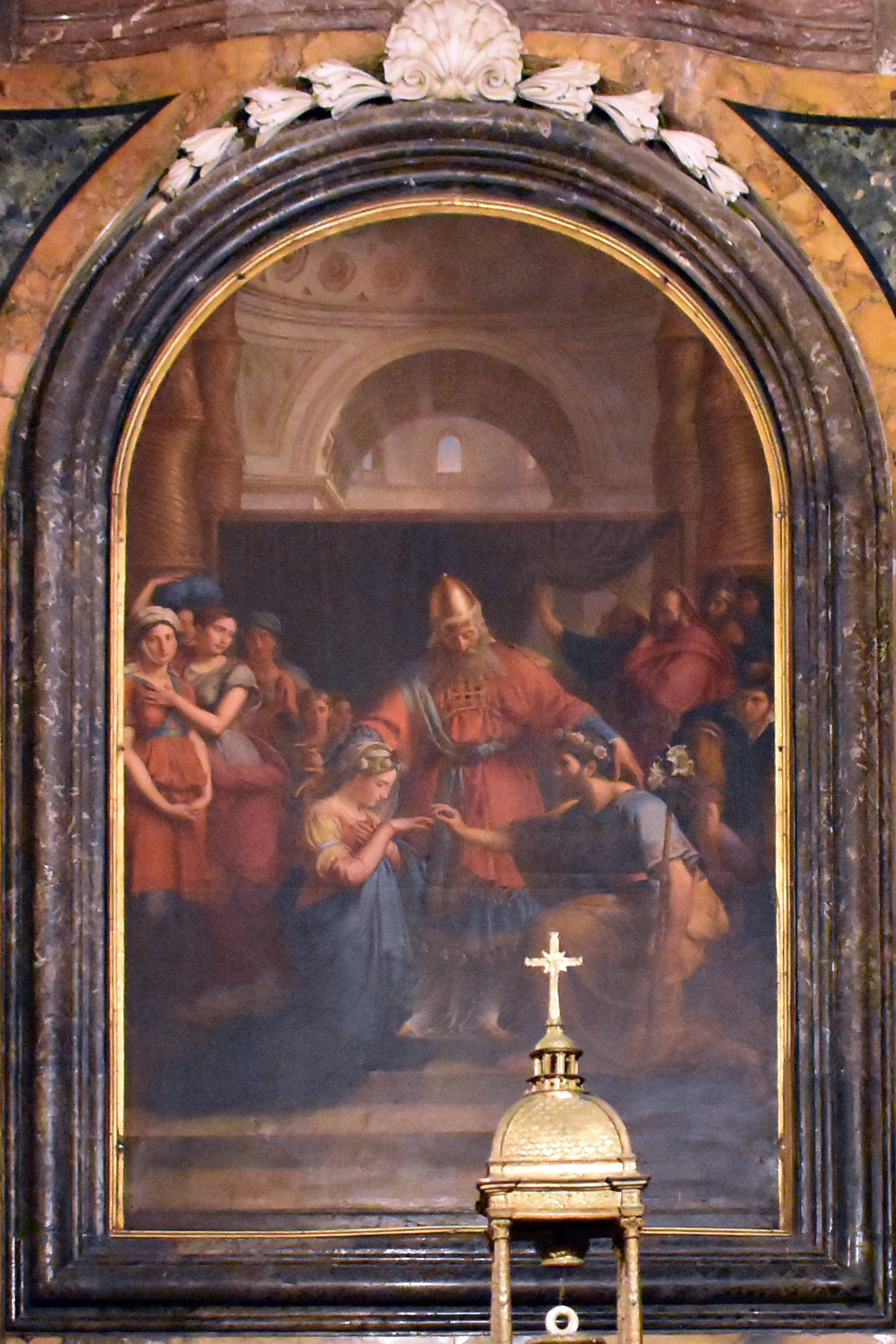 Настоятель Священной конгрегации Святого Кольца Филиппо дельи Одди (итал. Filippo degli Oddi) в 1825 году заказал написать алтарный образ "Брак Богородицы" своему другу, французскому живописцу Жану-Батисту Викару (фр. Jean-Baptiste Wicar), для замены алтаря на эту же тему, созданного в 1814 году Карлом Лабруцци (итал. Carlo Labruzzi), но не получившего одобрения духовенства. Лицо римского солдата справа – портрет самого Филиппо дельи Одди. Алтарь подвергался критике, вероятно, из-за обиды, вызванной тем фактом, что французский художник Викар принимал участие в наполеоновских конфискациях 1797 года, в число которых входил первый алтарь этой часовни, созданный кистью Перуджино. Особая критика включала тот факт, что Богородица и Святой Иосиф изображались на коленях перед еврейским священником. Говорят, что фигура святого Иосифа напоминает сатира, а женские фигуры слева – чрезмерно сладострастные.