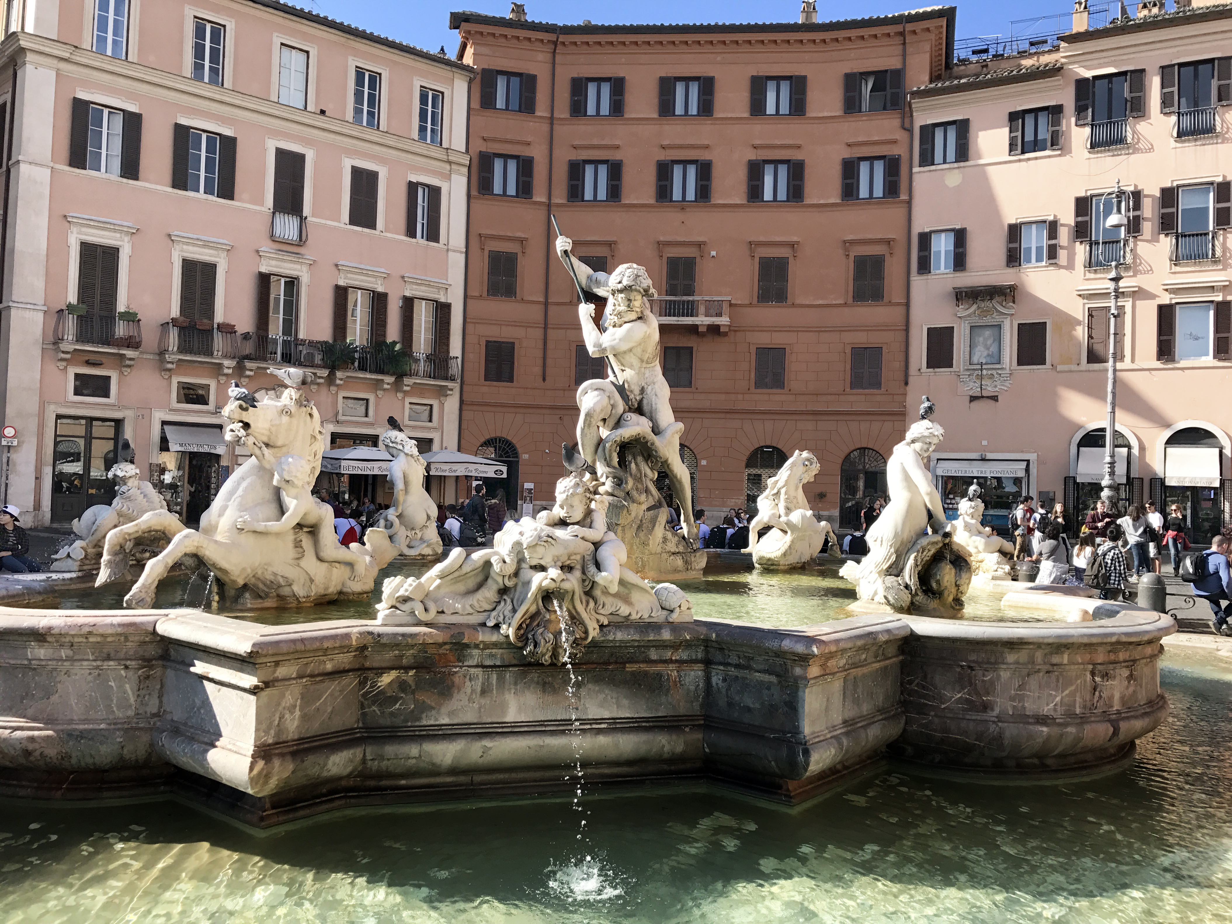 Расположены симметрично на севере и юге площади фонтаны Нептуна и Мавра были построены в 1576 году Джакомо делла Порта. В то время они были похожи на современные версии лишь расположением и формой. Фонтан Нептуна (Fountain of Neptune) в Риме выполнен в стиле нео-барокко или, как его еще называют, барокко эпохи Возрождения. По сравнению с расположенным рядом Фонтаном Четырех Рек его размеры небольшие, но задумка мастеров получилась вполне удачной и многие современники считают, что по своей красоте он не уступает творению великого Бернини. В самом центре чаши стоит скульптура Нептуна, который борется с осьминогом. В руках мифологического божества находится трезубец. Эта работа буквально переполнена мощной мужской энергетикой. Античный сюжет продолжают остальные скульптуры, расположенные по кругу. Это – амуры, нереиды и морские животные. В общей сложности, восемь скульптур, среди которых выделяются лошади, херувимы, дельфины и морские нимфы. Образы этих существ парные. Историки искусства считают, что Фонтан Нептуна был украшен для того, чтобы вписаться в общий архитектурный ансамбль площади Навона, создать симметрию с фонтаном Мавра, который располагался напротив.