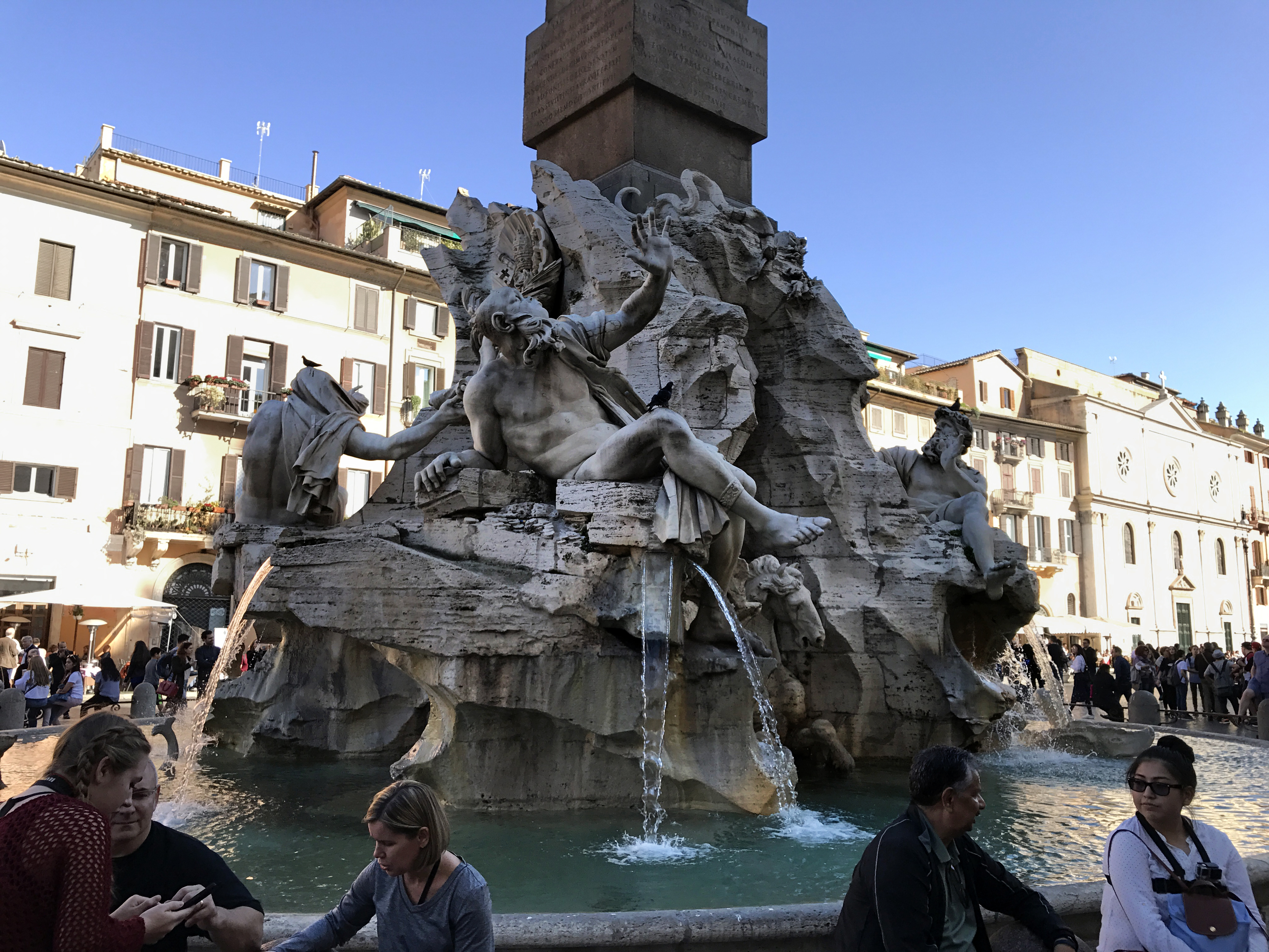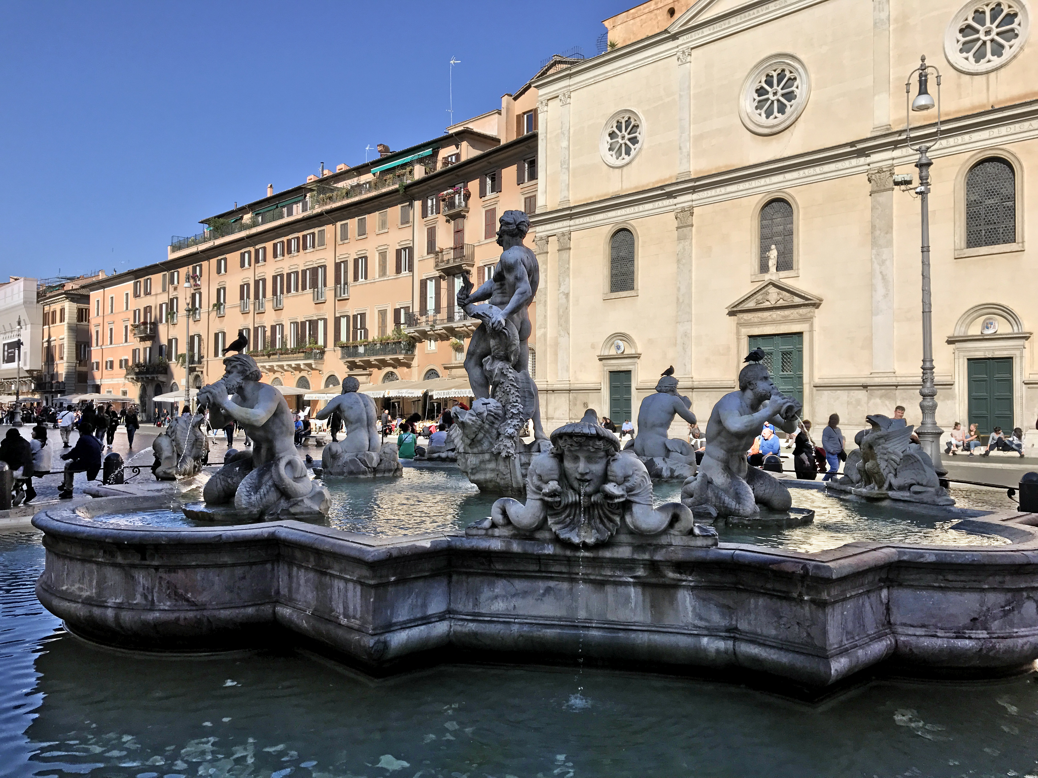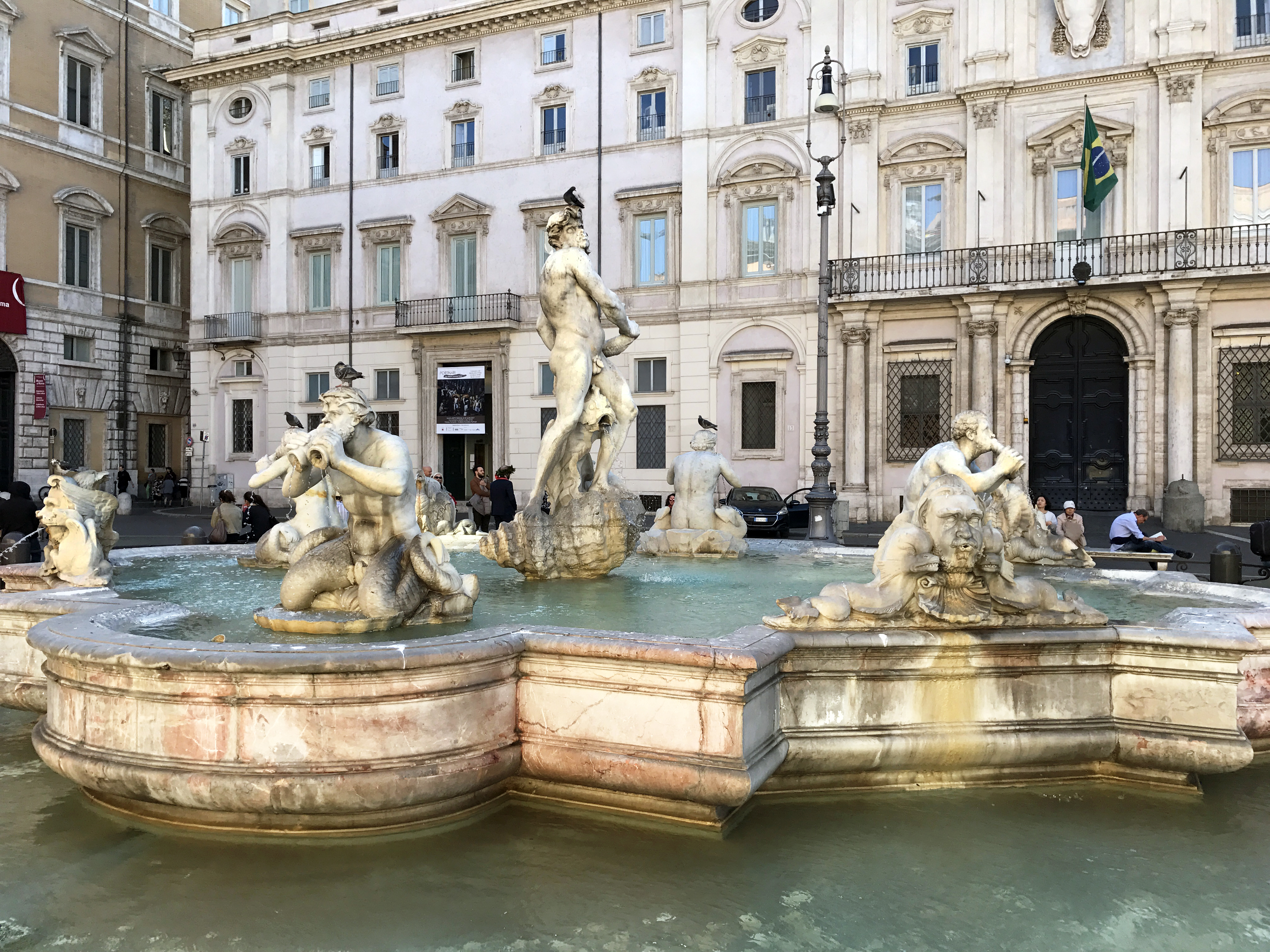 фонтан Мавра – выполнен все в том же античном стиле, который так вдохновлял ваятелей 17-18 веков. В центре установлена копия статуи Мавра проекта Бернини. Эта замена – совсем не лишняя предосторожность: в 2011 году фонтан подвергся нападению вандалов, и центральная фигура композиции была сильно изувечена. К счастью, это была только прекрасная копия.