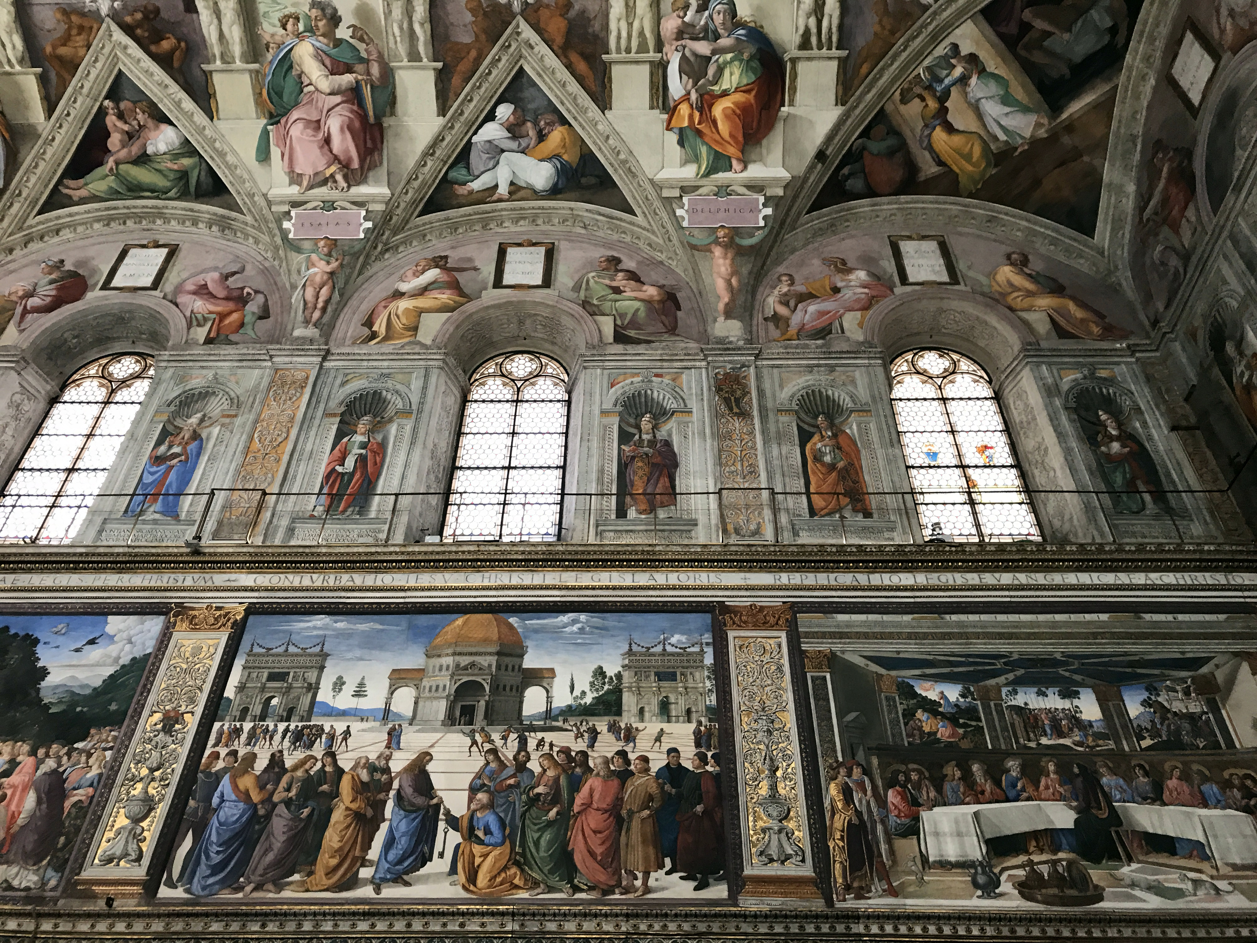Росписи входной стены изображают две заключительные сцены Историй Моисея и Христа: "Воскресение Христа" и "Диспут о теле Моисеевом". Первоначальные фрески кисти Гирландайо и Синьорелли, повреждённые в результате обрушения двери в 1522 г. были восстановлены во второй половине XVI в. На центральных панелях изображены канонизированные папы, а в люнетах – четыре Предка Христа.