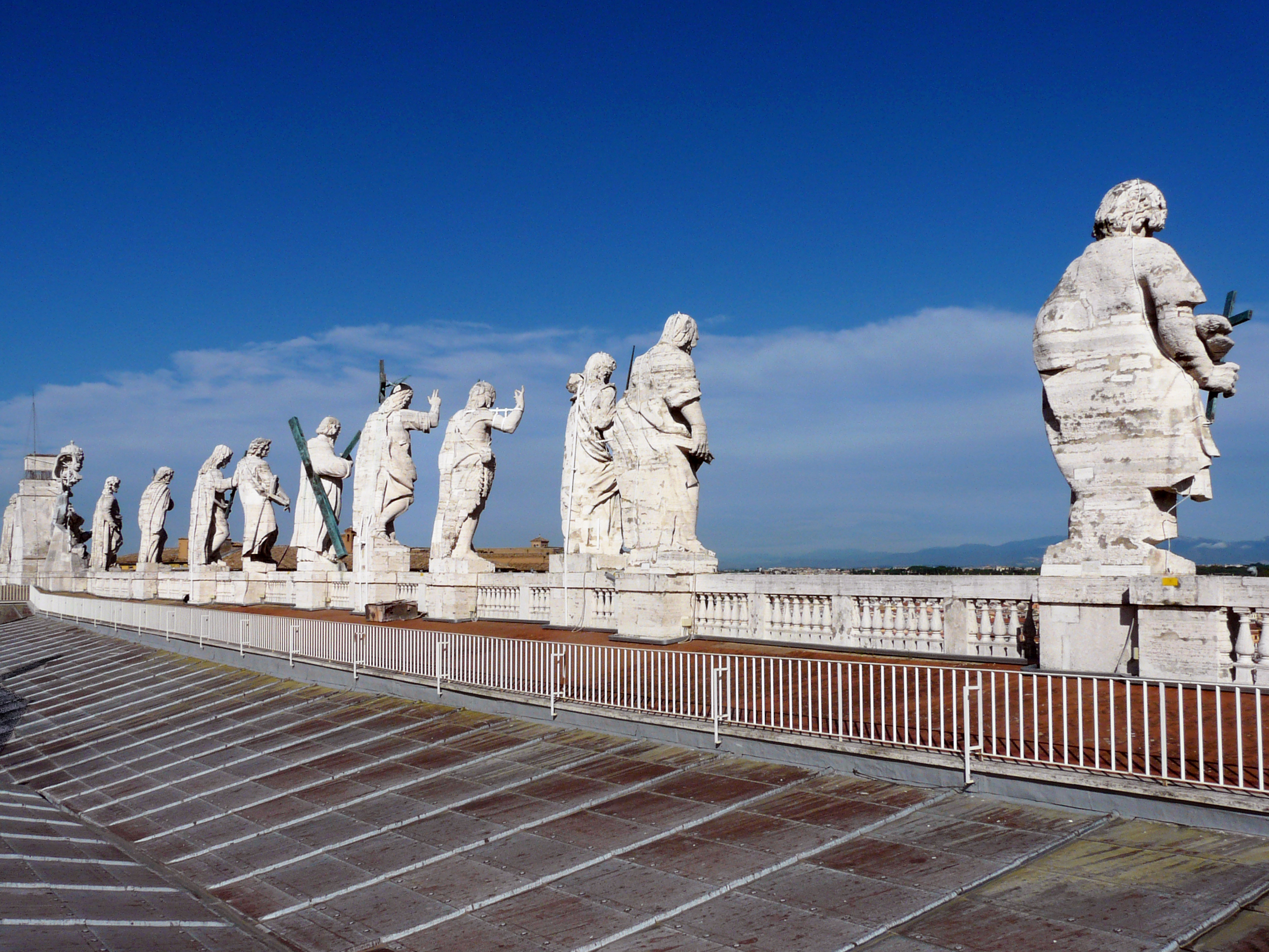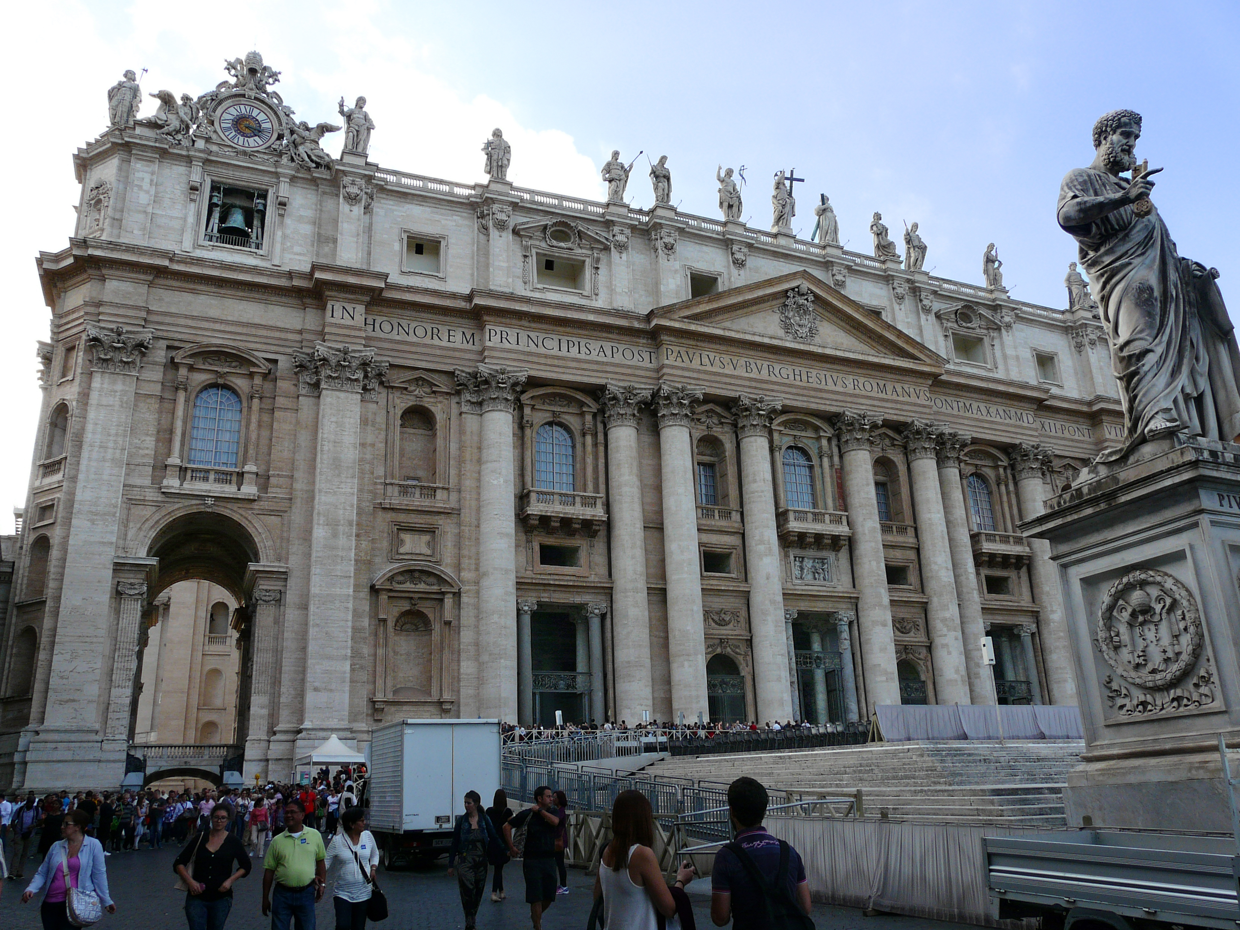 Классические колонны поддерживают аттик, увенчанный 13-ю статуями. Пятиметровая статуя Христа, в окружении Иоанна Крестителя и 11 апостолов украшают лицевую часть Собора Святого Петра.
