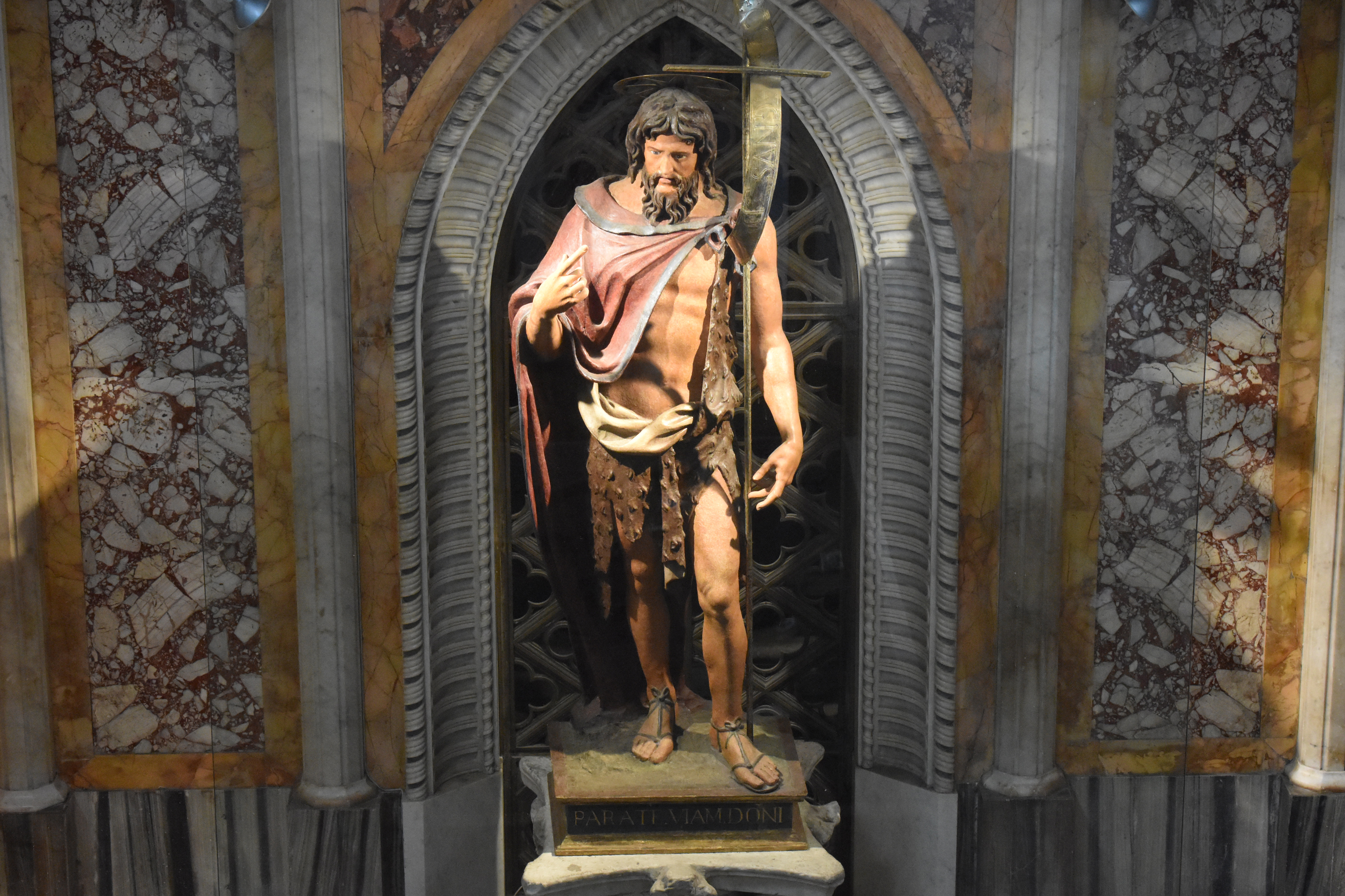 Во главе усыпальницы – деревянная статуя Святого Иоанна Крестителя работы Донато да Формелло, которую ошибочно считают работой Донателло, перенесенная из ризницы, где она стояла с 1772 года, из капеллы Святого Иоанна Крестителя в Константиновском баптистерии. В годовщину рождения Крестителя (24 июня) статую, по крайней мере до середины XX века, несли ко входу в Исповедальню, и латеранские каноники отдавали ей дань уважения, кладя на пол свои гербы. В эту же годовщину освящали и раздавали гвоздику как противоядие от малярии, свирепствовавшей в Понтинских болотах, и от зубной боли.