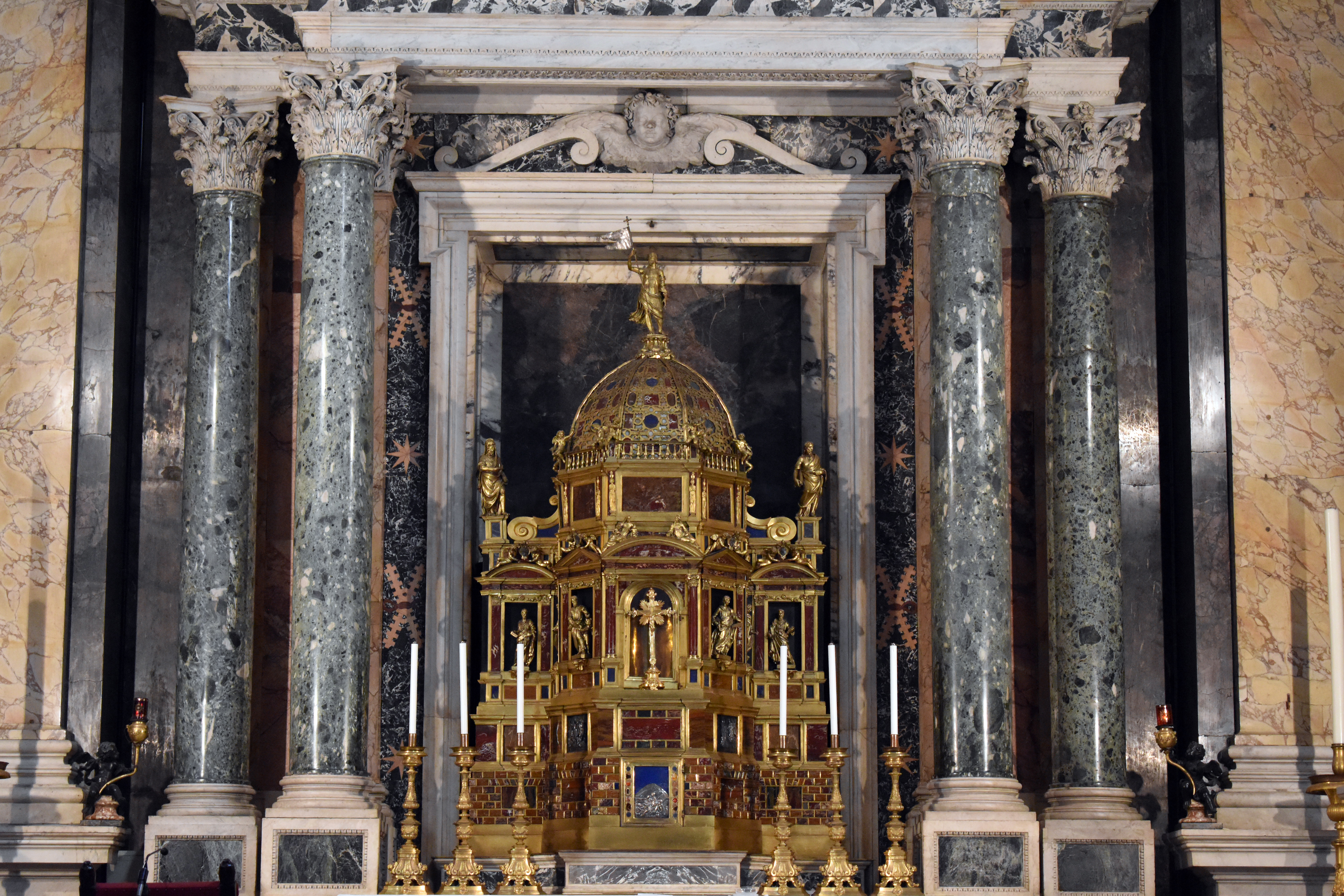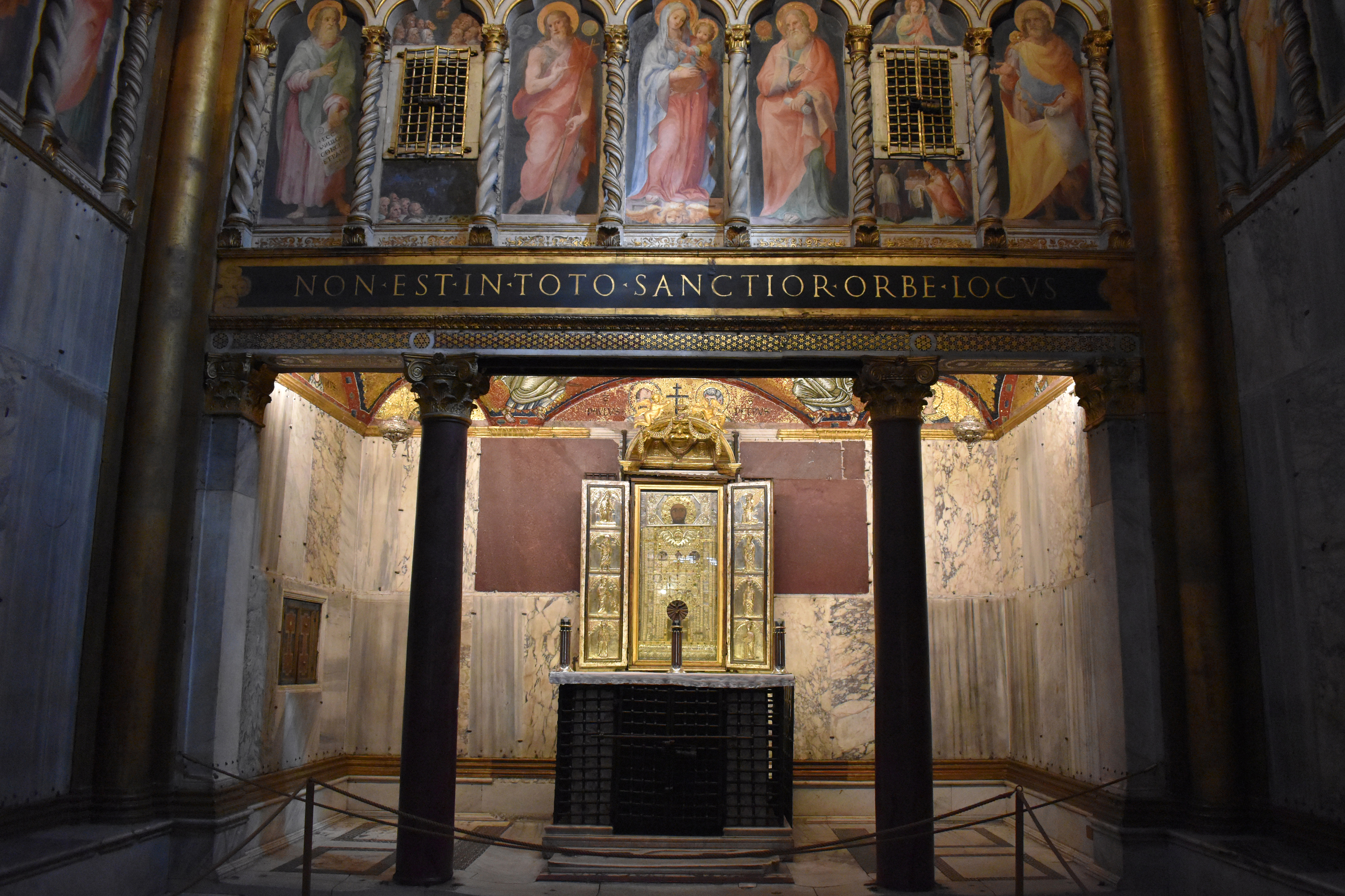 Картина "Бог-отец" на фронтоне выполнена Кристофоро Ронкалли, известным как il Pomarancio. Тимпан поддерживают четыре большие коринфские скандированные колонны из хлорированной бронзы, которые во времена Николая IV ограничивали пресвитерий, между апсидой и папским алтарем, основания и капители которых выполнены болонским скульптором Орацио Ченсоре или Ченсори. Происхождение бронзы для колонн, согласно традиции, происходит от переплавки трусских бронз из района Тарквинии и Чивитакастелланы, а также царских врат Пантеона, Иерусалимского храма, Немезиды или Юпитера Капитолина в Риме, отливки, сделанной Августом из трибун кораблей Клеопатры, или, наконец, из дворца Константина. Над капеллой возвышается большая фреска работы Кавалера д'Арпино. Римский военный инженер Помпео Таргоне спроектировал табернакль – восьмиугольный храм из позолоченной бронзы, украшенный драгоценными камнями, стоимость которых оценивается в 22 000 золотых скуди, – фланкированный четырьмя колоннами античного зеленого цвета, принадлежащими древней базилике.