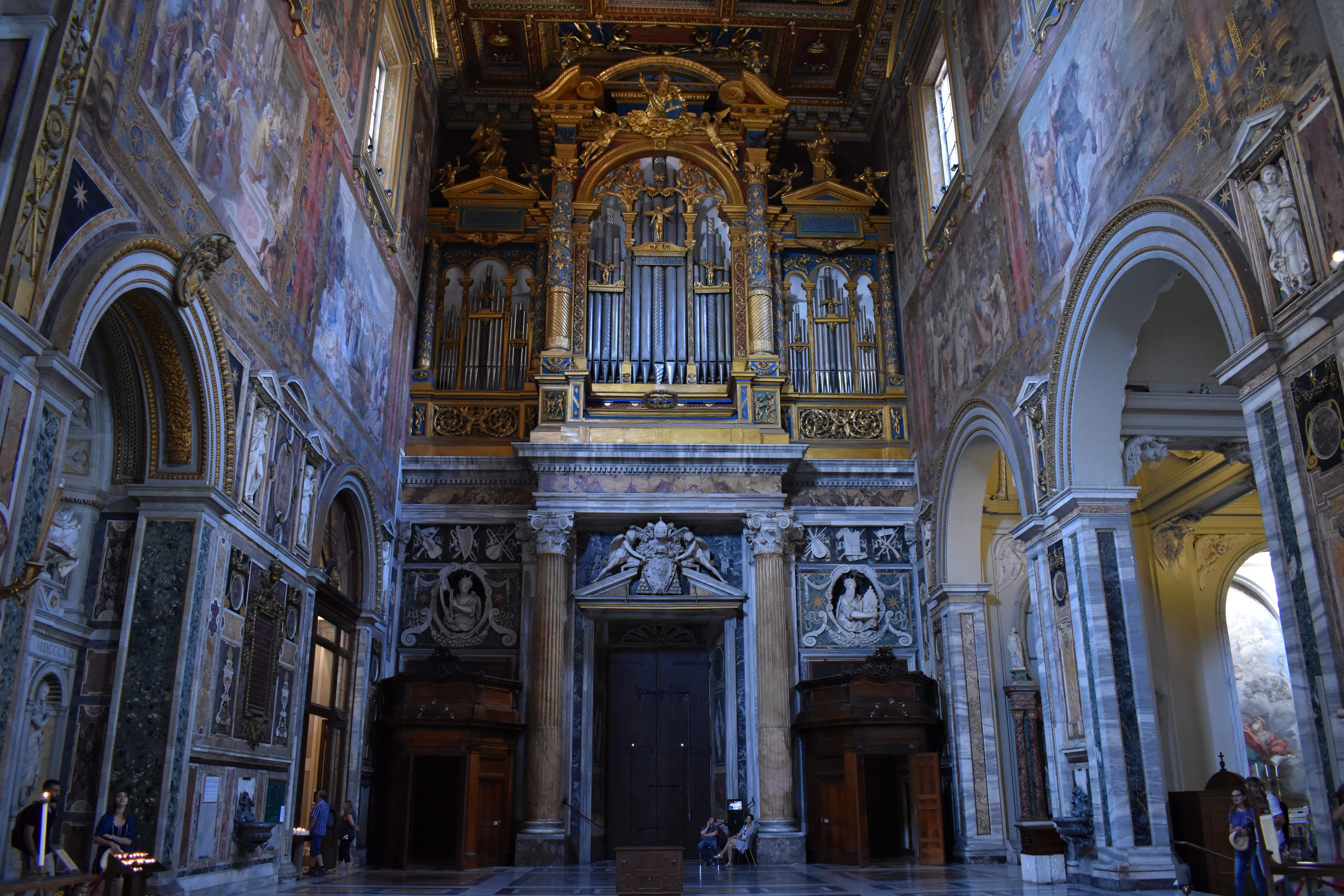 На северной стене над тремя порталами возвышается орган в стиле барокко (Лука Блази - 1599 г.). Это самый большой монументальный орган в Италии, а также самый старый из тех, что находятся в Риме. На этом органе играли также Джироламо Фрескобальди и Георг Фридрих Гендель. Декор с ангелами-музыкантами из позолоченного дерева выполнен Джованни Баттиста Монтано. Две рифленые колонны, поддерживающие галерею органа, окрашены в античный жёлтый цвет. Их высота составляет 8 м, и, судя по всему, они происходят из Форума Траяна. Над центральной дверью изображен герб папы Климента VIII, поддерживаемый двумя ангелами (работа Джованни Антонио Паракка, известного как Вальсольдо), а ниши над боковыми дверями занимают бюсты царя Давида с арфой (работа Франческо Альдини) и пророка Езекии с органом (работа Амброджио Буонвичино).