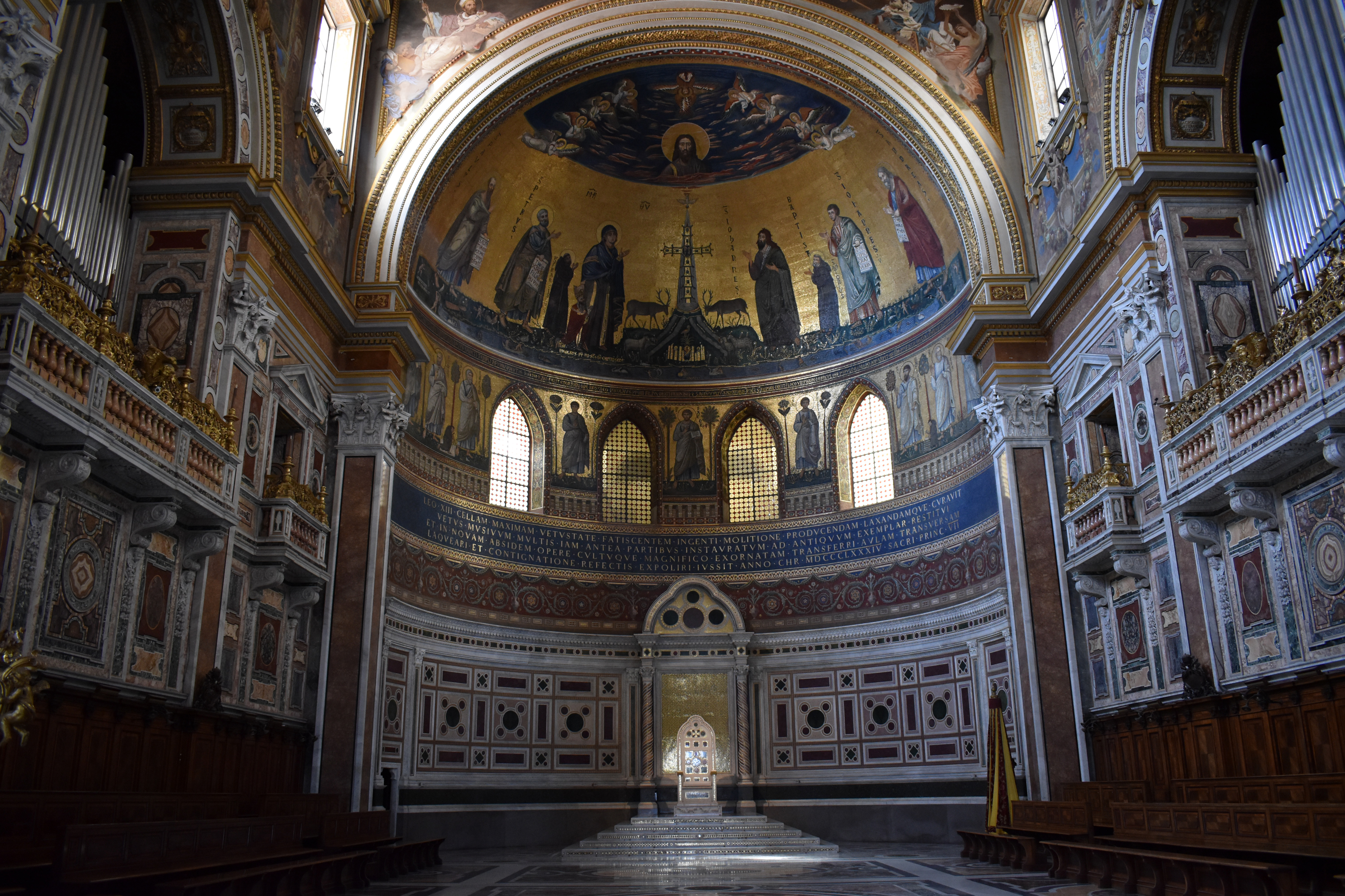 Папа Лев XIII (1878-1903) восстановил древнюю апсиду базилики, разрушив возведенную с амвоном в конце XIII века Николаем IV (1288-1292). Нынешней апсиде предшествует помещение для размещения хора. Новый хор, богато украшенный фресками, лепниной и полихромным мрамором, содержит шесть хоровых кафедр, по три с каждой стороны, с частью труб органа базилики. В чаше апсиды находится огромная мозаика с изображением Богородицы, представляющей коленопреклонённого покровителя Николая IV, святых Павла, Петра, Франциска Ассизского, Иоанна Крестителя, Антония Падуанского, Иоанна Евангелиста и Андрея. В центре мозаики – Крест Христа и голубь Святого Духа. Мозаика была выполнена Якопо Торрити и Якопо да Камерино, которые включили в неё более древнее изображение Спасителя. Нынешний образ – реконструкция, выполненная мозаичистами Льва XIII, которые лишь повторно использовали золотые мозаичные плитки фона. О работе, проделанной Львом XIII, свидетельствует мозаичная надпись, которая проходит под готическими окнами. В конце апсиды находится папское кресло, репродукция XIX века косматескного кресла, которое сейчас можно увидеть в клуатре, украшенное различными полихромными мраморами и барельефами.
