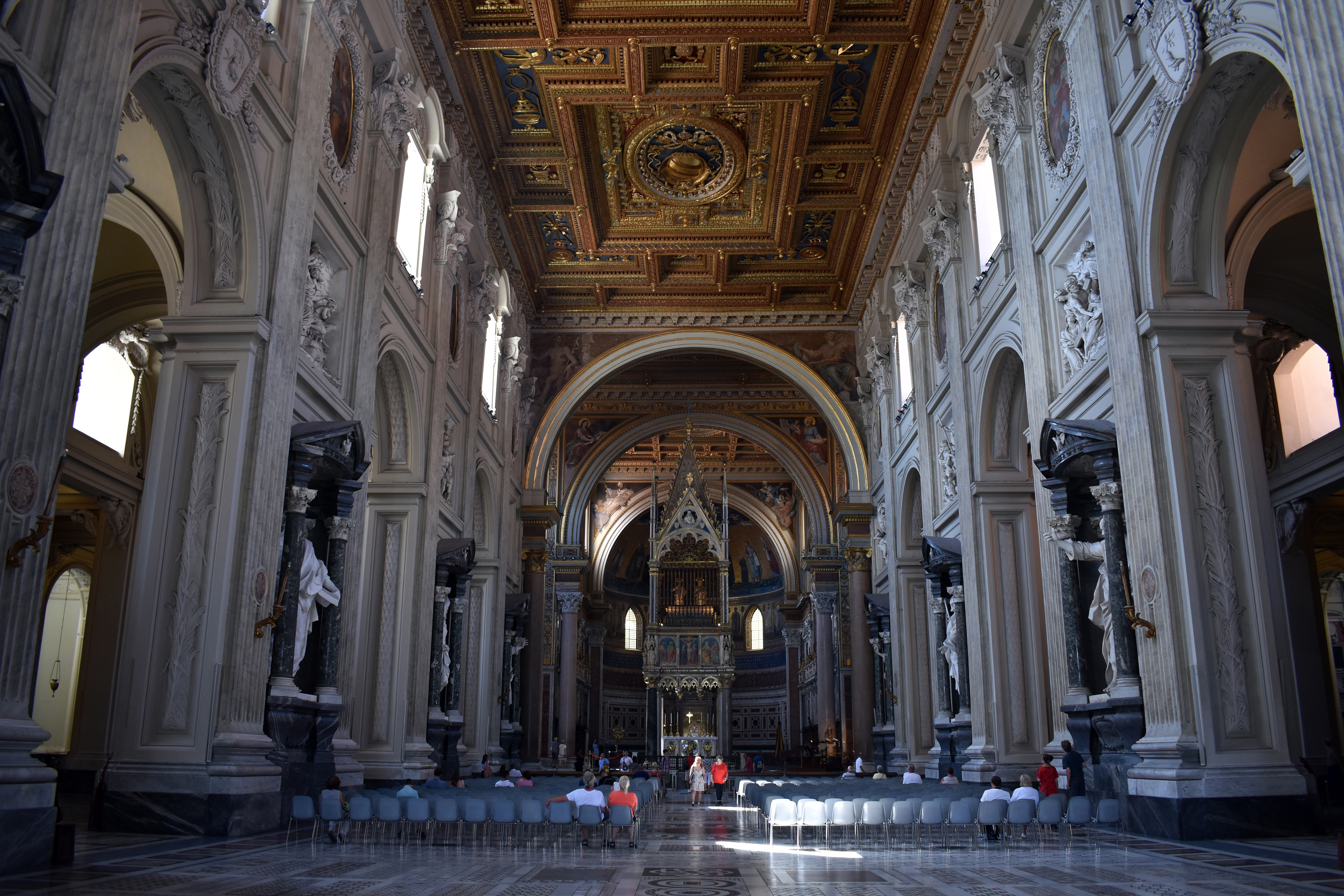 Базилика Сан-Джованни имеет пять нефов. В центральном нефе базилики, ограниченном тридцатью колоннами, после пожара 15 июня 1307 года появились первые каменные колонны. Из первоначальных колонн только семь остались неповрежденными. Пожар 21 августа 1361 года ухудшил ситуацию в здании, разрушив скинию и четыре колонны из яшмы, но семь выживших смогли поддержать антаблемент, а 42 колонны из зеленого мрамора с элегантными капителями продолжали ограничивать четыре боковых нефа до 1638 года. Урбан V (1362-1370) отправился из Авиньона в Рим для обеспечения сохранности Святых Глав апостолов Петра и Павла, хранящихся в капелле Sancta Sanctorum. Понтифик решил поручить их хранение латеранскому духовенству. Если центральный неф имеет кессонное перекрытие, а два соседних – небольшие купола, то крайние нефы имеют плоский потолок и разделены пилястрами на квадратные и прямоугольные пролеты.