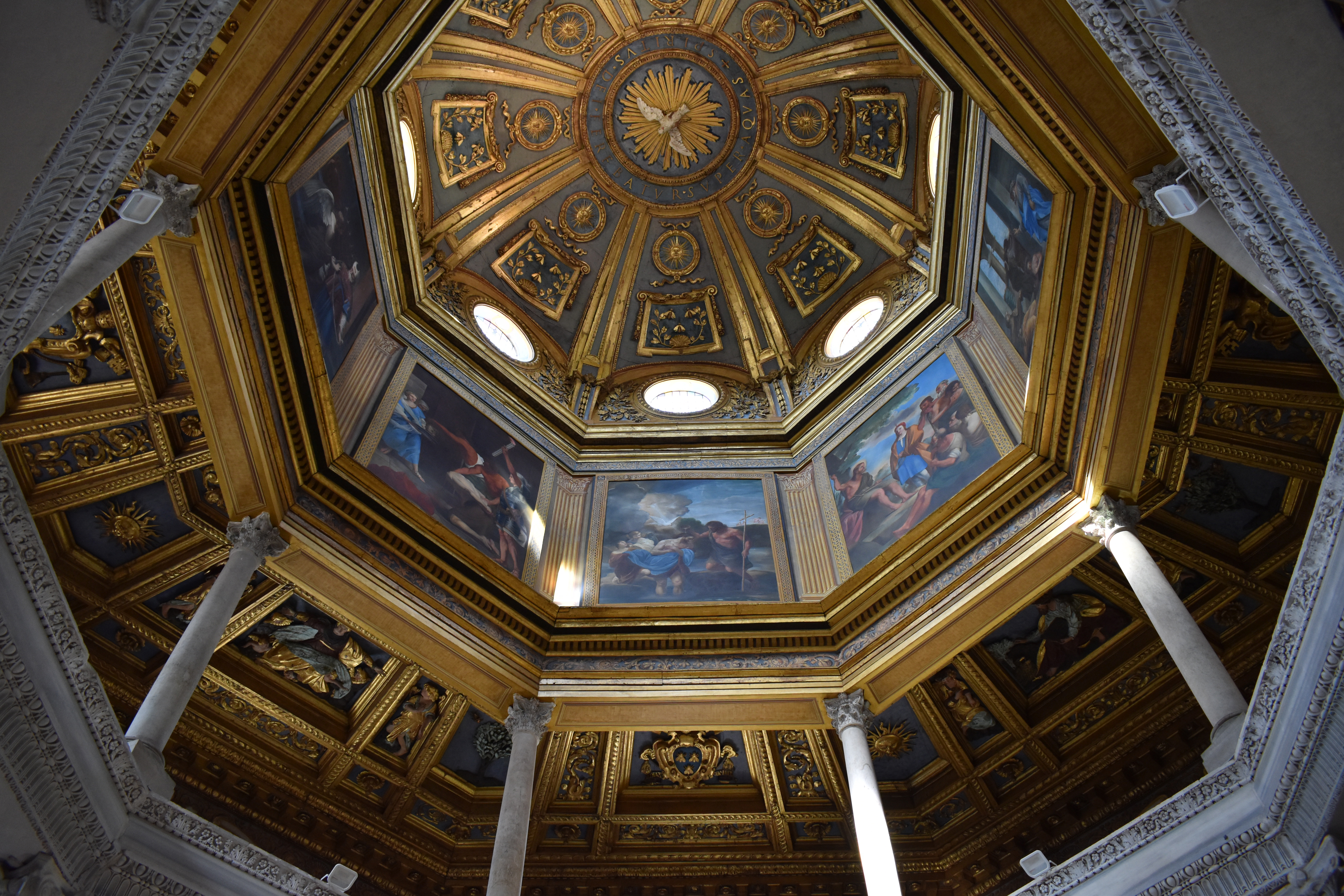 Переступив сегодня порог входа со стороны площади, сразу же предстает во всей своей полноте барочный интерьер баптистерия, демонстрируя на полу большой герб с пчелами Урбана VIII Барберини, папы, которому мы обязаны циклом фресок, идущих вдоль стен с эпизодами из жизни Константина (написанных разными художниками, включая Карло Маратту). Вместо этого Павел III Фарнезе заменил мозаики, исчезнувшие во время разграбления Рима в 1527 году, в кольцевом своде позолоченным деревянным потолком с полихромными резными символами, фризами и фигурами: Успение Девы Марии, Иисус Спаситель, Святой Иоанн Креститель и Святой Иоанн Евангелист.