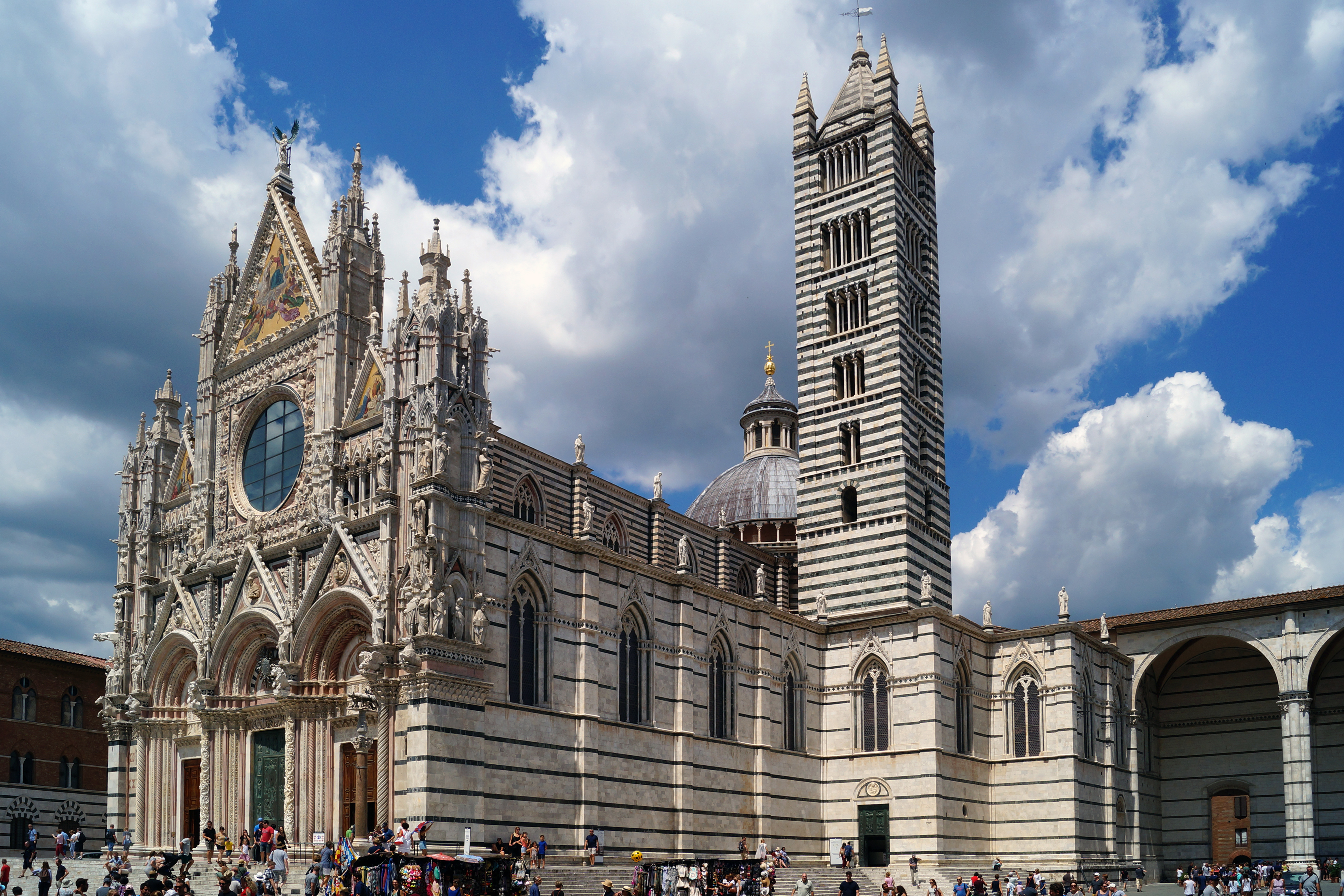 Возведение собора, посвящённого Вознесению Девы Марии, было начато в середине XII векапосле сноса старинной церкви, построенной, в свою очередь, на развалинах старинного римского храма, посвящённого Минерве. В 1215 году структурная часть здания была практически завершена, а вот возведение купола пришлось ждать до середины столетия, когда в город прибыл Никколо из Апулии – скульптор, более известный широкой публике как Никколо Пизано, хотя в его оригинальном имени яснее просматриваюся причины его тяготения к классическим образцам, характерных для художественных вкусов двора апулийского короля Фридриха II. Идея организации фасада в виде "галереи скульптур" принадлежит сыну Никколо Джованни, работавшему над проектом с 1285 по 1296 год. Оригинальные скульптуры, в целях обеспечения их сохранности, переданы в Музей произведений Дуомо и заменены копиями. Из оригинальных элементов фасада на прежнем месте остался лишь архитрав с Историями Иокима и Анны, работы Тино ди Камаино, в то время как вставки в тимпанах трёх ворот с бюстами блаженных Джованни Коломбини, Амброджио Санседони и Андреа Галлерани, работы Томмаза Реди, относятся к XVII веку. Они создавались по эскизам Джованни ди Чекко, в то время как мозаики, украшающие три шпиля, датируются 1877 годом.
