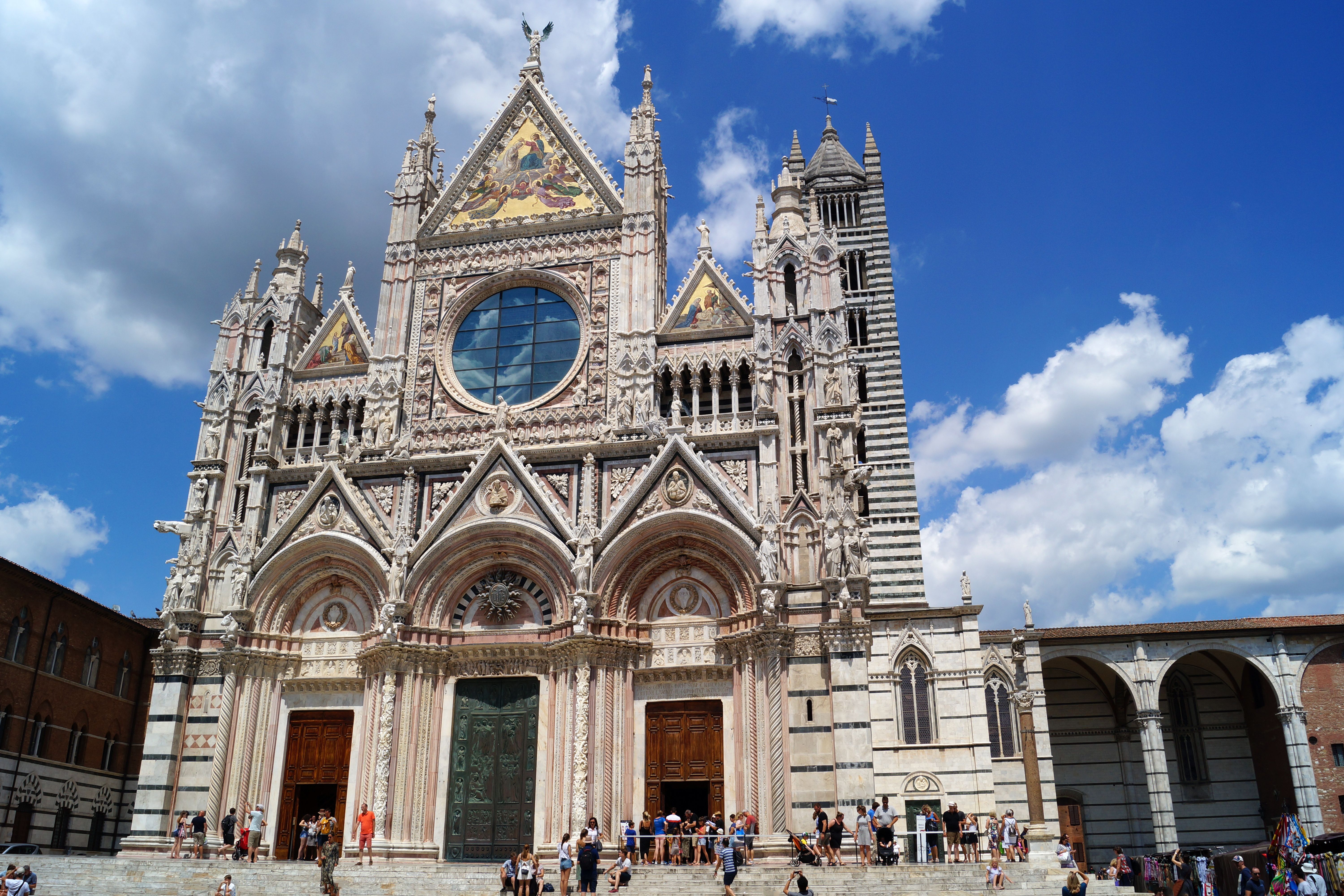 Такими впечатлениями о Сиенском соборе поделился американский писатель Генри Джеймс в своей книге очерков "Итальянские часы" (1873-1909). Утончённая чувствительность Джеймса и исключительность его литературного стиля вновь поражают нас в описании Сиенского собора, образ которого как живой встаёт перед внутренним взором читателя. Не менее искусно писатель смог передать свои впечатления от реставрации, проводившейся в то время, когда Джеймсу неоднократно доводилось останавливаться в городе – пусть он и не полностью одобрял её результаты, тем не менее отмечал, насколько сильно она улучшила облик Собора. Но самым изумительным в своей филигранной точности представляется определение, данное фасаду – "произведение ювелирного искусства из камня", предвосхищающее все последующие исследования касательно фундаментальной роли сиенских мастеров ювелирного дела в формировании художественных вкусов конца XIII и начала следующего, XIV века – периода, когда создавались скульптуры фронтальной части здания.