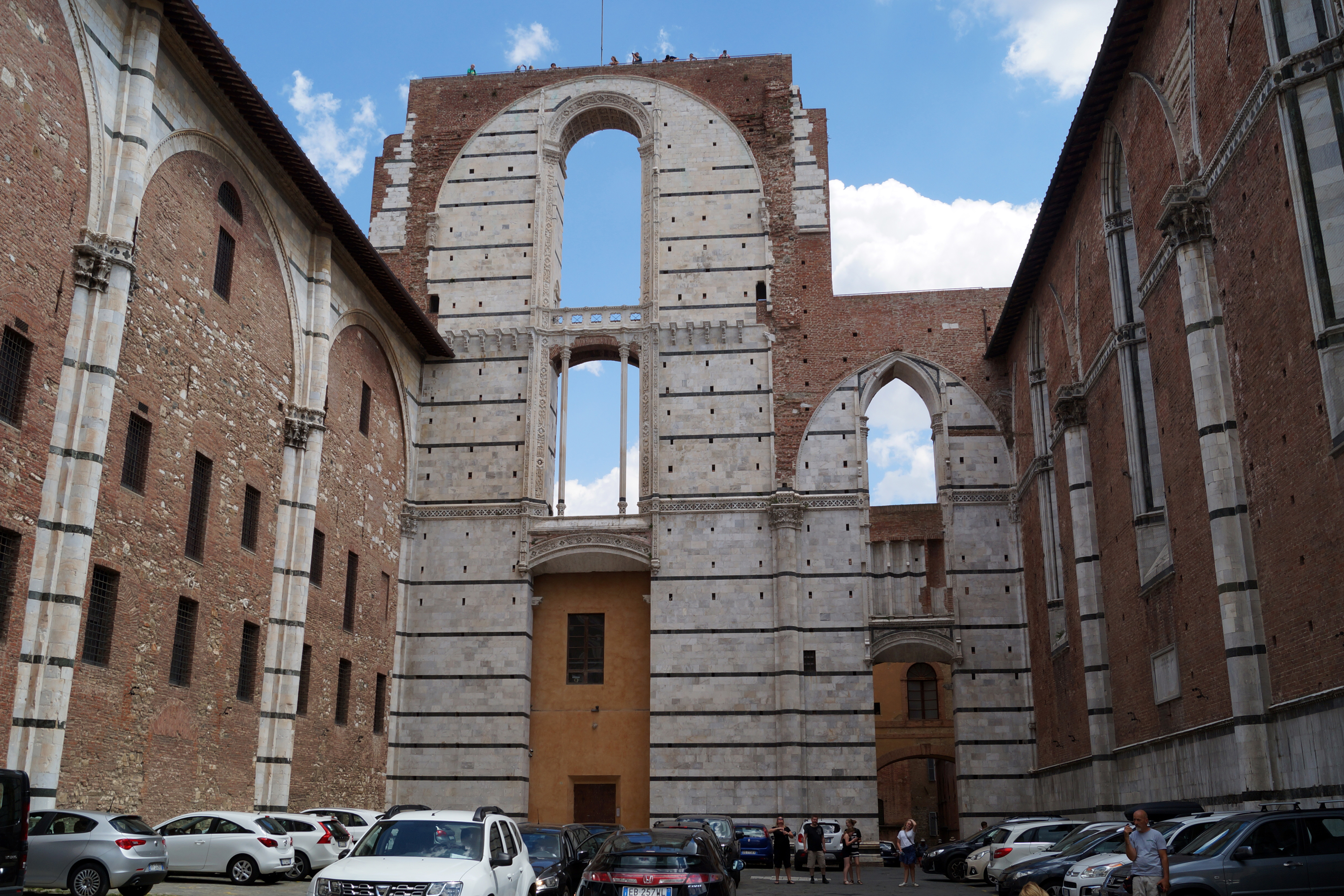 Но честолюбивые замыслы сиенцев прервала нагрянувшая чума 1348 г., унесшая жизни множества горожан. Тогда же произошло разрушение нескольких новых фрагментов собора из-за серьезных конструктивных недостатков. Поэтому в июне 1357 г. правительство республики не только было вынуждено временно прекратить работы, но и предписало разрушить части здания, находившиеся в аварийном состоянии. От грандиозного храма остались стоять под открытым небом лишь колонны трех нефов, незавершенный фасад и часть левого крыла, с изумительной дверью.