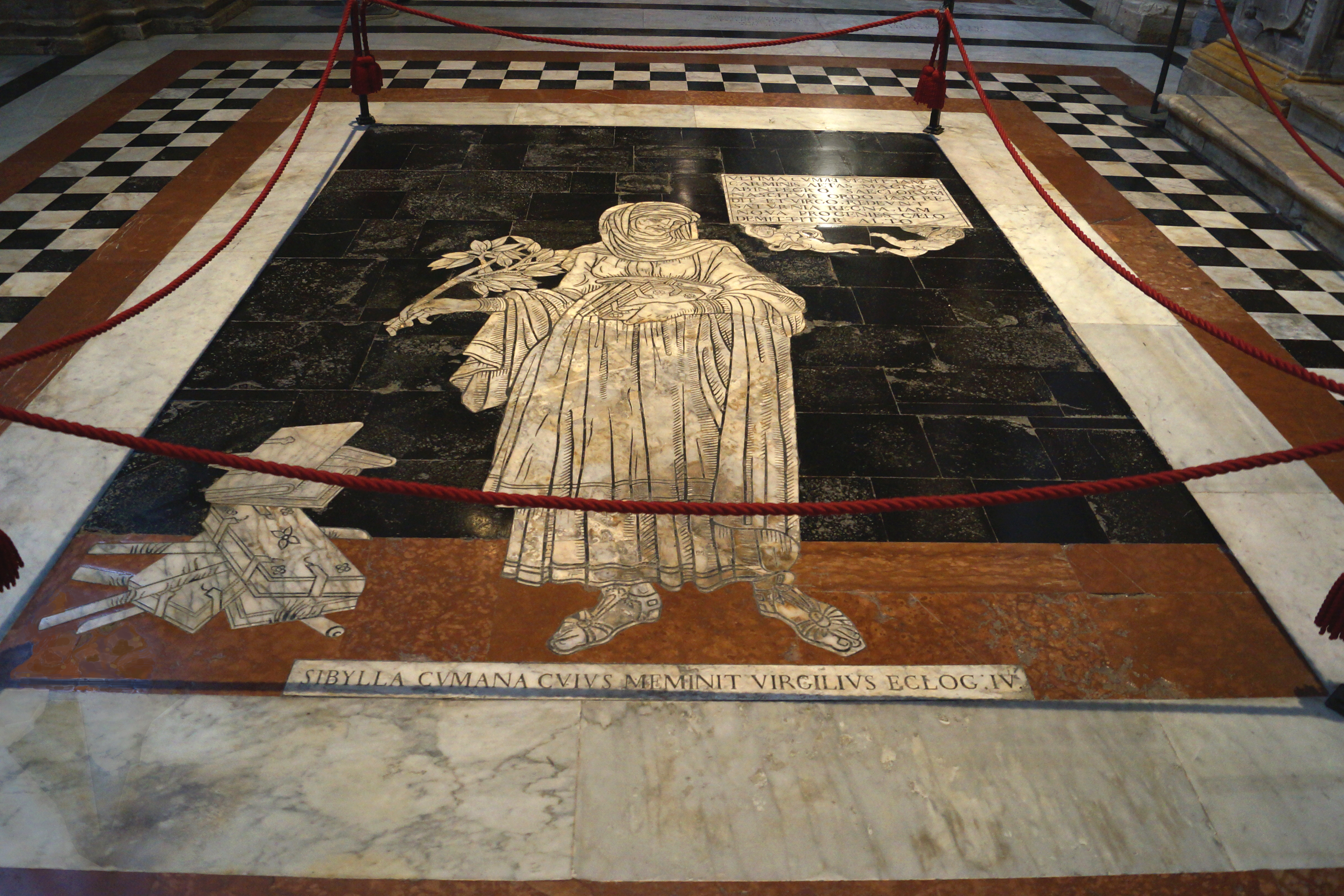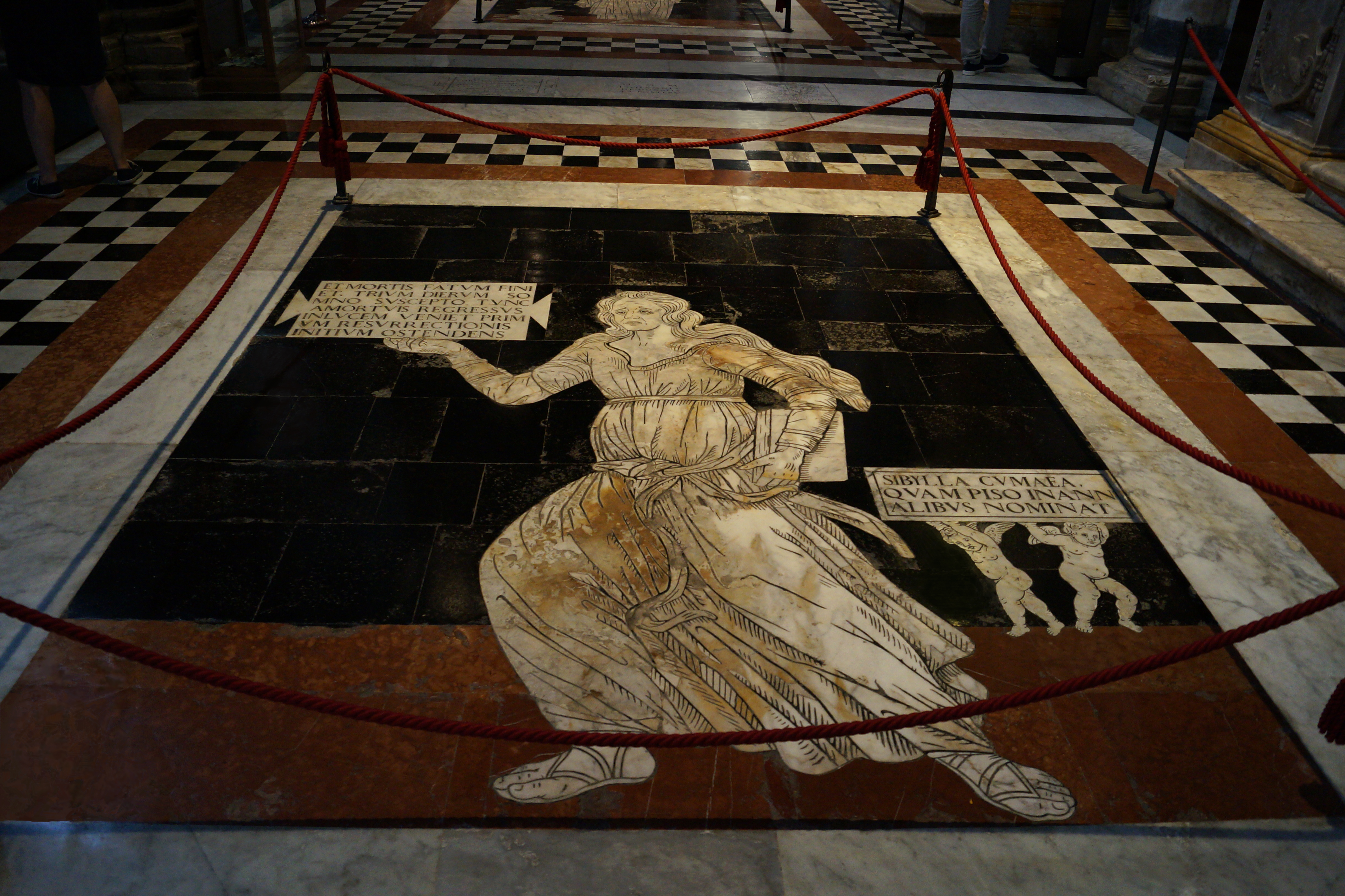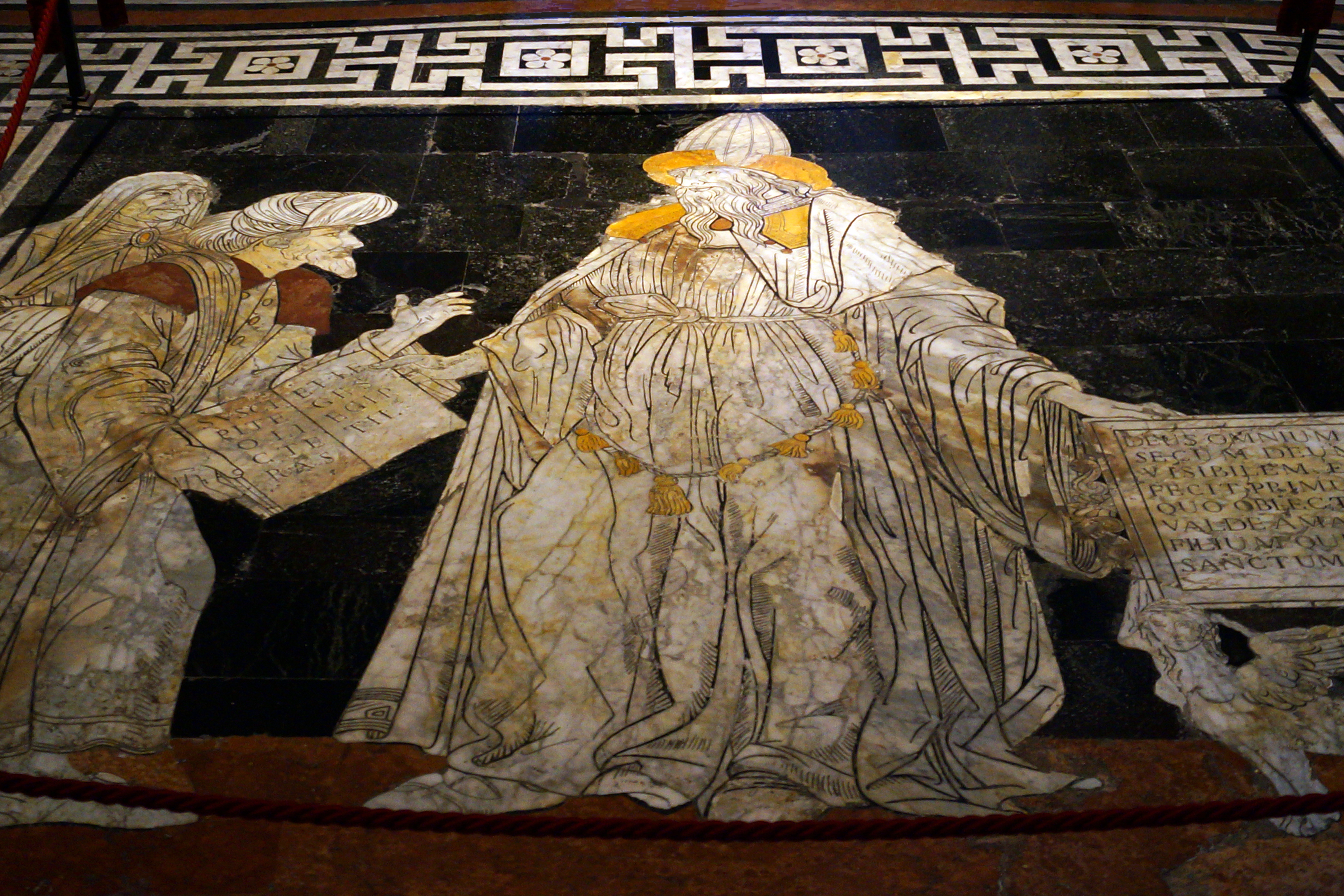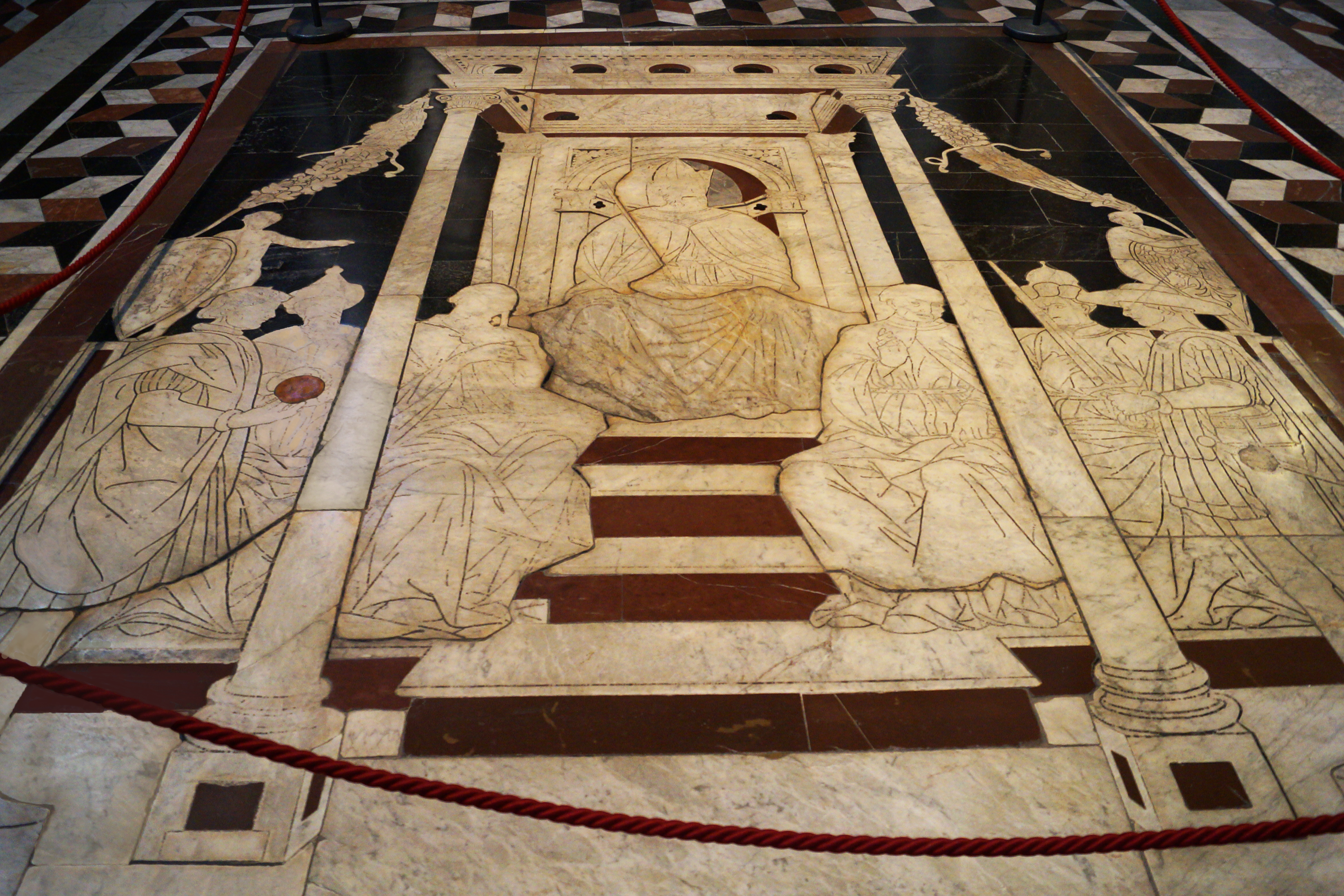 Напольное панно Мудрость и Фортуна, выполненое мастером Паоло Маннуччи в 1505 году, возможно, по замыслу Пинтуриккьо (автора фресок в библиотеке Пикколомини). Фортуна в правом нижнем углу одной ногой опирается на шар, а другой – на корабль со сломанной мачтой. В руках у Фортуны надутый ветром парус. Странники в центре взбираются мимо ядовитых змей на гору. Их цель – Мудрость на вершине горы, у неё в руках книга и пальмовая ветвь. По правую руку Мудрости стоит Сократ, который считался мучеником-философом, по левую – Кратет Фиванский, философ-циник, ради обладания мудростью выбрасывающий в море земные богатства.