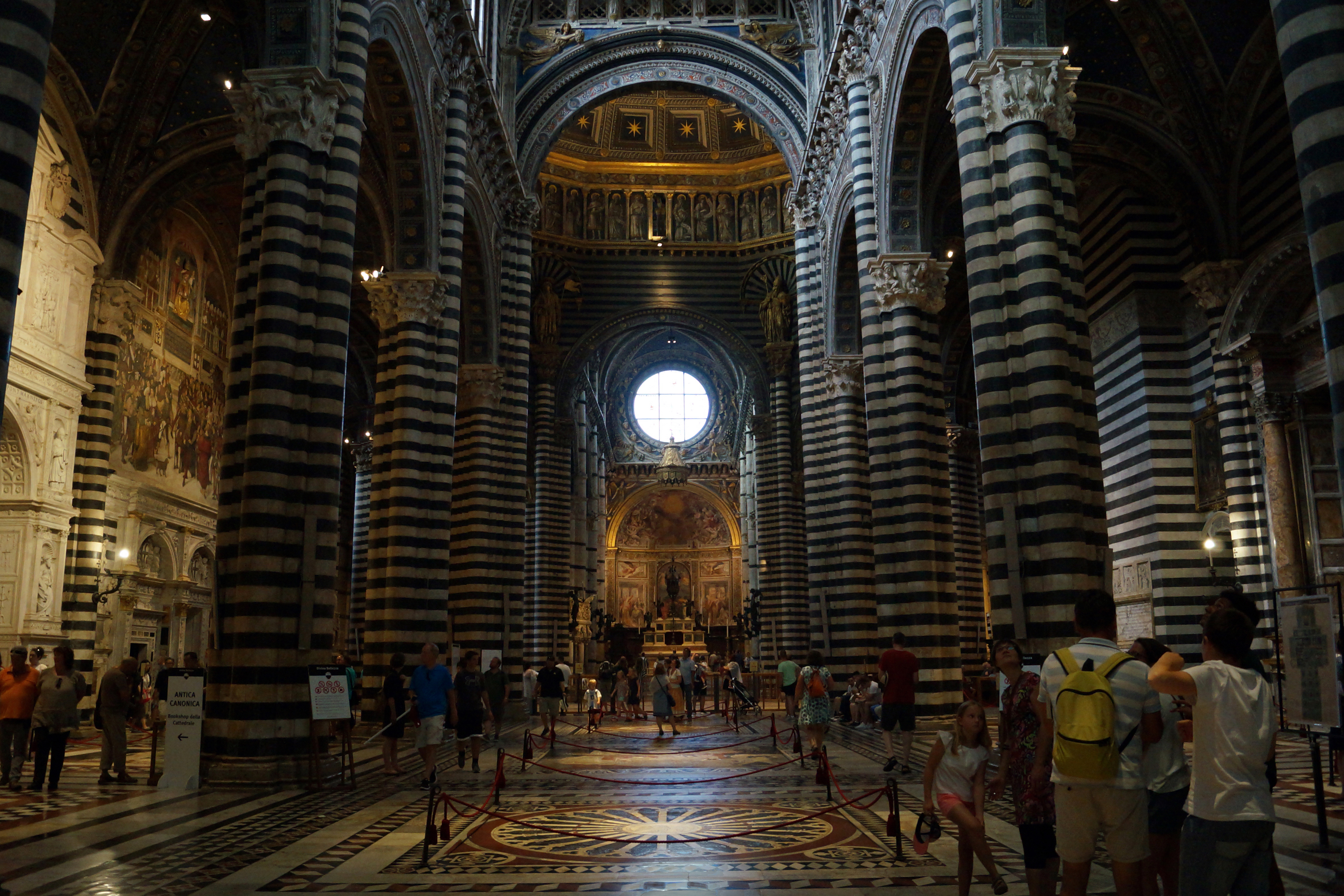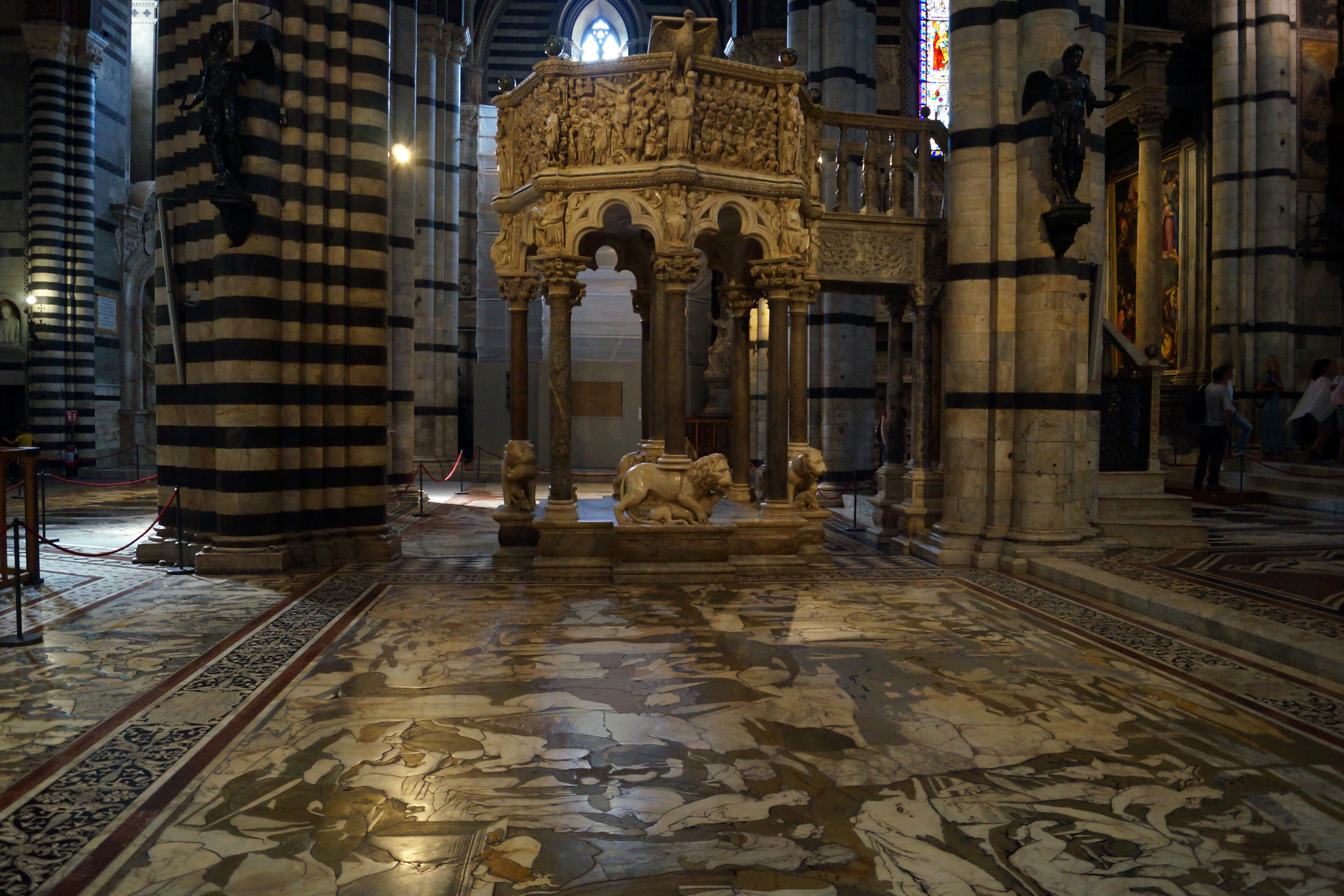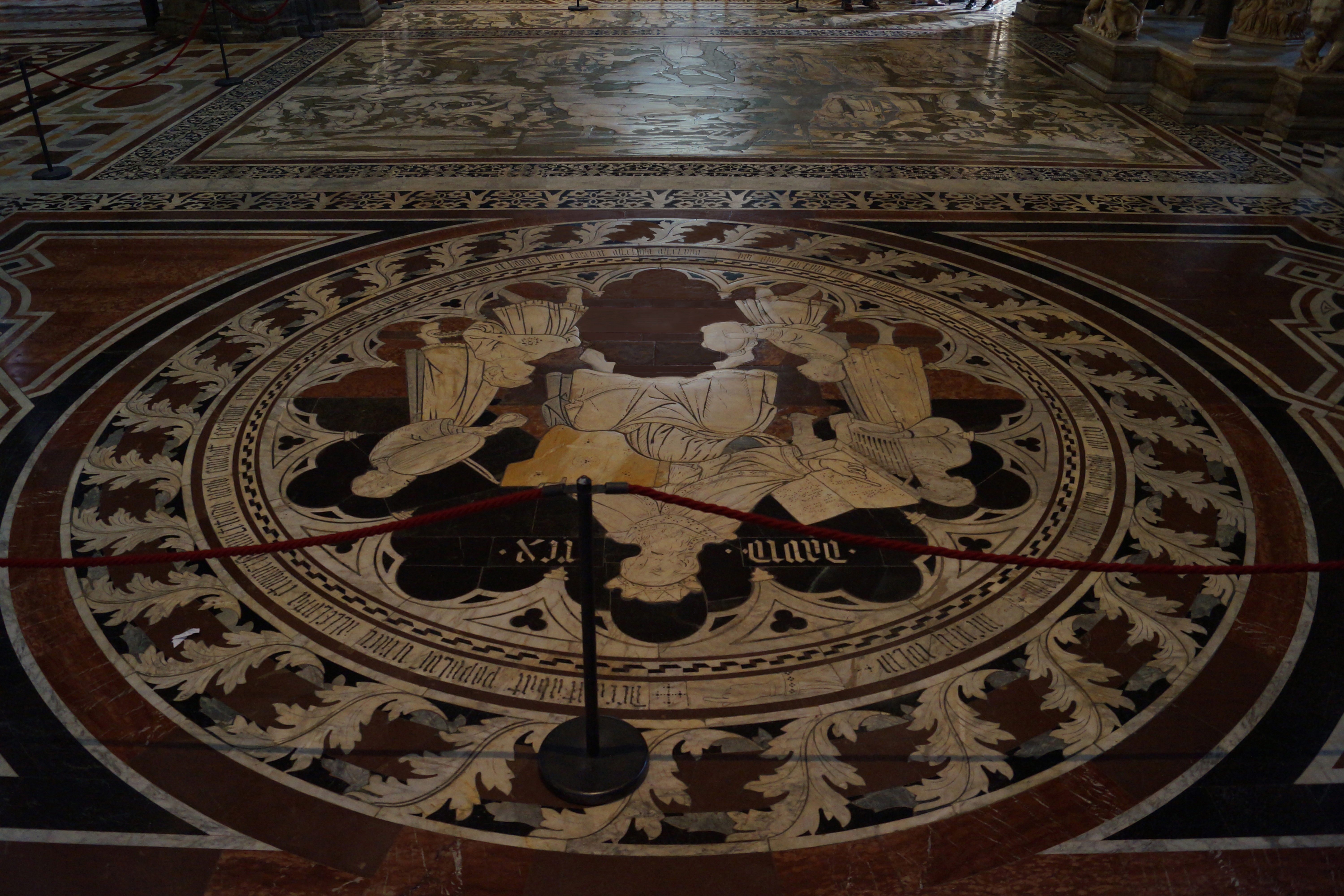 Великолепны инкрустации пола Собора, оценить в полной мере гениальный замысел которого ad maiorem gloriam dei (к вящей славе Божией) можно лишь представив себе, как выглядят эти творения с высоты ангельского полёта, от входа – к алтарю храма; в целях сбережения бесценных напольных картин большинство композиций практически постоянно защищено специальными панелями от истирания ногами и лиш один раз в году пол открывается взглядам посетителей во всей своей красе. Мозаичный пол объединяет множество сюжетов на различные темы: все начинается с мира язычников (Сиенская волчица, Сивиллы) и продолжается темой античных философов, затем напольные мозаики повествуют о сюжетах из Ветхого Завета, а затем на мозаичном полу появляется фигура Иисуса Христа.