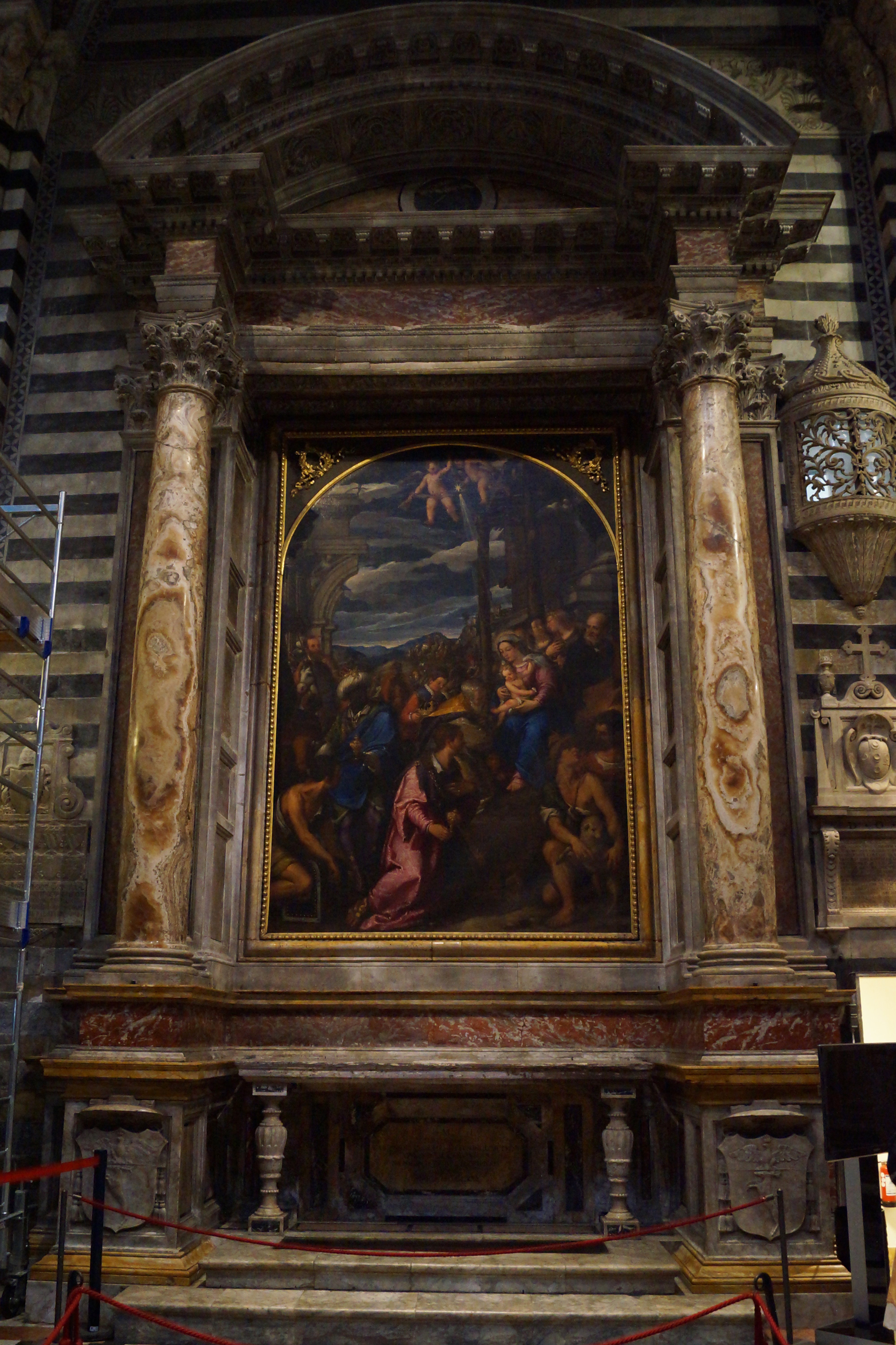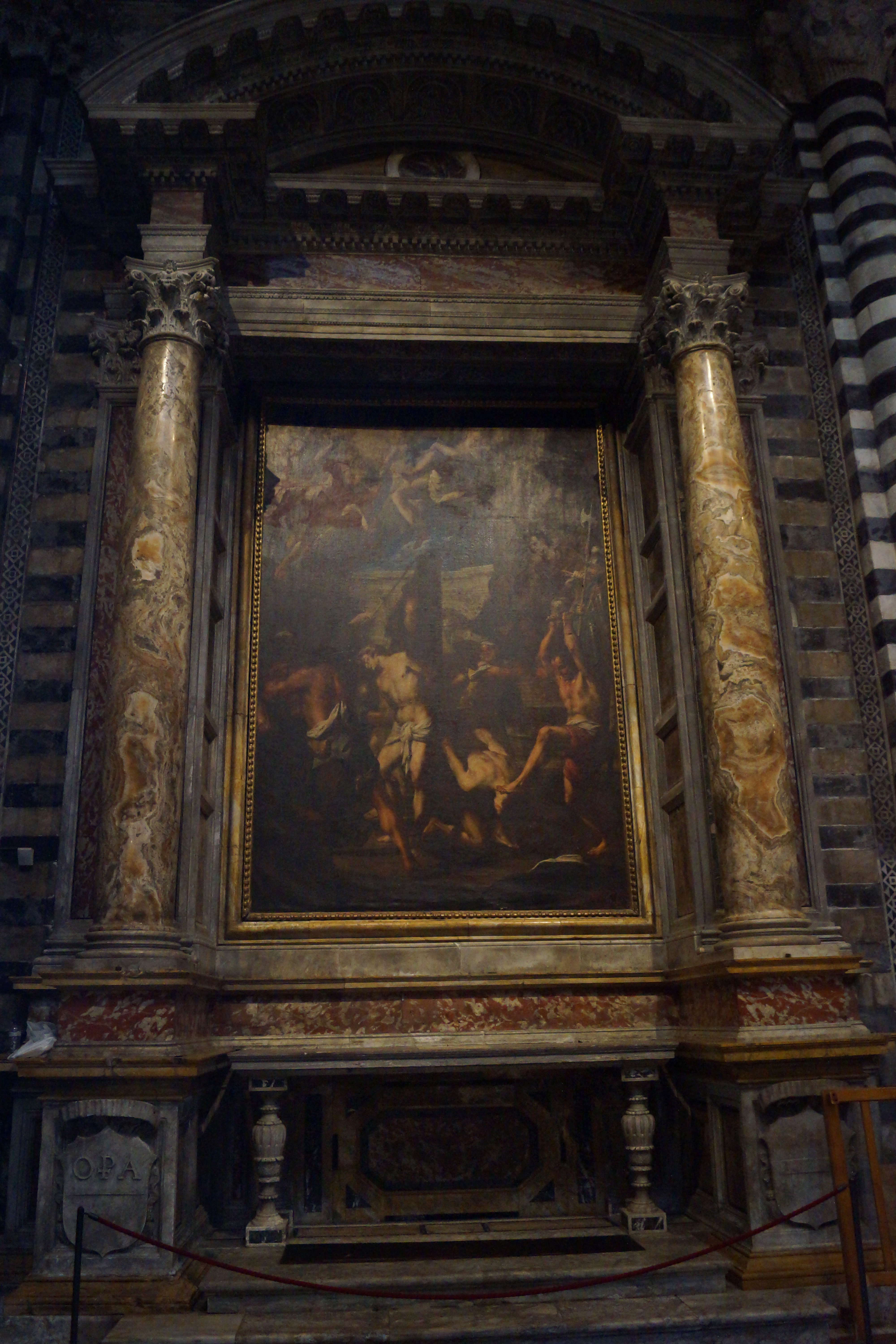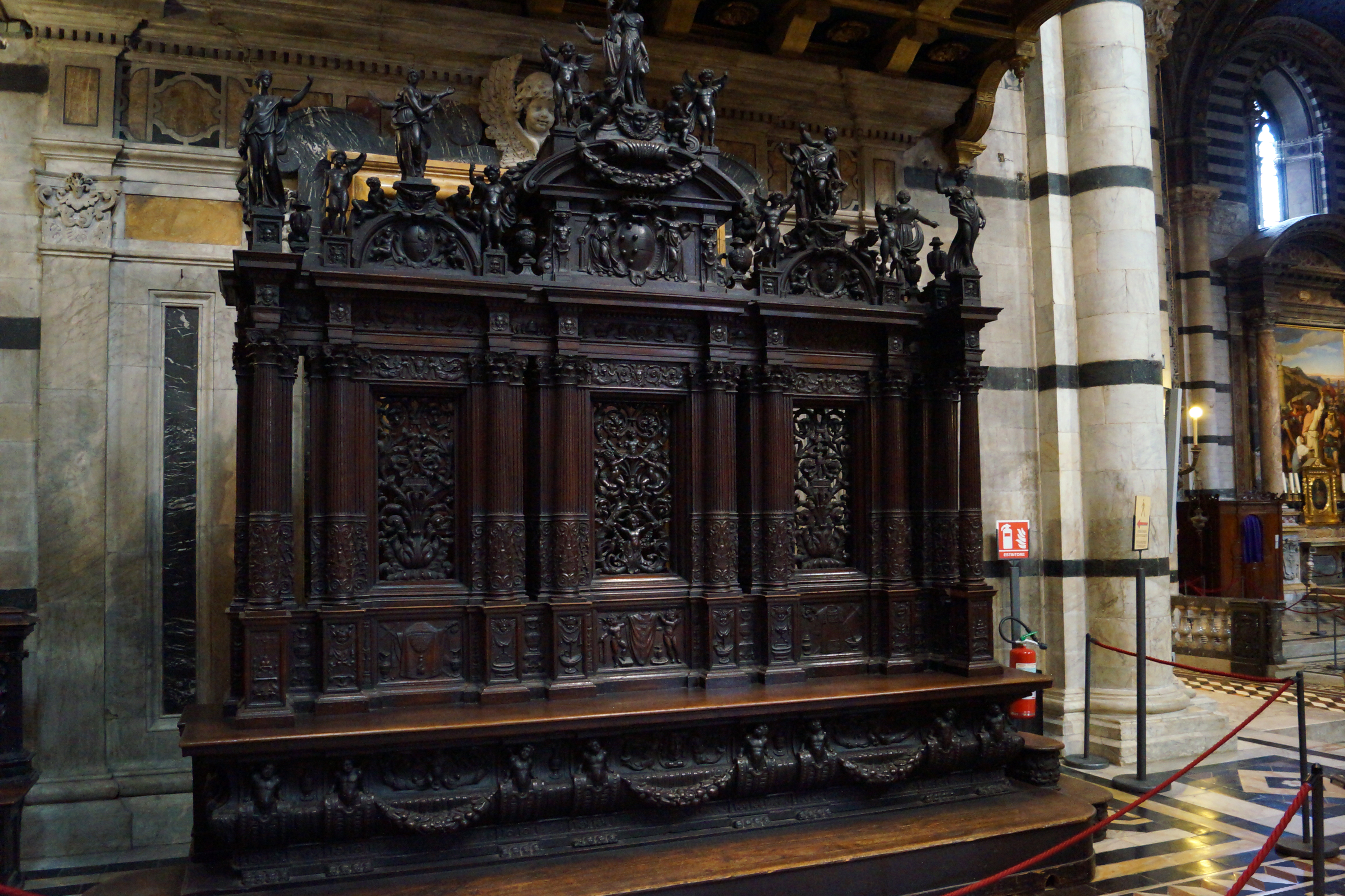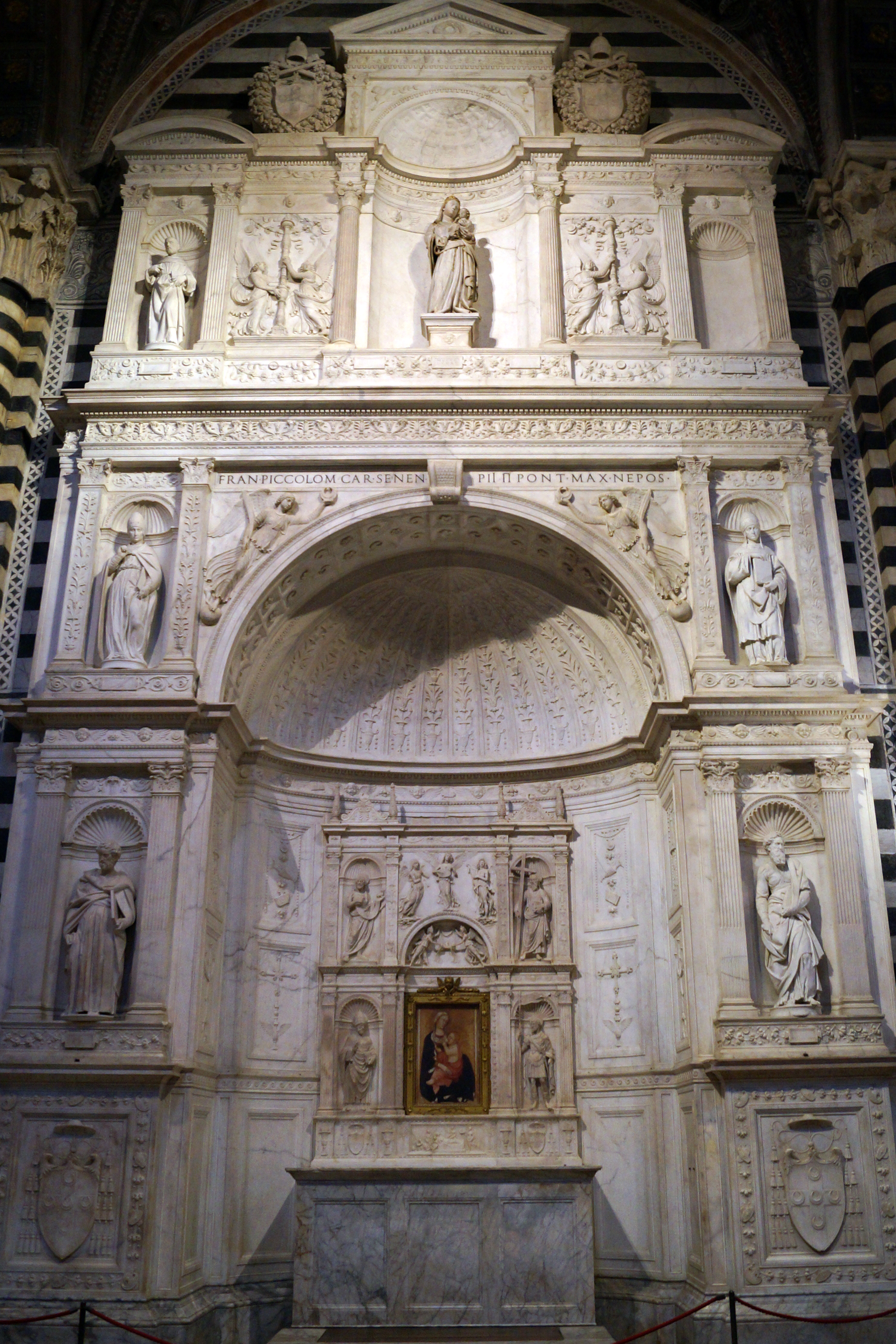 Рядом с входом в библиотеку Пикколомини находится грандиозный алтарь, созданный в 1481-1485 годах Андреа Бреньо, посвященный папе Пию ll, и в тоже время был призван прославлять все семейство Пикколомини, игравшее важную роль в политической и культурной жизни Сиены. Этот алтарь состоит из трех рядов ниш. Четыре статуи работы Микеланджело (святой Петр и святой Пий справа, и святой Григорий и святой Павел слева) установлены в нижнем ярусе в самом начале шестнадцатого века. В верхнем ярусе алтаря представлена скульптура "Мадонна с младенцем" (1397-1400), ранняя работа Якопо делла Кверча. Верхняя левая ниша алтаря пуста, поскольку Микеланджело так и не завершил предназначенную для неё статую святого Матфея.
