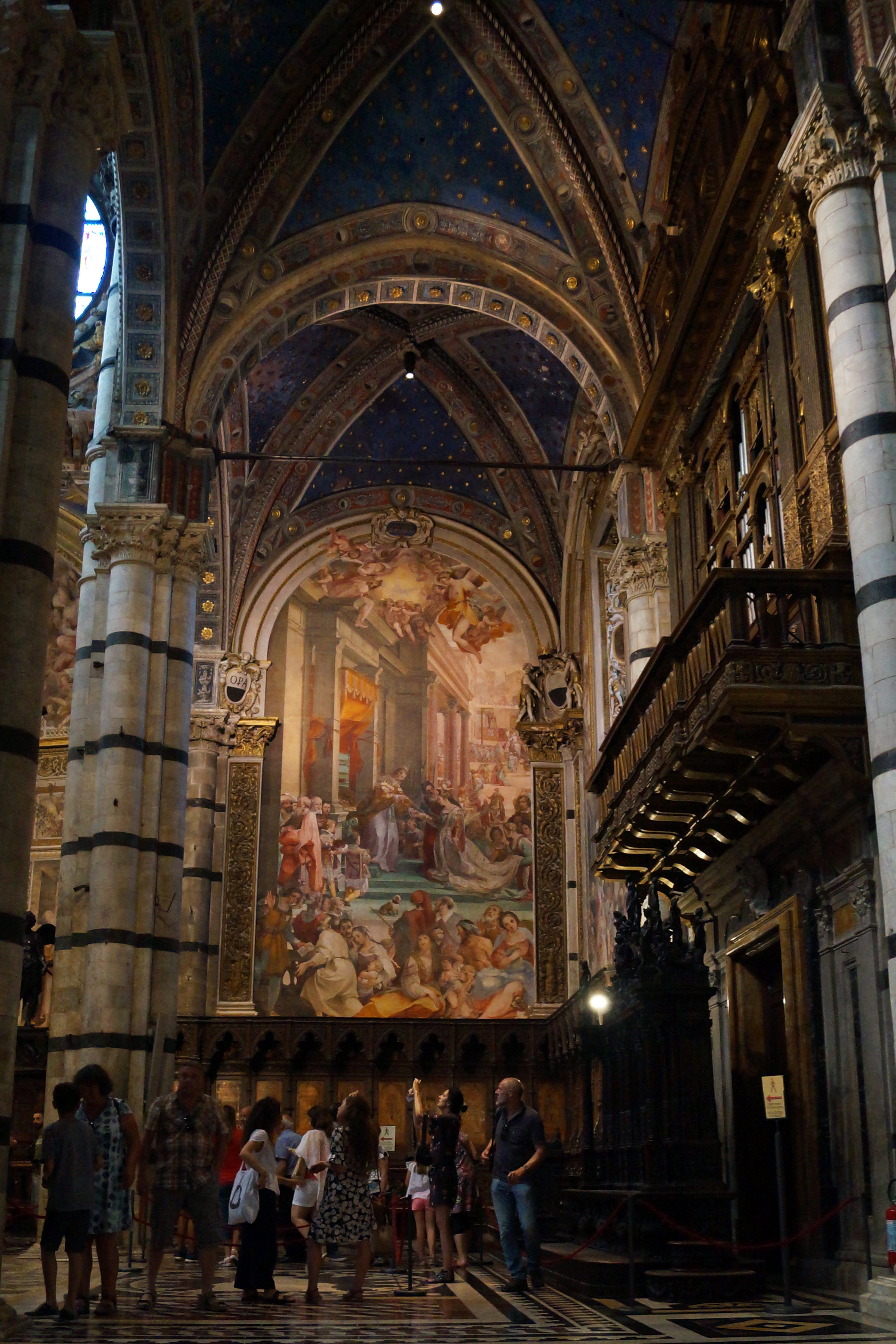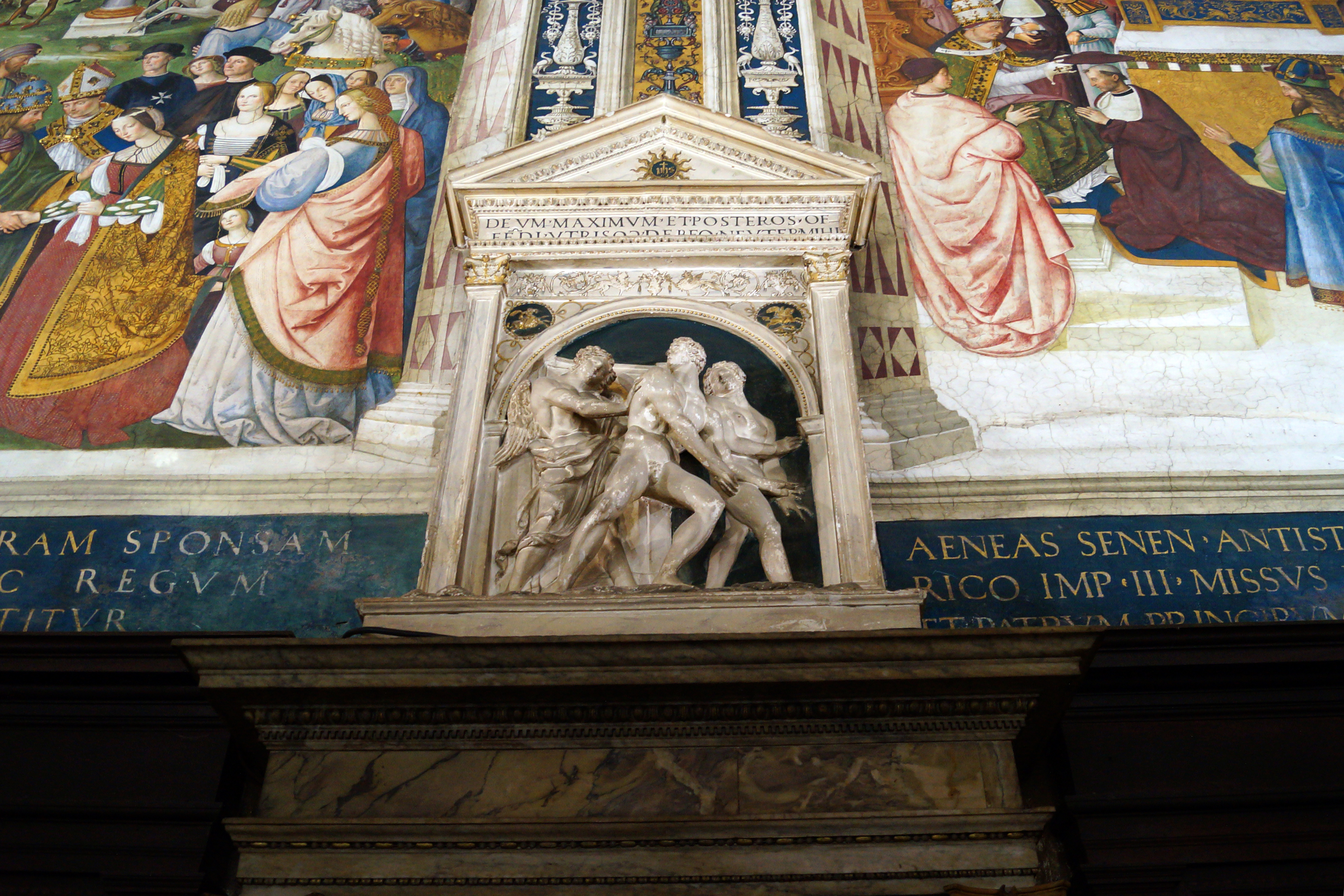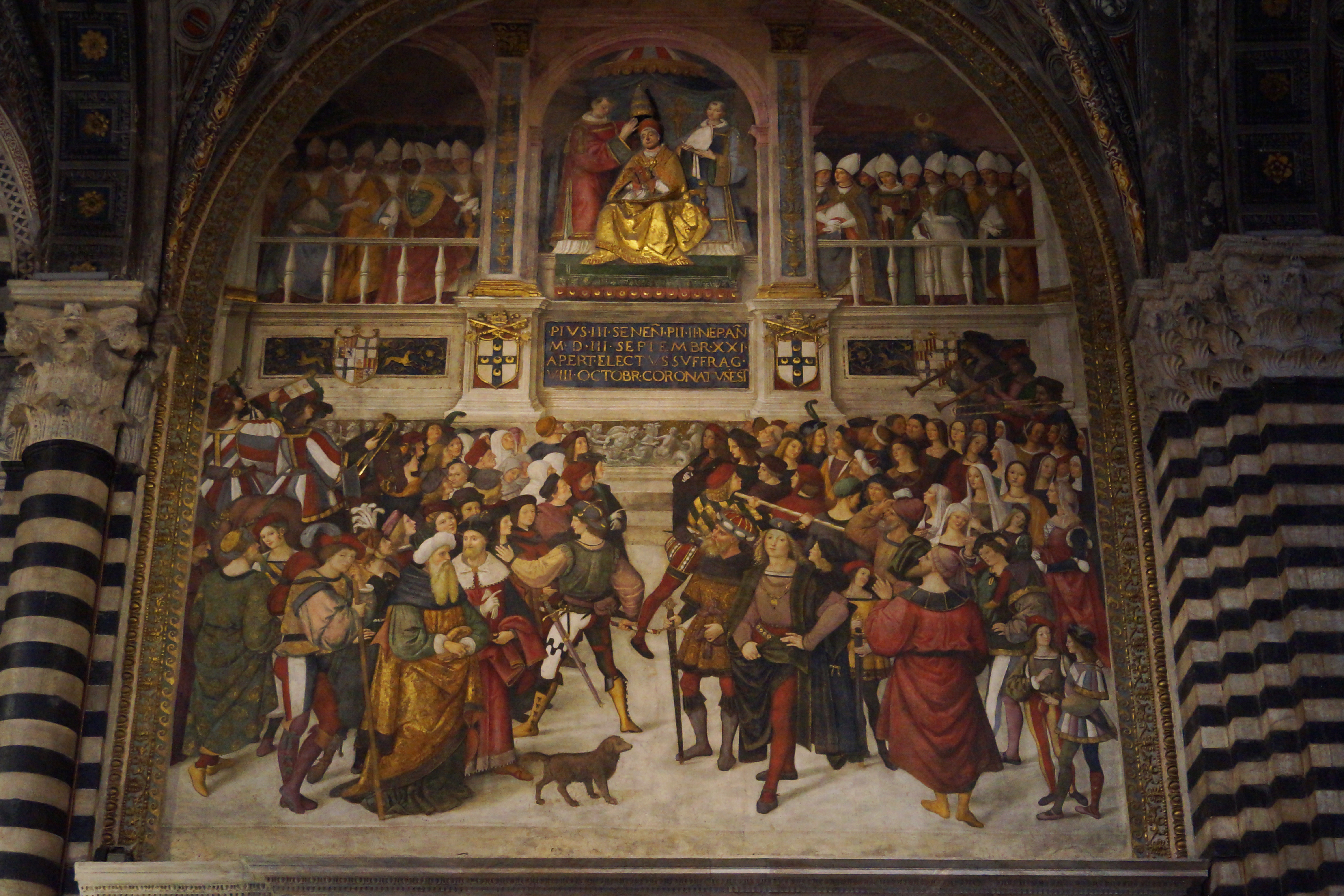На переднем плане изображена Коронация Пия III, фреска, которую заказали наследники Папы Римского, умершего в 1503 году всего через 26 дней после его избрания Папой, созданная в 1504 году Пинтуриккьо.